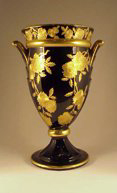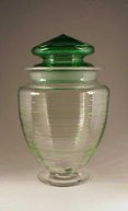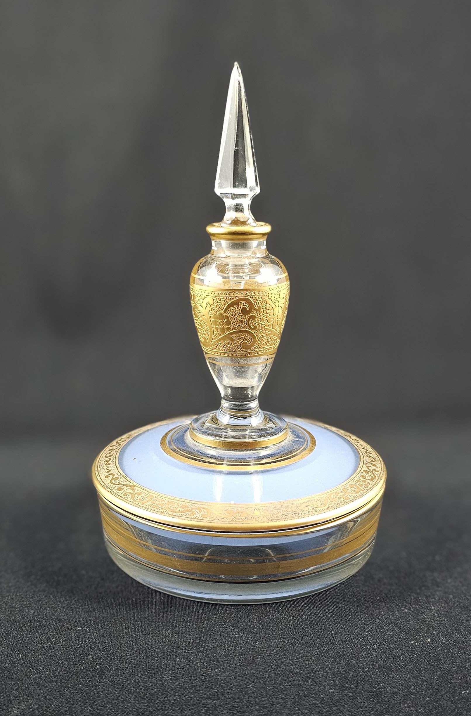 Fostoria perfume and powder box combination. Etched, Gold and Blue Enamel decorated. Very good condition, with little or no wear to the blue or gold enamel, but stopper rod is broken and its handle has small chips at the very peak. Stands 7 inches tall and 4.5 inches in diameter. Hard to find in this decoration and conditio... (more)