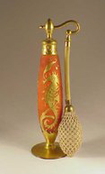 Beautiful DeVilbiss Perfume Atomizer and Dropper set from 1959 with "triplex" (3-layered) glass from West Germany's Wittig Glas company. Enameled hand-painted gold decoration with applied porcelain flower petals. Shown in DeGraaf-Mack DeVilbiss Perfume Bottles book, 282. Gold plated spray fitting. Both bottles In excellent ... (more)