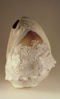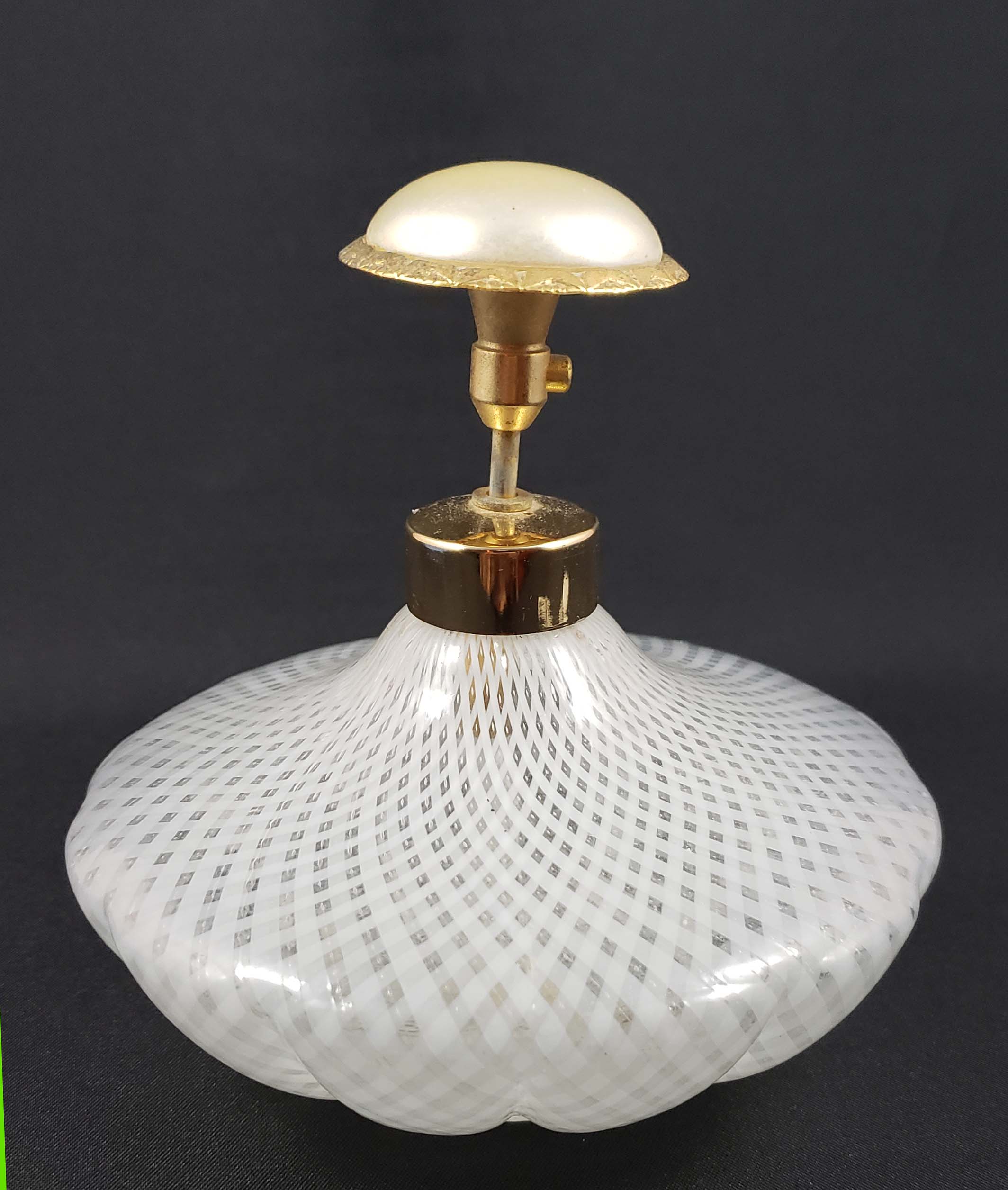 DeVilbiss perfume atomizer from 1959, catalog number S1000-32, as shown on page 282 of the DeGraaf-Mack DeVilbiss book. The glass bottle is a white-clear swirl design known as Latticino, a glass-making technique made famous by the renowned Murano, Italy house of Toso, which made this bottle. The atomizer spray fitting is to... (more)