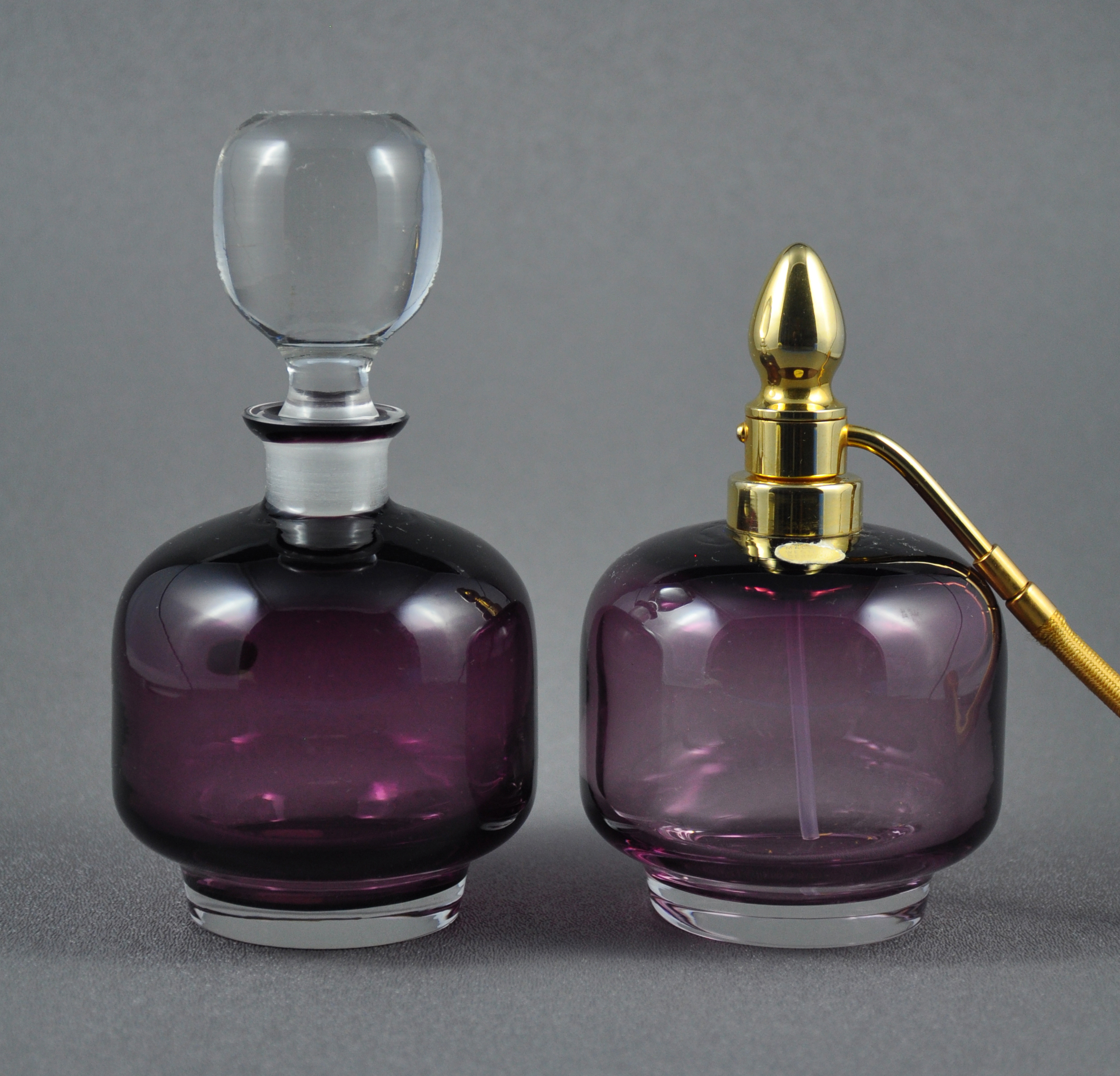 Beautiful DeVilbiss Perfume Atomizer and Dropper set from 1964. DeVilbiss catalog number 1750-26. Amethyst colored glass from West Germany's Hessen Glaswerke company (Original "Made in Western Germany" sticker) . Shown in DeGraaf-Mack DeVilbiss Perfume Bottles book, 295. Gold plated spray fittings. Both bottles in excellent... (more)