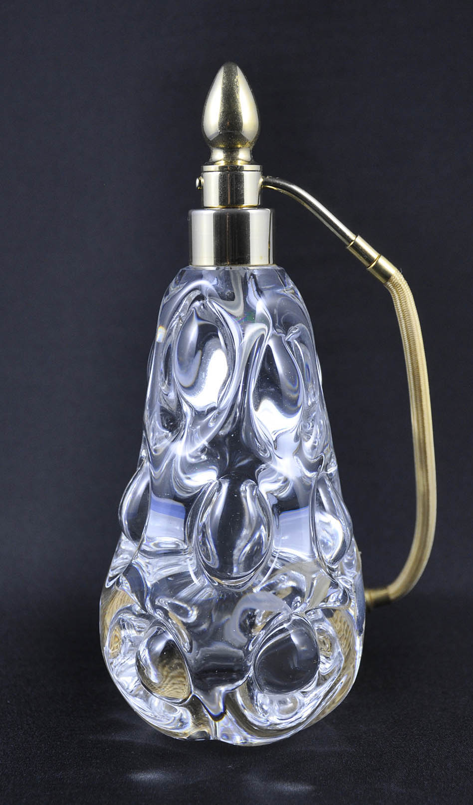 Beautiful DeVilbiss Perfume Atomizer from 1965, catalog number 2000-19. Very heavy sham clear glass in "coin dot" form. Bottle by Waltersperger Cristalleries, a fine French glassmaker. Shown in DeGraaf-Mack DeVilbiss Perfume Bottles book, page 296. Gold plated spray fittings. In excellent condition - bulb and cord have bee... (more)
