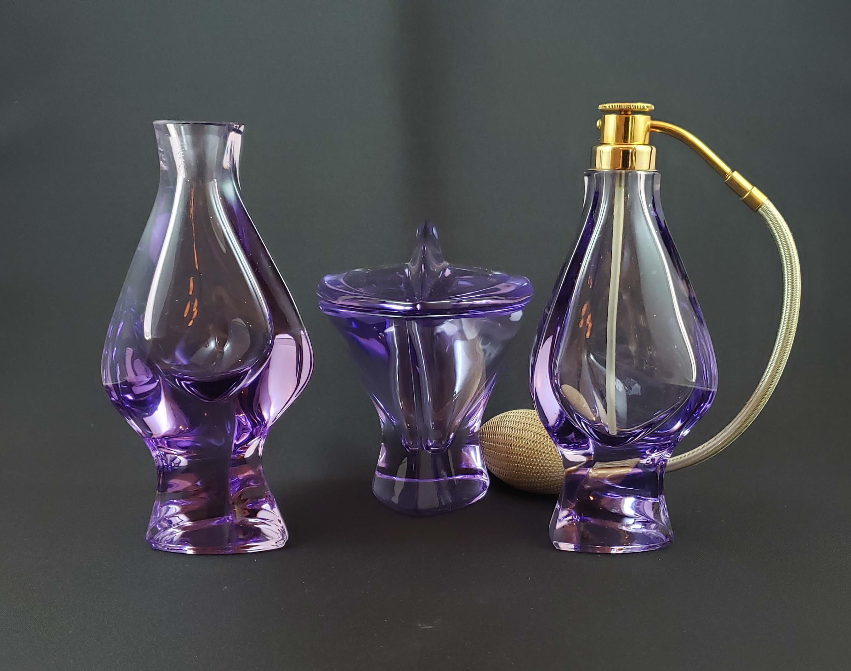 Beautiful Mid-century DeVilbiss Perfume Atomizer Dresser Set from 1959. Atomizer and Covered Powder Jar, with Cologne minus stopper which is perfect as a bud vase. DeVilbiss catalog number S2500-3. Delicate heather colored amethyst glass from West Germany's Hessen Glaswerke company. Shown in DeGraaf-Mack DeVilbiss Perfume B... (more)