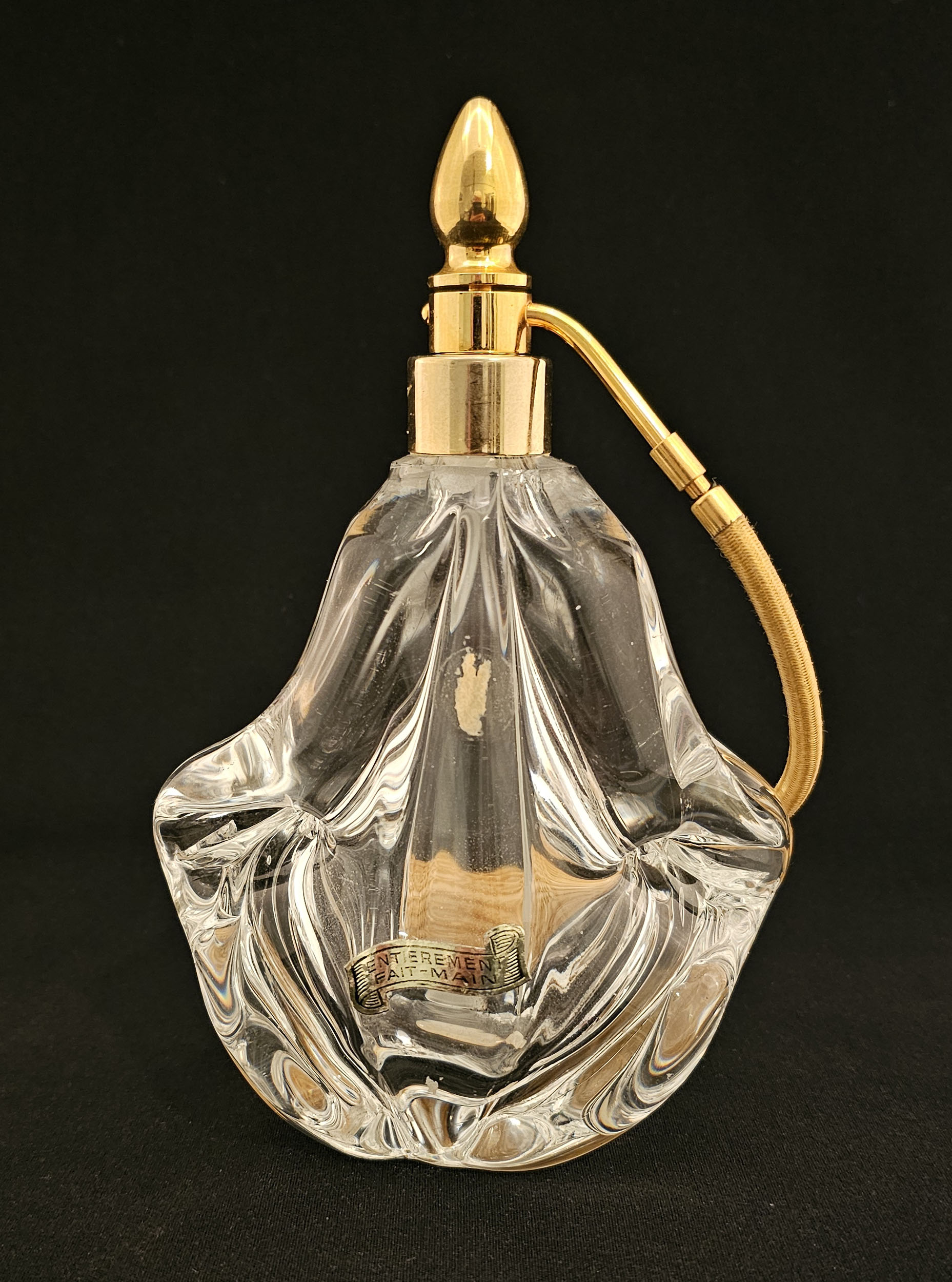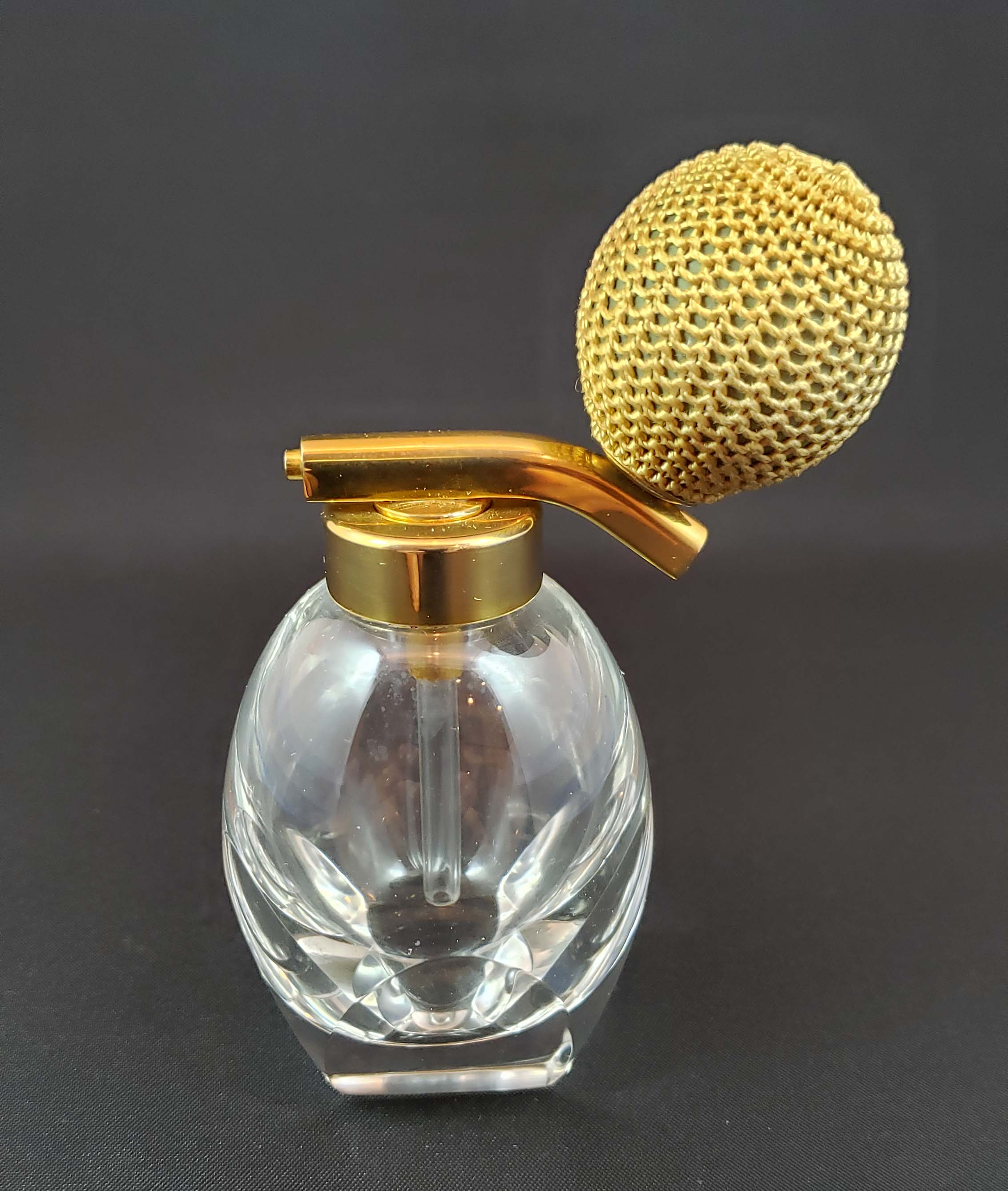 DeVilbiss Perfume Atomizer, Mid Century Modern from DeVilbiss 1968 catalog. Heavy Crystal Bottle by Waltersperger, France - a very high quality glassmaker. Never used and in mint condition. DeVilbiss model 2000-23 from their 1968 catalog. DeVilbiss label on bottom, gold foil Waltersperger label "Entierement Fait Main" (enti... (more)