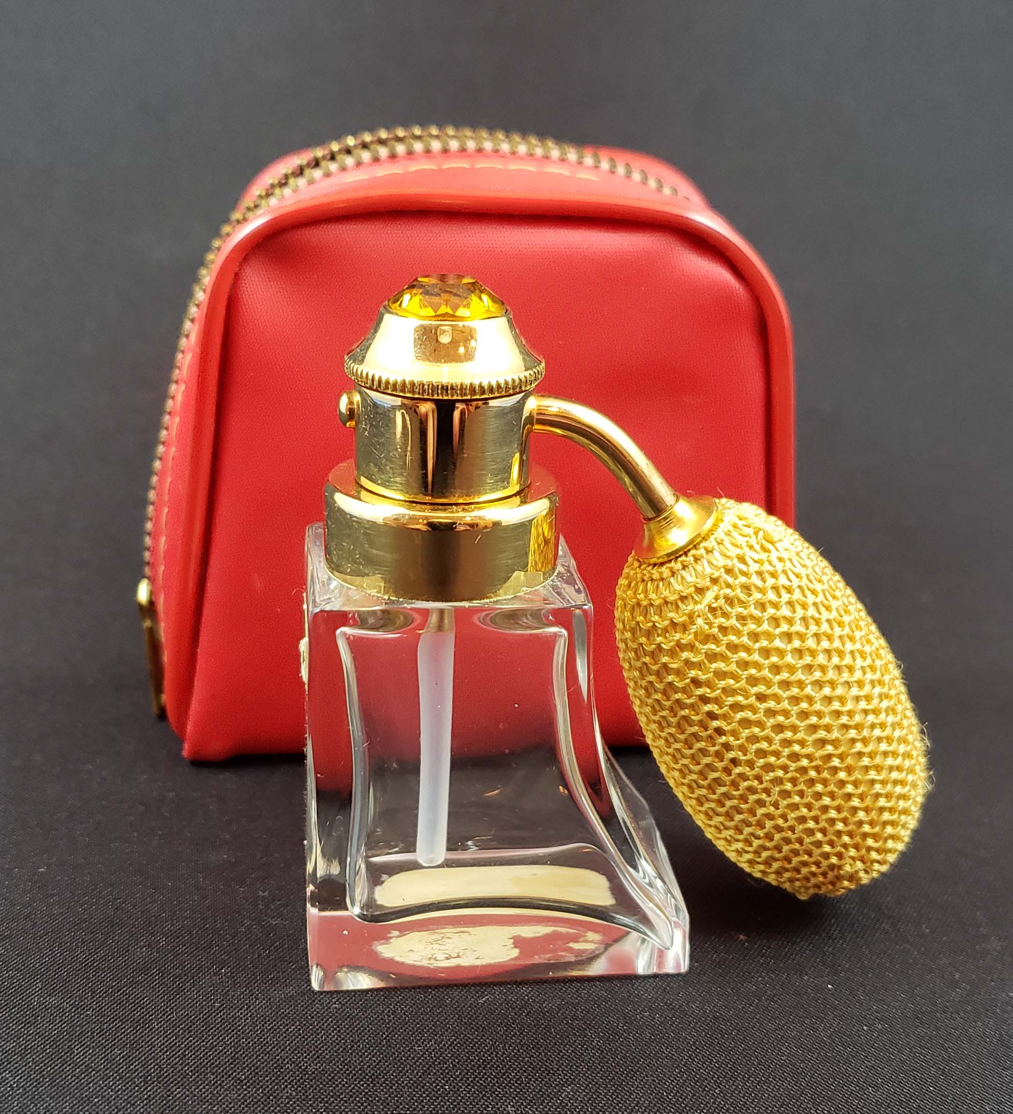 DeVilbiss Perfume Atomizer in Travel Case from 1953. Red nylon zippered case for traveling. Gold plated atomizer fitting with amber jewel. Original factory stickers. In excellent like-new condition. 3 inches tall. ... (more)
