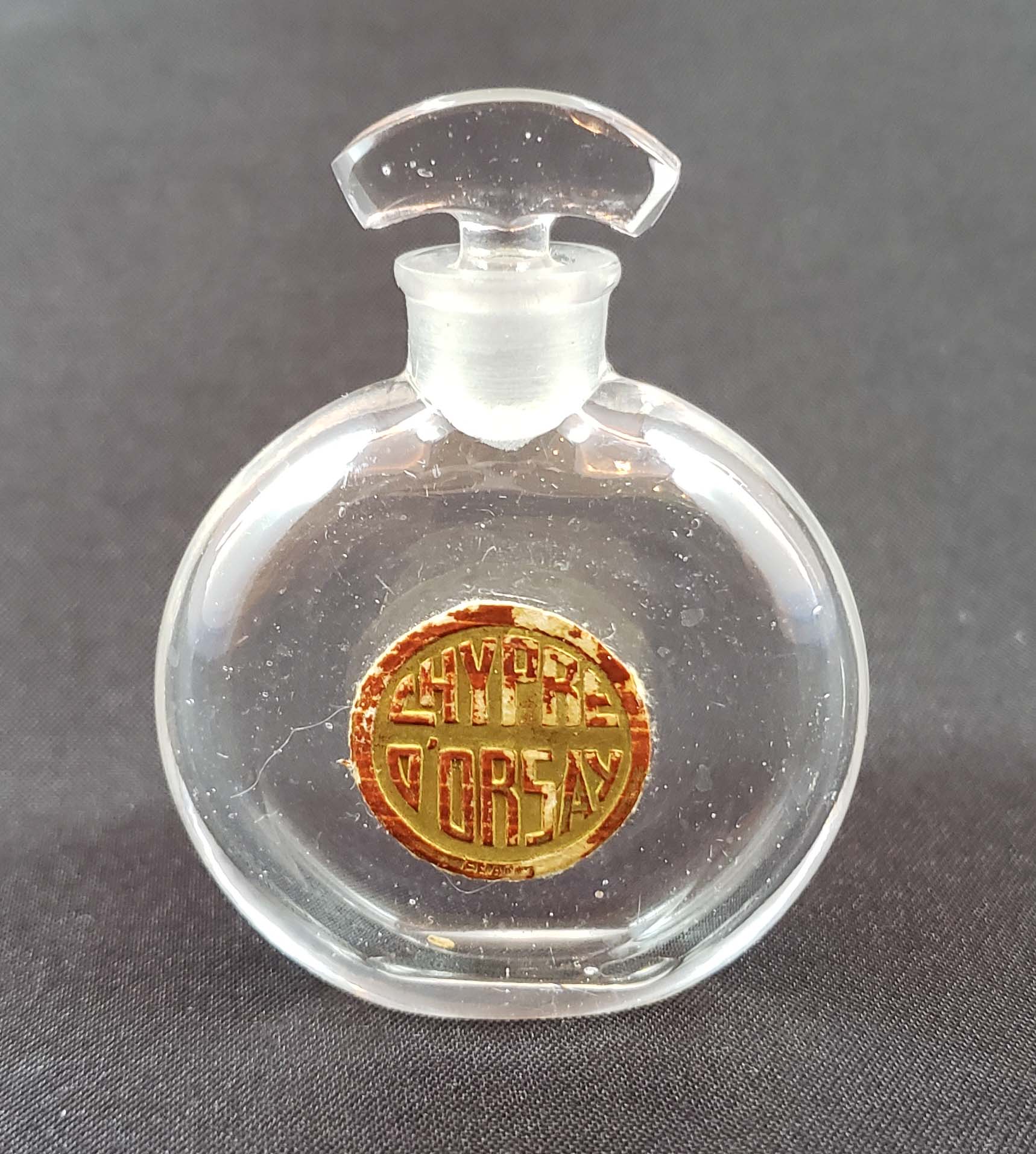 Exquisite and RARE mini Chypre perfume bottle by D'Orsay. In fine lined leather purse case marked "D'Orsay Parfumeur 17 Rue de la Paix Paris", circa 1915. Hand polished high-quality glass with glass stopper - all in excellent condition - no chips or scratches. The red and gold label shows light wear. Bottle is 2 1/4 inches ... (more)