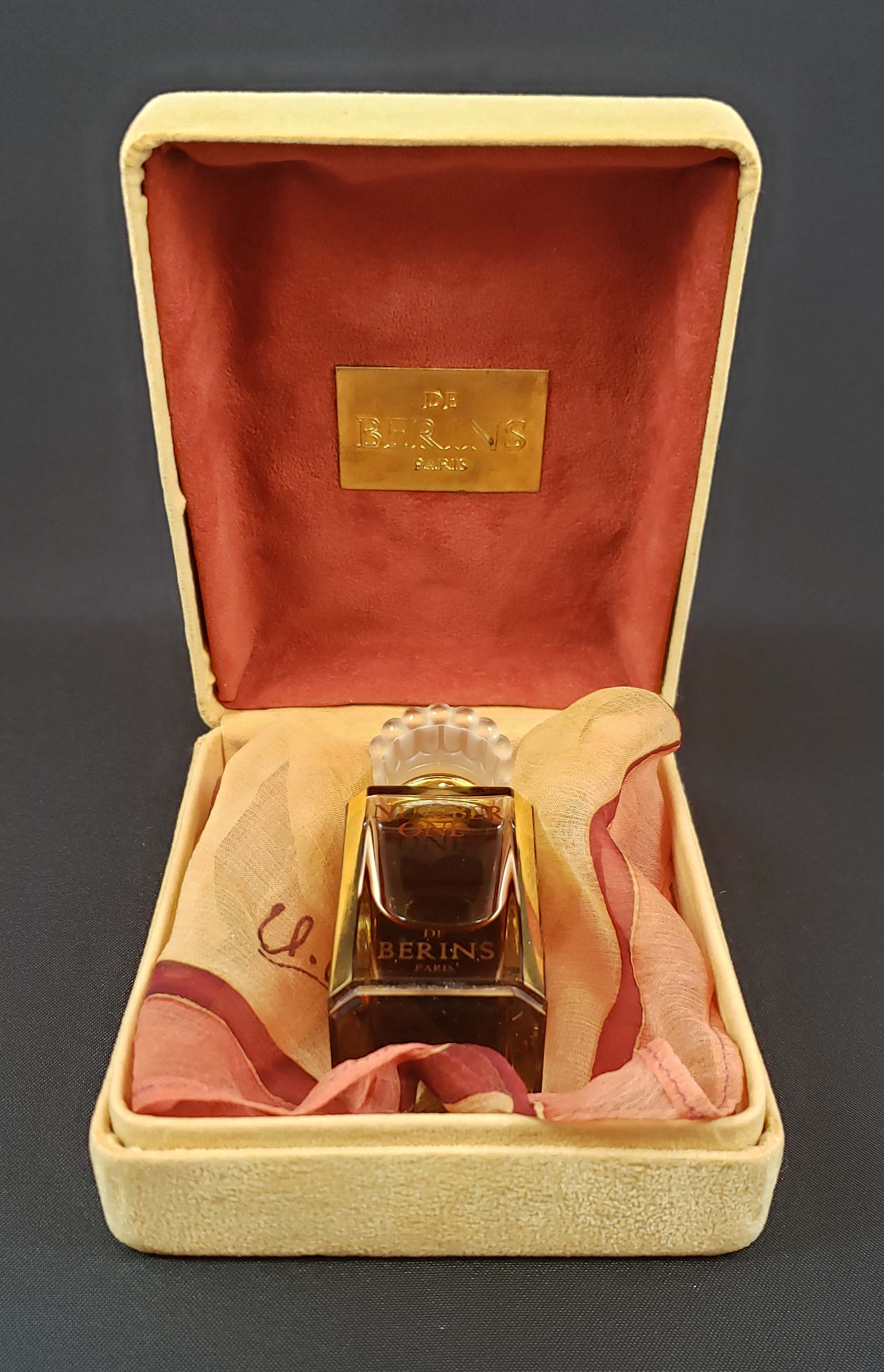 RARE Vintage Number One de Berins perfume, sealed and in presentation box, circa 1973. The bottle is beautifully hand faceted and polished with a frosted stopper in the form of a crown, and is marked "Made in France" in acid on the bottom. The presentation box is a fine, padded satin covered package with a gold crown affixe... (more)
