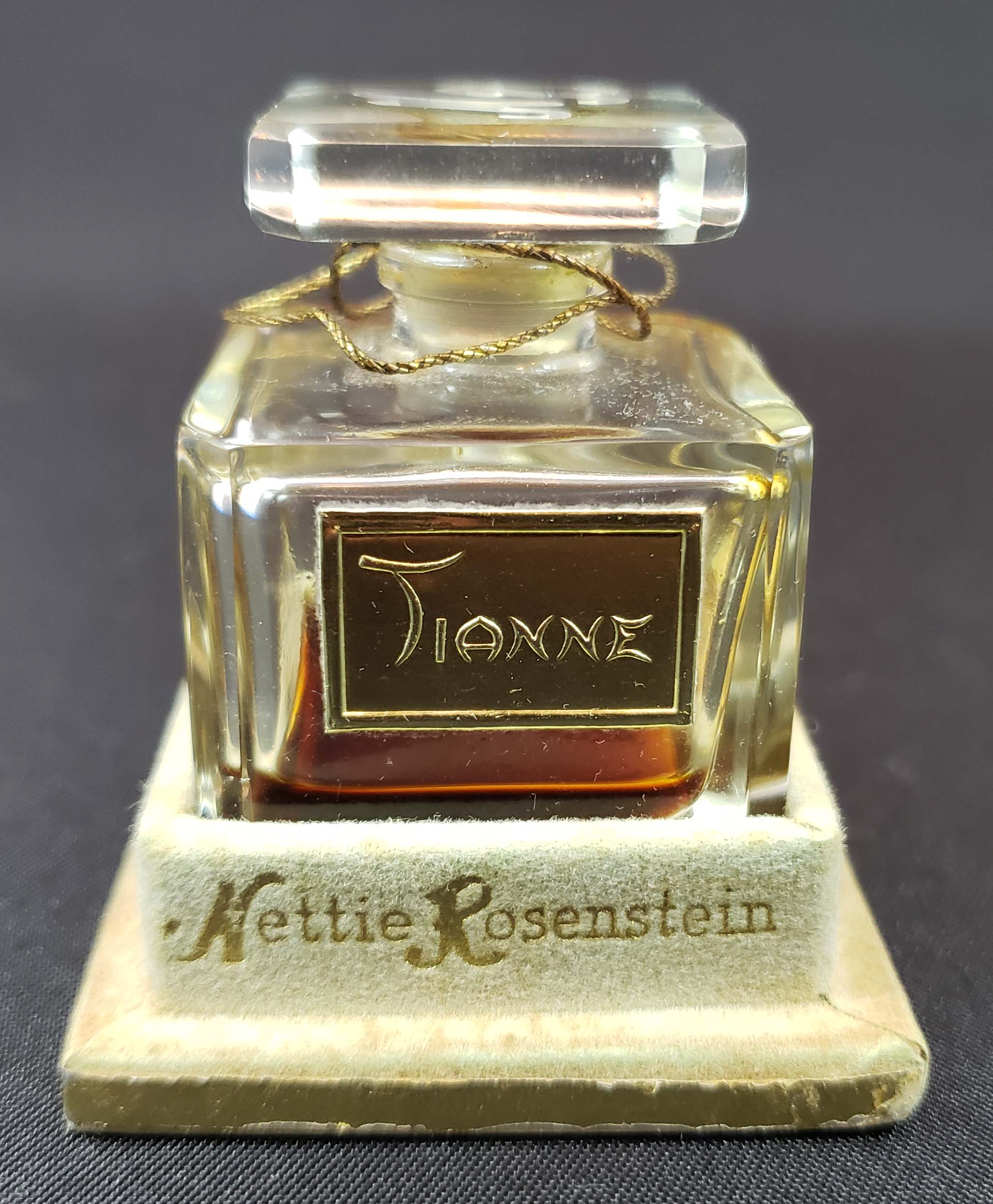 Tianne Perfume by Nettie Rosenstein from the late 1940s. In original box. Finely crafted clear faceted bottle. Initials "NR" in intaglio engraving on the top of the stopper. Box shows light wear. One-half fluid ounce bottle stands 2 inches high; the box is 2 1/2 inches.... (more)