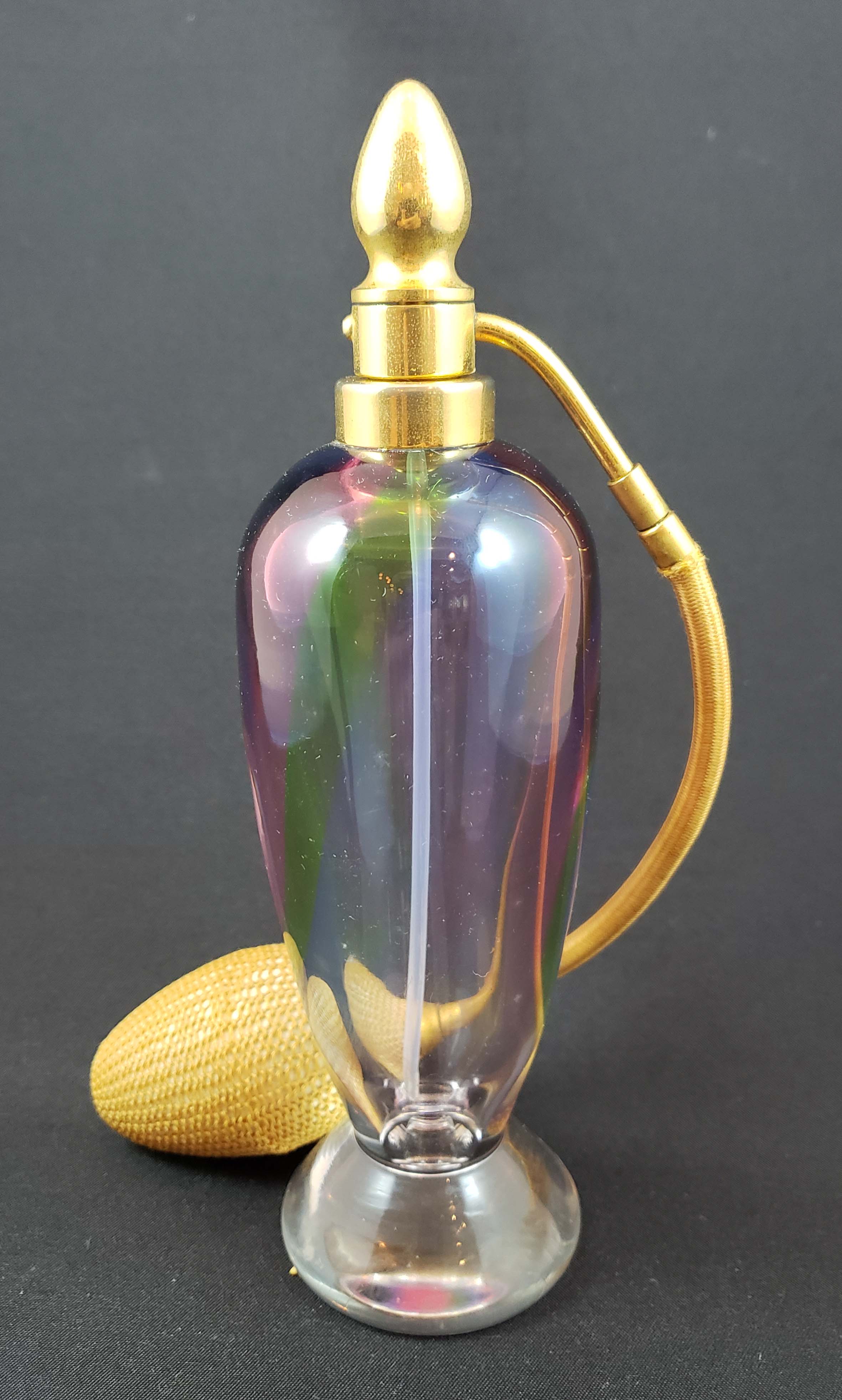 Beautiful Tall DeVilbiss Perfume Atomizer Mid-century Modern from 1965. Stunning multi-color "rainbow glass" shading from green to orchid to blue, with a clear glass foot. Gold plated spray fittings. In excellent condition - bulb and cord are original. No chips, cracks or scratches. Height 7 1/2 inches.... (more)