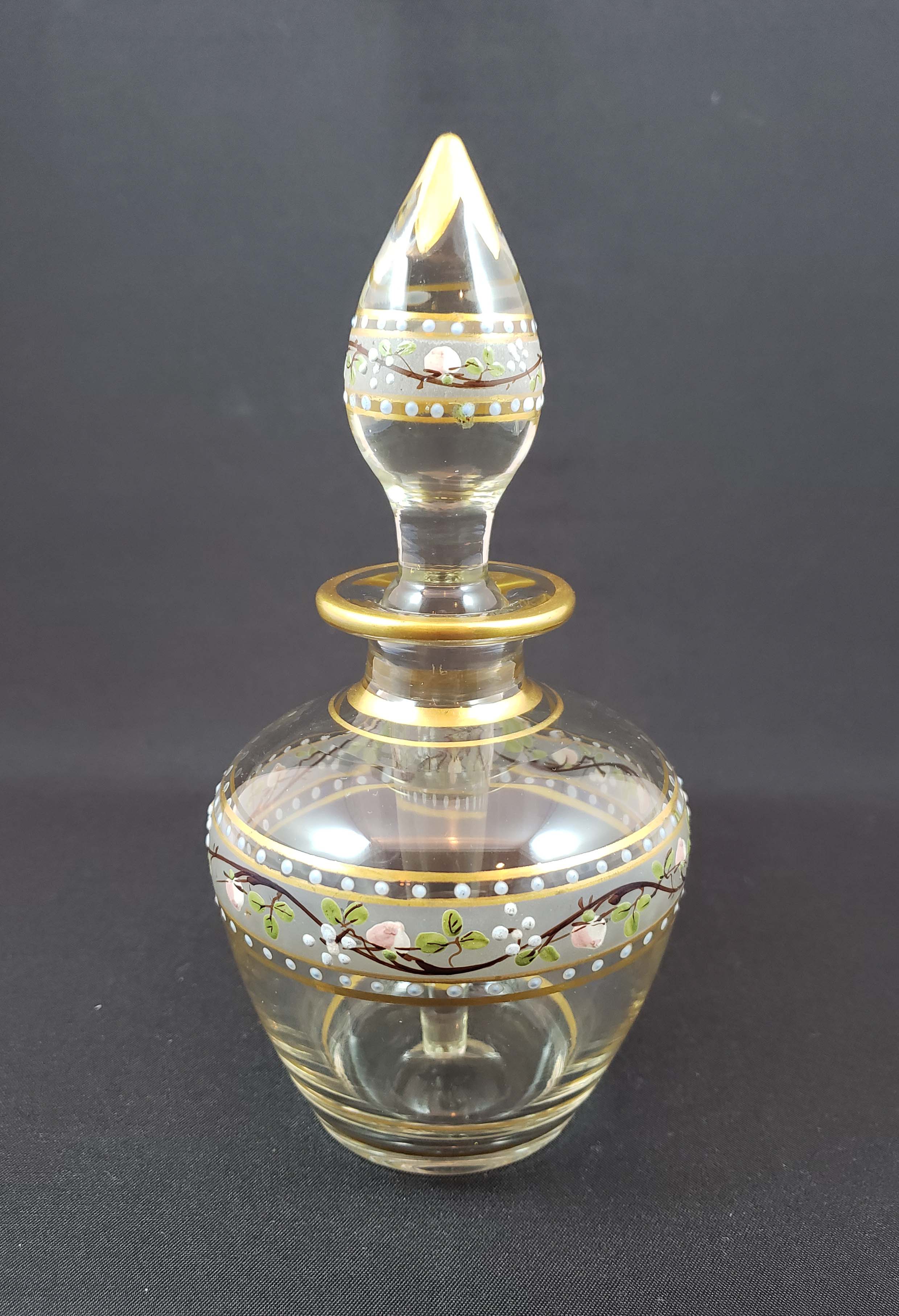 Lovely and very fine perfume dropper bottle with gold and floral enamel decoration and numbered stopper with corresponding number on bottle's neck. Likely from 1930's. Beautifully polished-in stopper. The gold decoration is in mint condition, and the bottle is in excellent condition with no chips or scratches in the glass o... (more)