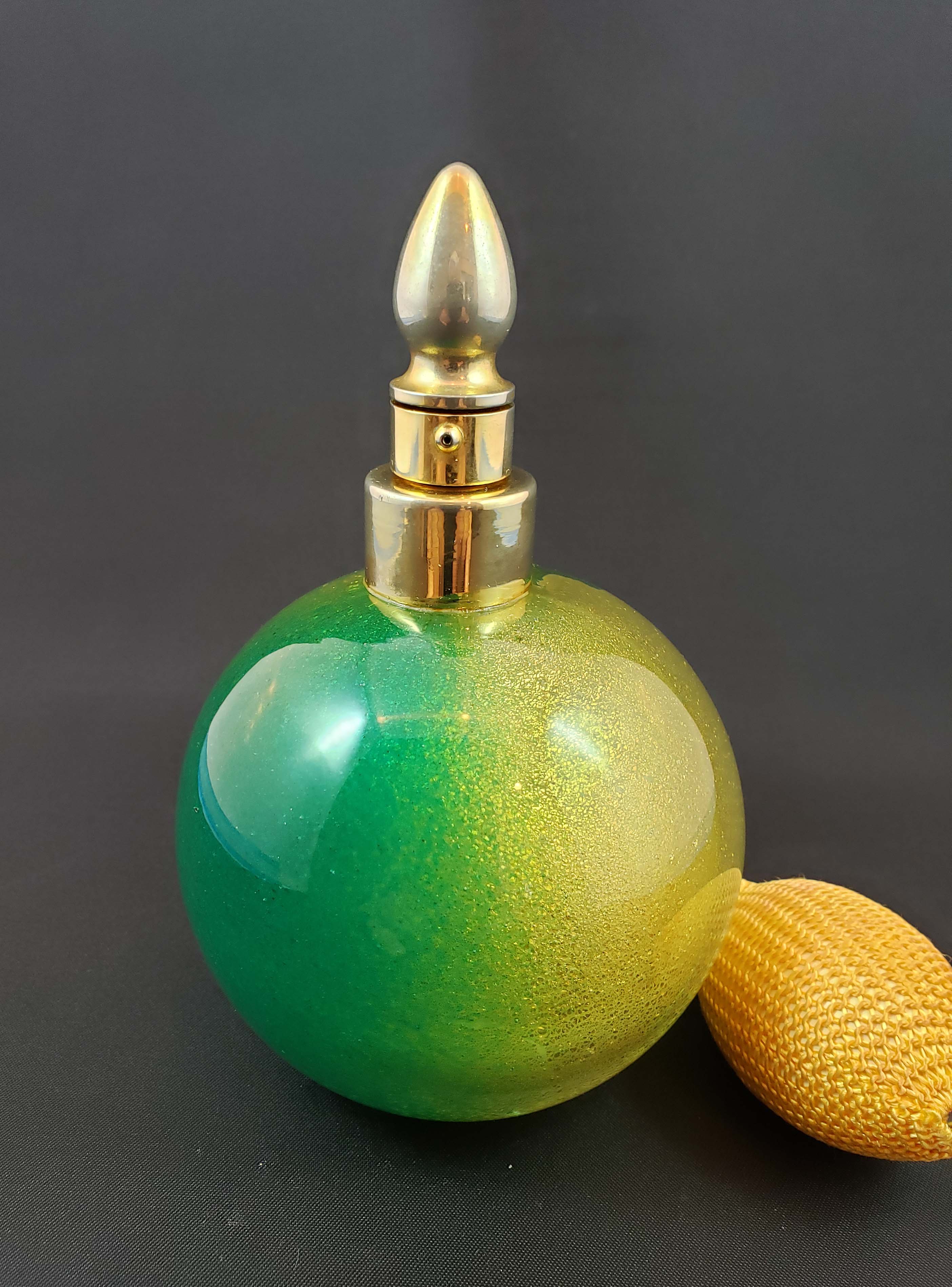 Beautiful DeVilbiss Perfume Atomizer from 1967, catalog number 1500-65. Heavy sham glass in spherical form with green and gold Aventurine glass - green and gold flecks on the interior layer. Bottle by renown Murano, Italy master glass-maker Archimede Seguso. Shown in DeGraaf-Mack DeVilbiss Perfume Bottles book, page 287. G... (more)