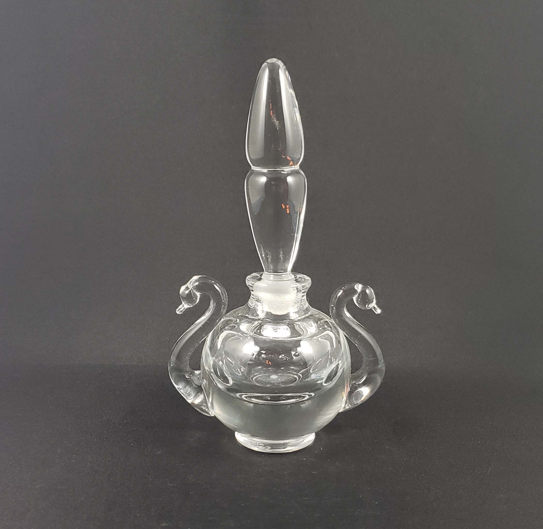 Lovely Cologne or Perfume bottle by New Martinsville Glass Co. Brilliant and very clear crystal heavy sham bottle with two graceful swan figures attached as handles. Heavy ground in dropper stopper. 6 3/4 inches tall to top of stopper. Excellent condition with a very small chip on the bottom of the stopper as shown. ... (more)