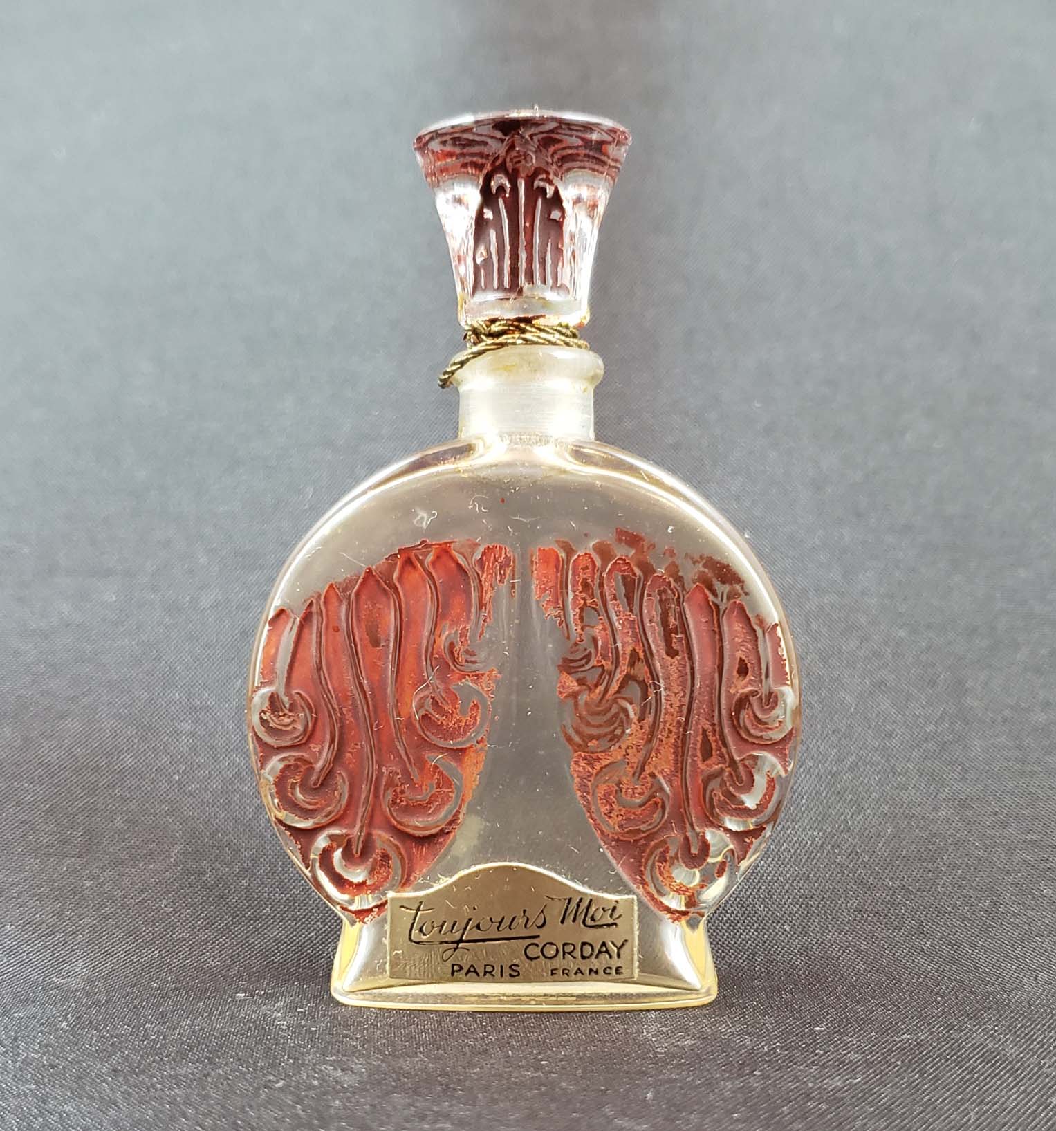 Tonjours Moi Corday Perfume Bottle - very fine French art glass bottle with red patina in the design both on the bottle and stopper - from 1920s. The bottle has a polished bottom with "Corday Bottle Made in France" acid stamped. Gold foil label is in excellent condition. No chips or scratches. The bottle is 3 inches tall to... (more)