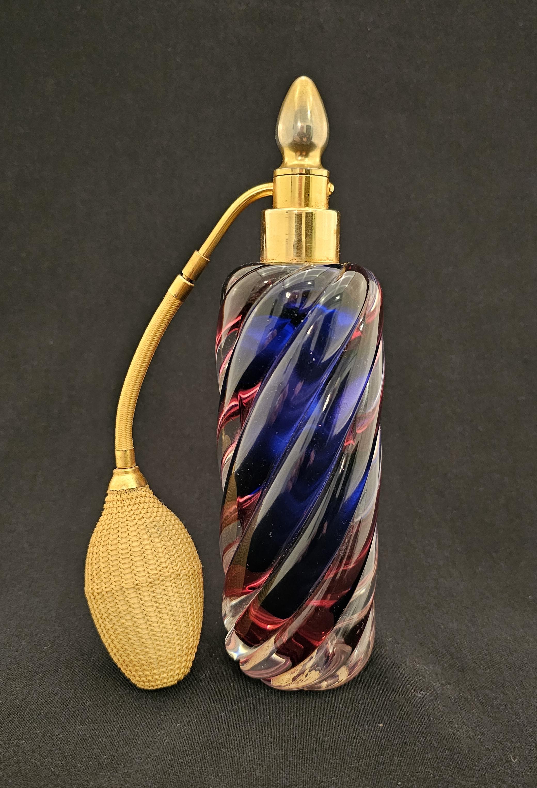 Gorgeous and hard-to-find MCM DeVilbiss perfume atomizer. Bottle made with Sommerso technique with crystal over red and blue layers in a twist construction. Glass is by Archimede Seguso, Murano Italy glass master, from 1964. Gold plated fittings with closure mechanism. In excellent condition, with original ball and cord, pl... (more)