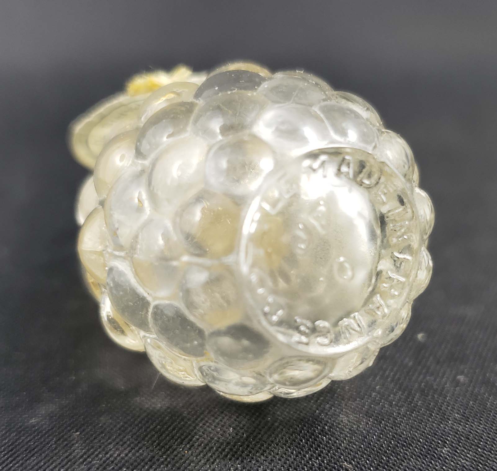 Jean Patou (Paris) Amour, Amour Perfume Bottle Mini with label. Hard to find. "JP" and "Bottle Made in France" in the mold on the bottom. Original label is attached with silk cord. In excellent condition but stopper is stuck. 2 inches tall.