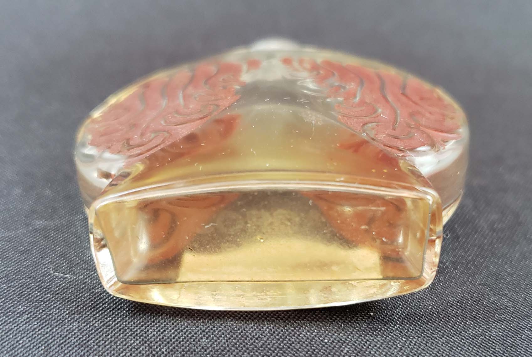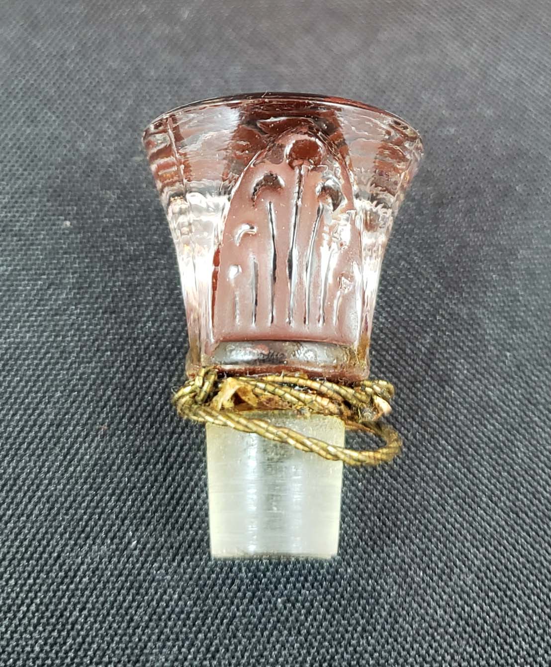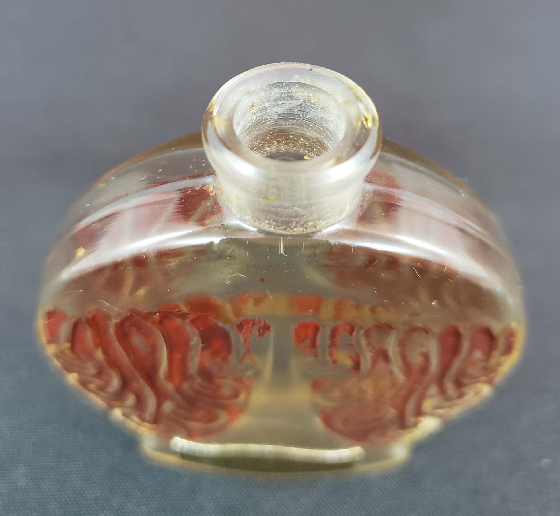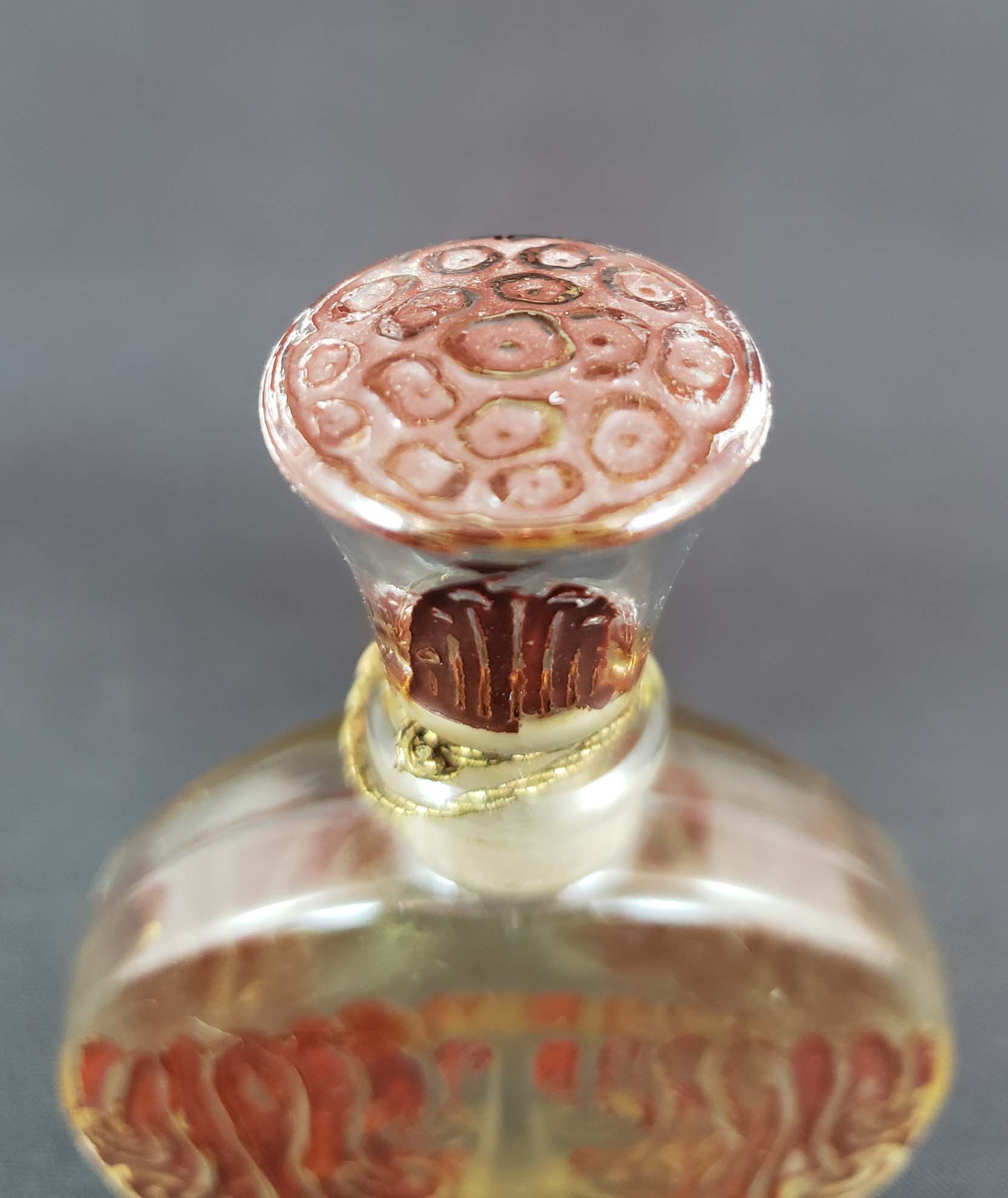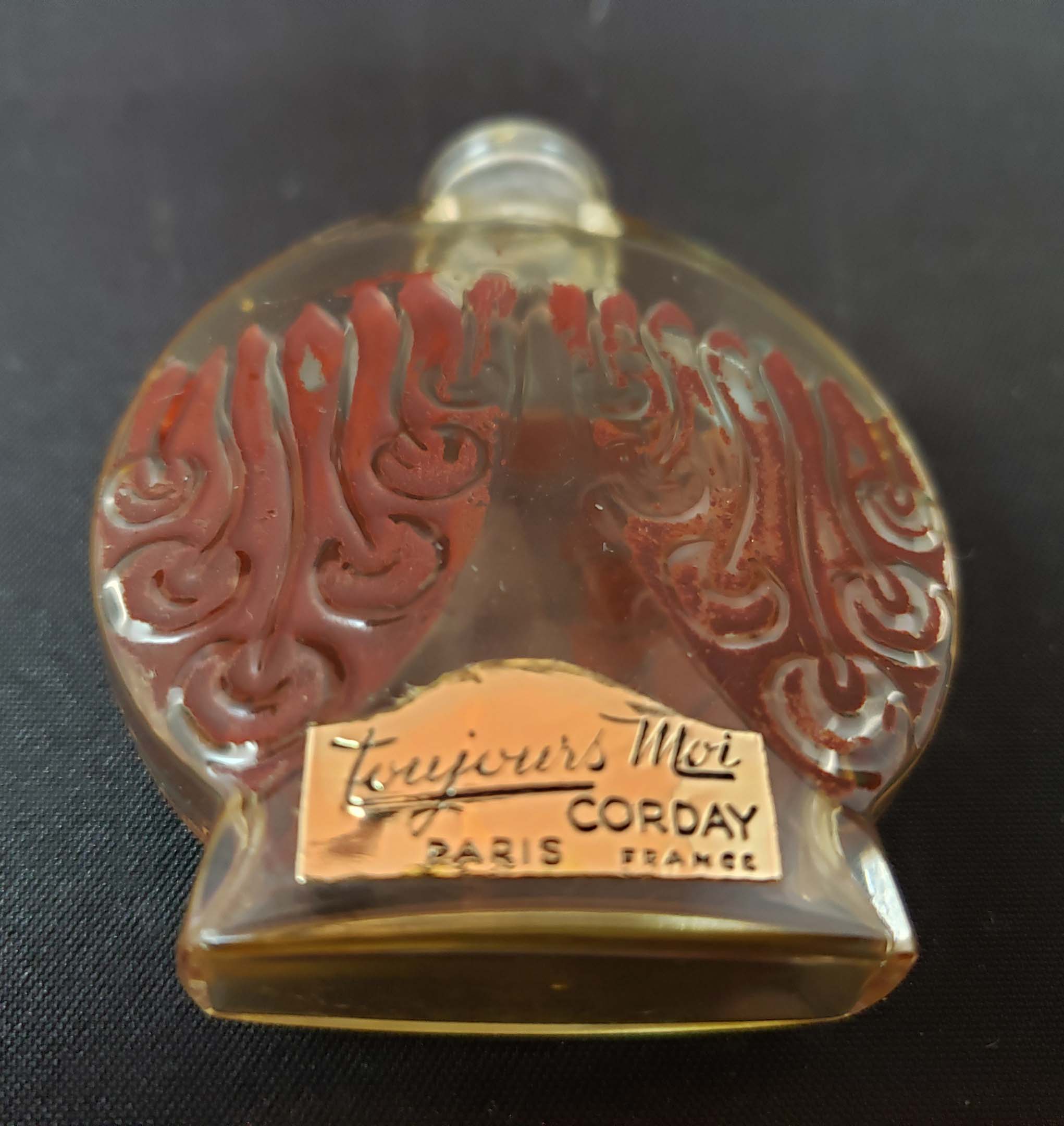 Tonjours Moi Corday Perfume Bottle - very fine French art glass bottle with red patina in the design both on the bottle and stopper - from 1920s. The bottle has a polished bottom with "Corday Bottle Made in France" acid stamped. Gold foil label is in excellent condition. No chips or scratches. The bottle is 3 inches tall to top of stopper.