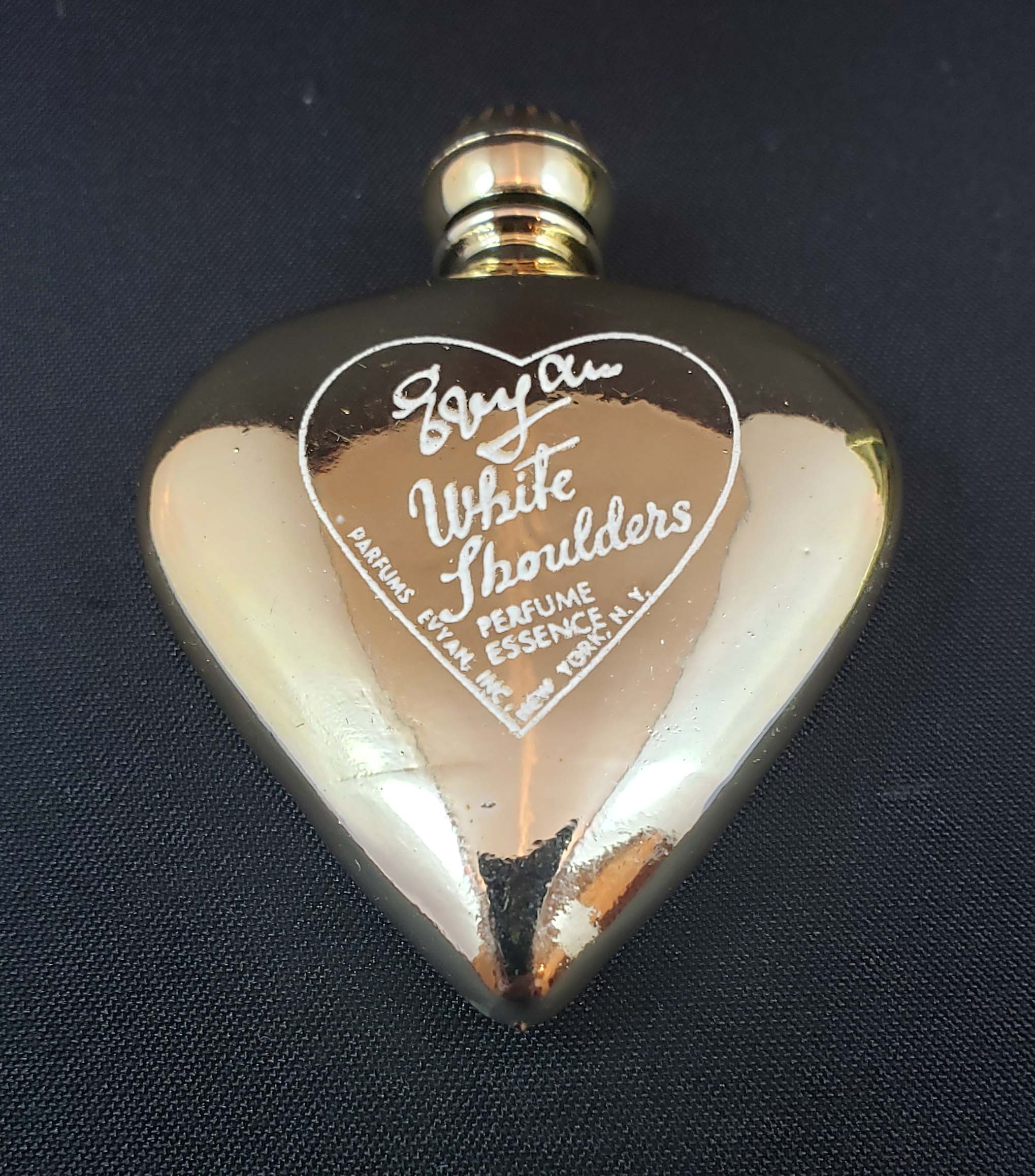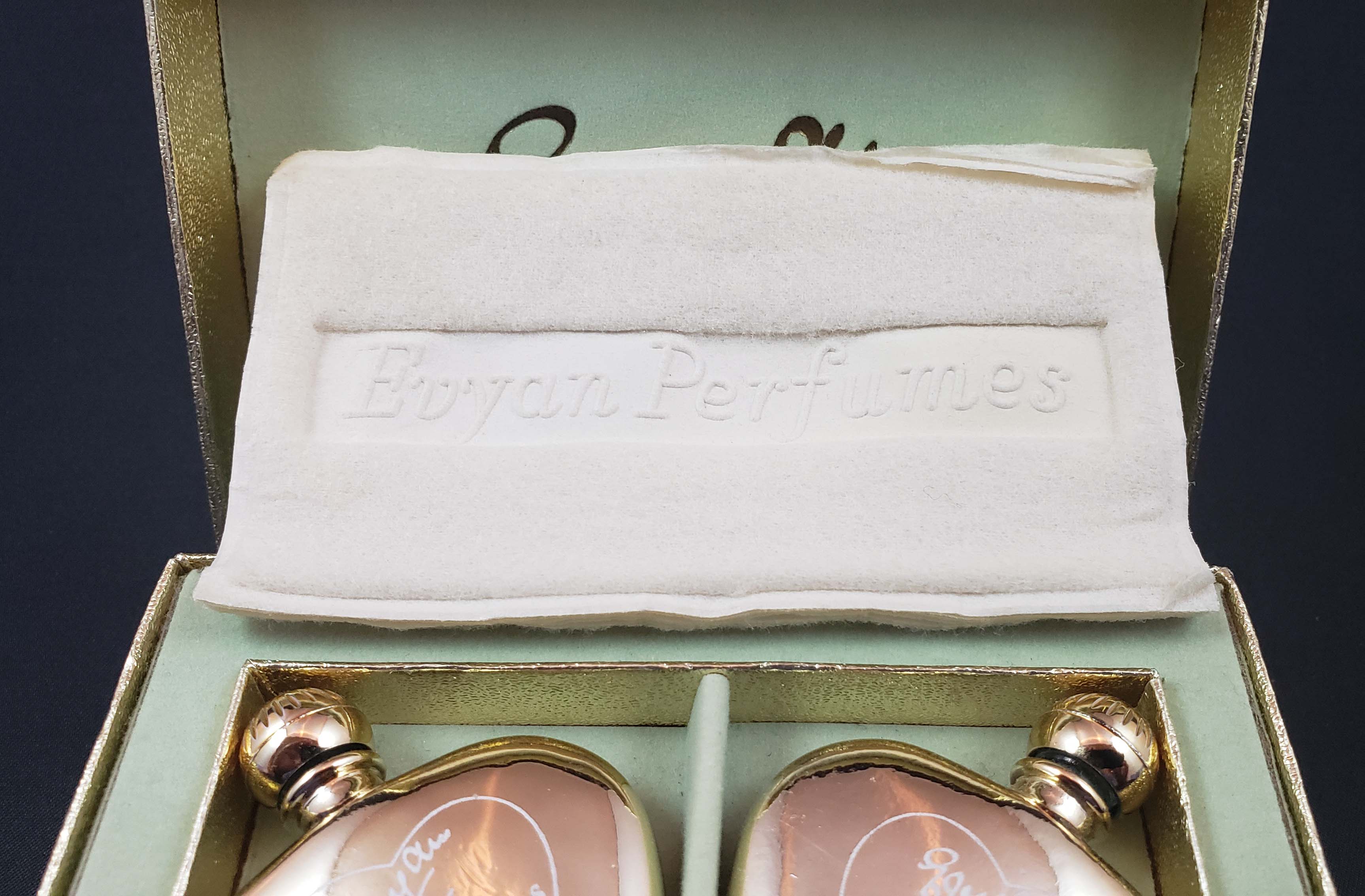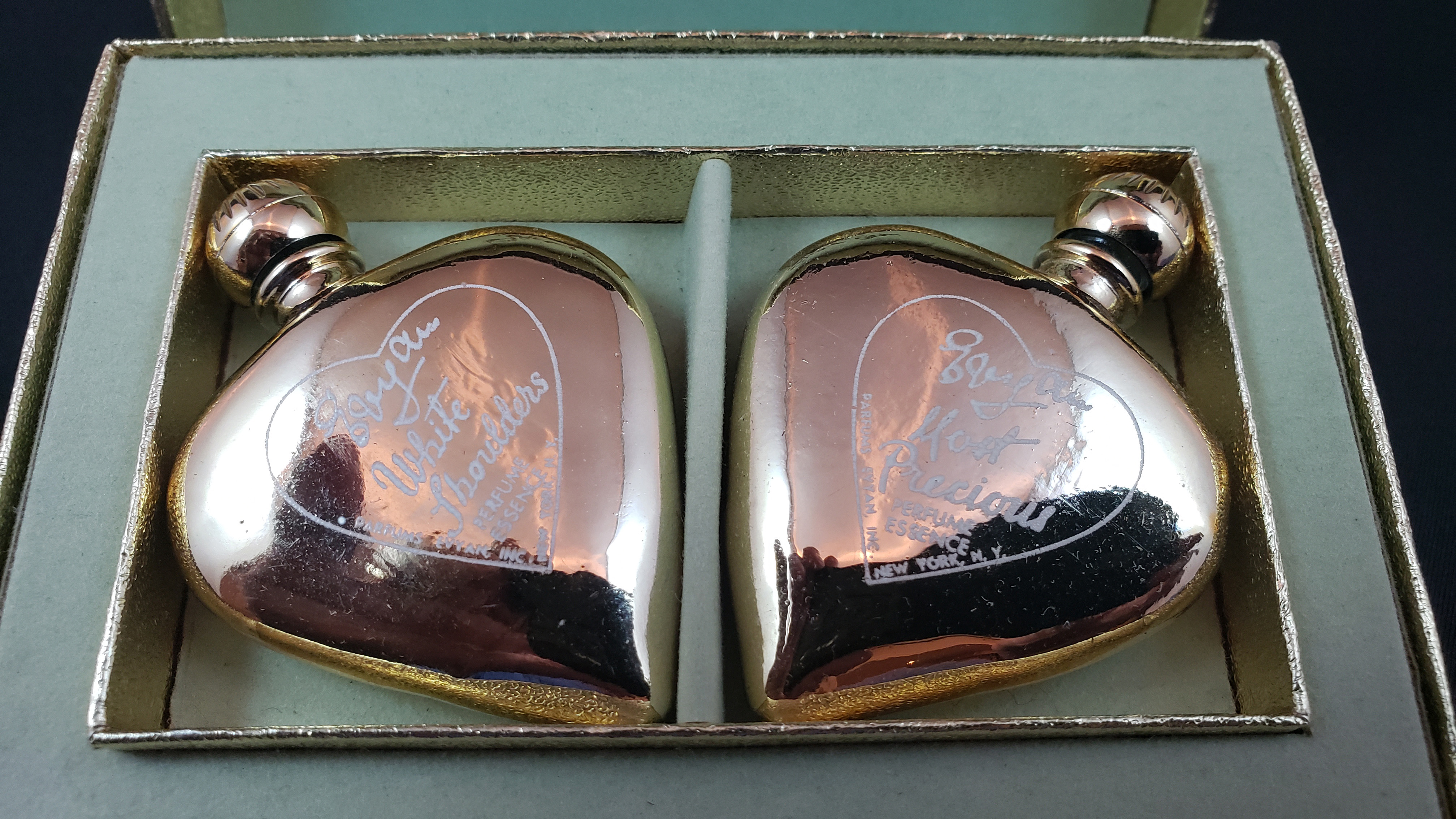 Boxed set of two - Evyan White Shoulders and Most Precious perfumes - Two Golden Hearts. In original presentation case all in excellent condition. Bottles height 2 1/4 inches. The presentation box is 4 by 5 inches.