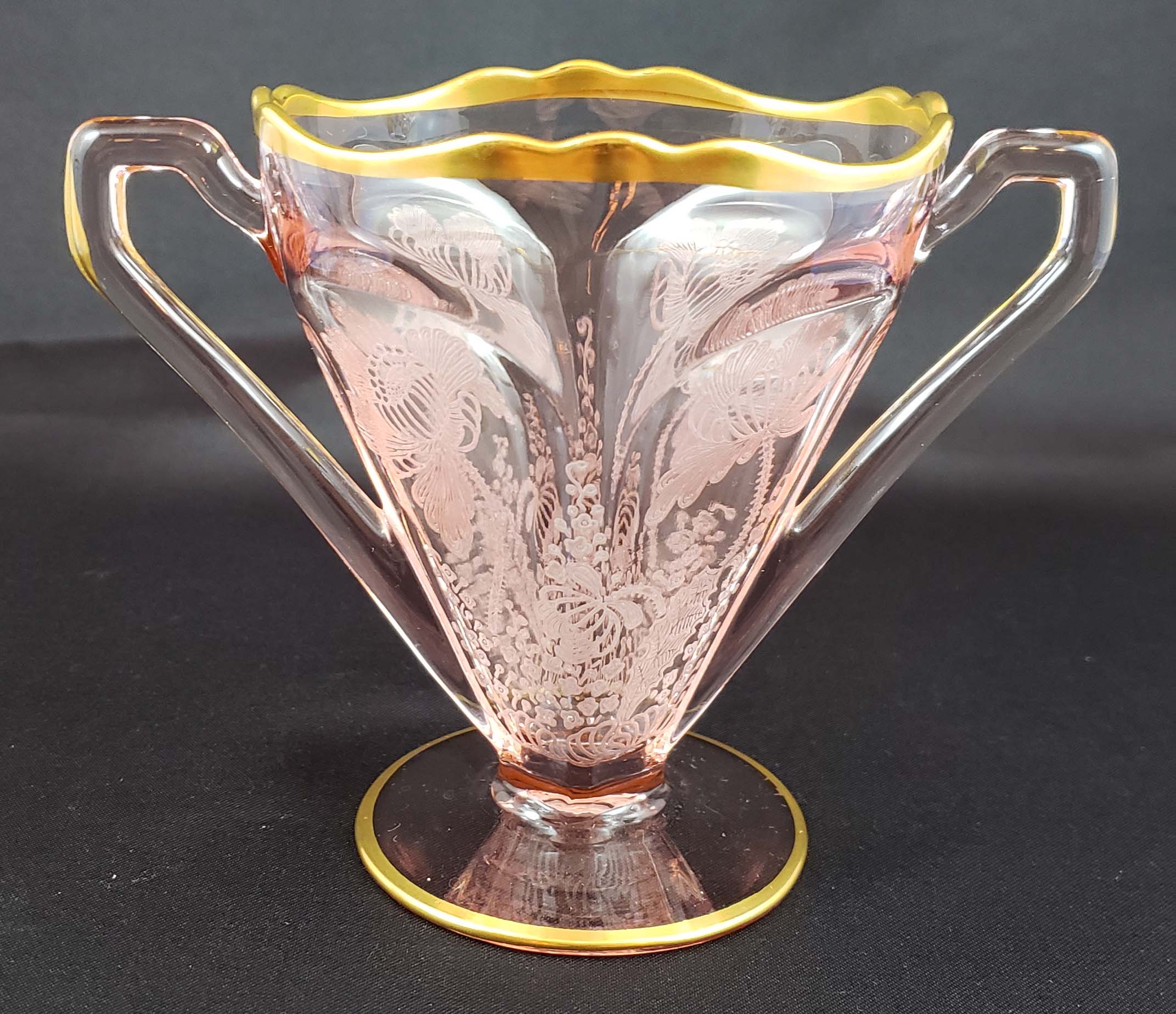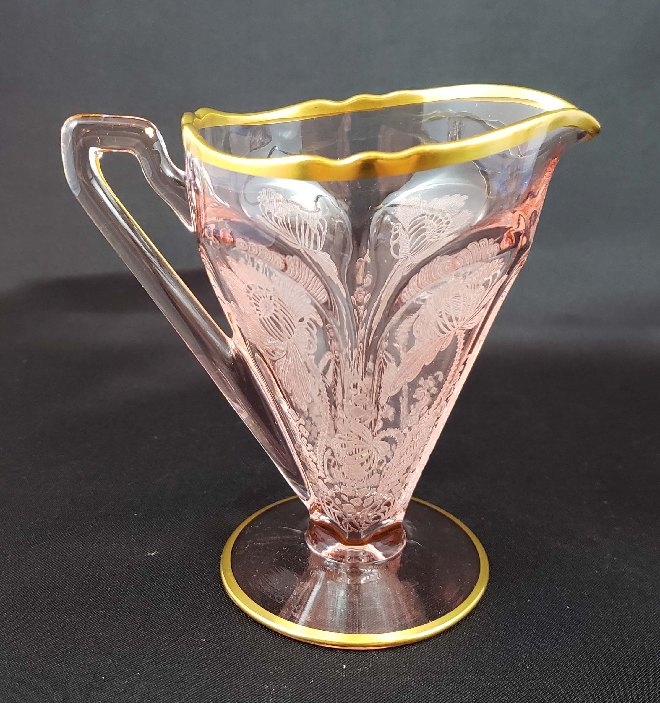 Cambridge Glass Co. Cream & Sugar Set in Peach Blo colored glass etched Gloria