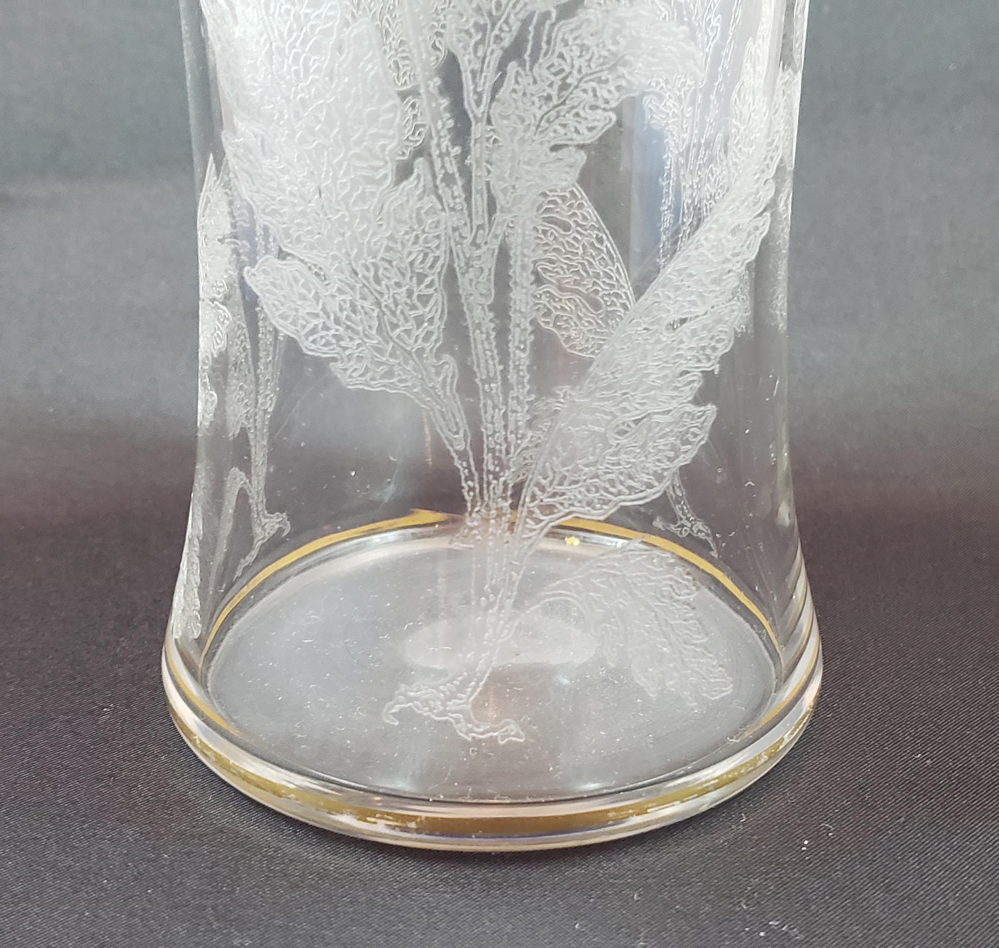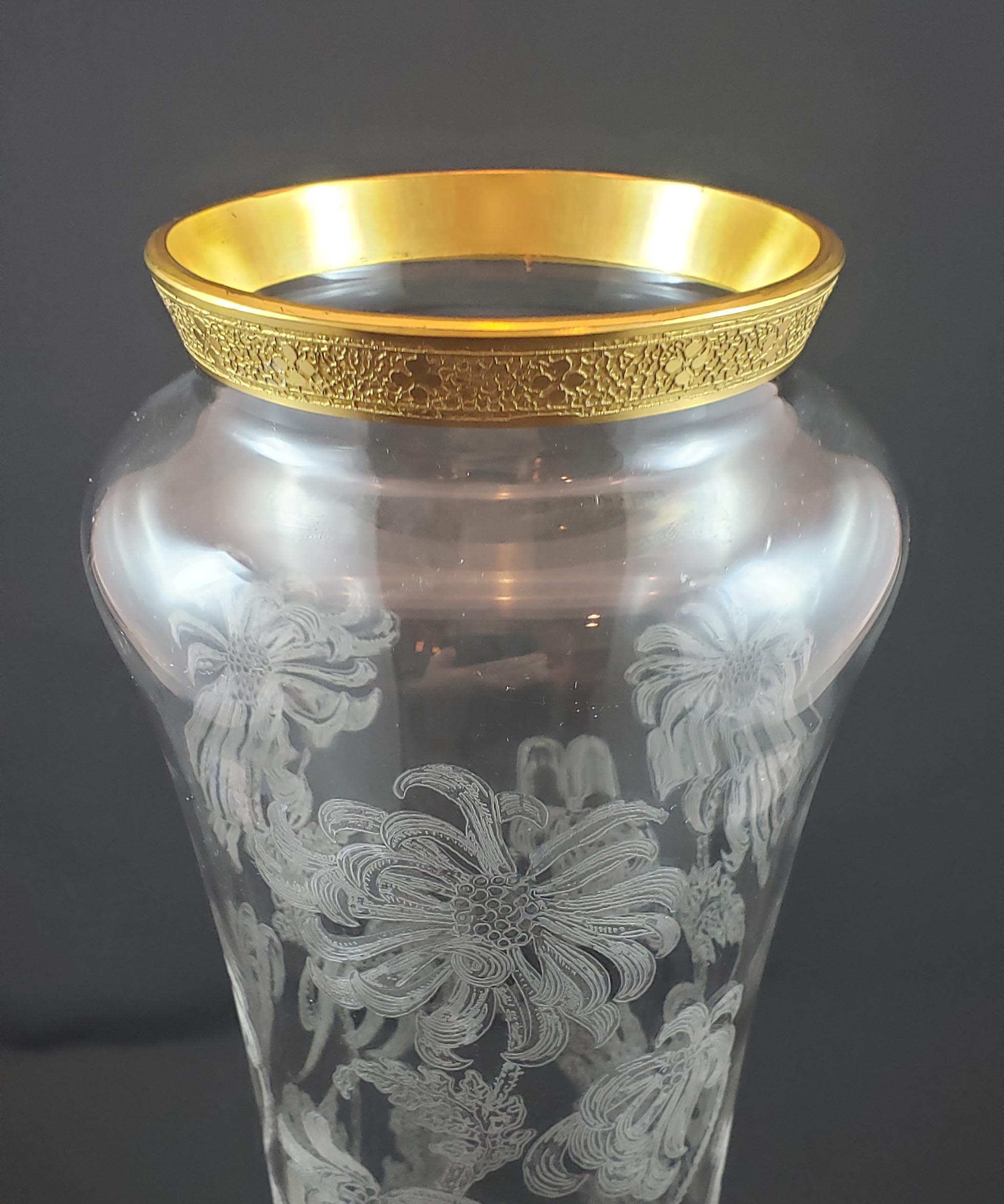 Cambridge Glass Company tall 12" Vase in crystal glass with gold encrusted etching at the rim and gold enamel trim at the base. Etched Chrysanthemum. Width at the top is 8 inches. This vase is circa 1920 and appears the Welker I catalog reprints at page 97. In beautiful condition - gold is near mint - and with no chips, cracks or scratches except the usual age wear marks on the bottom.