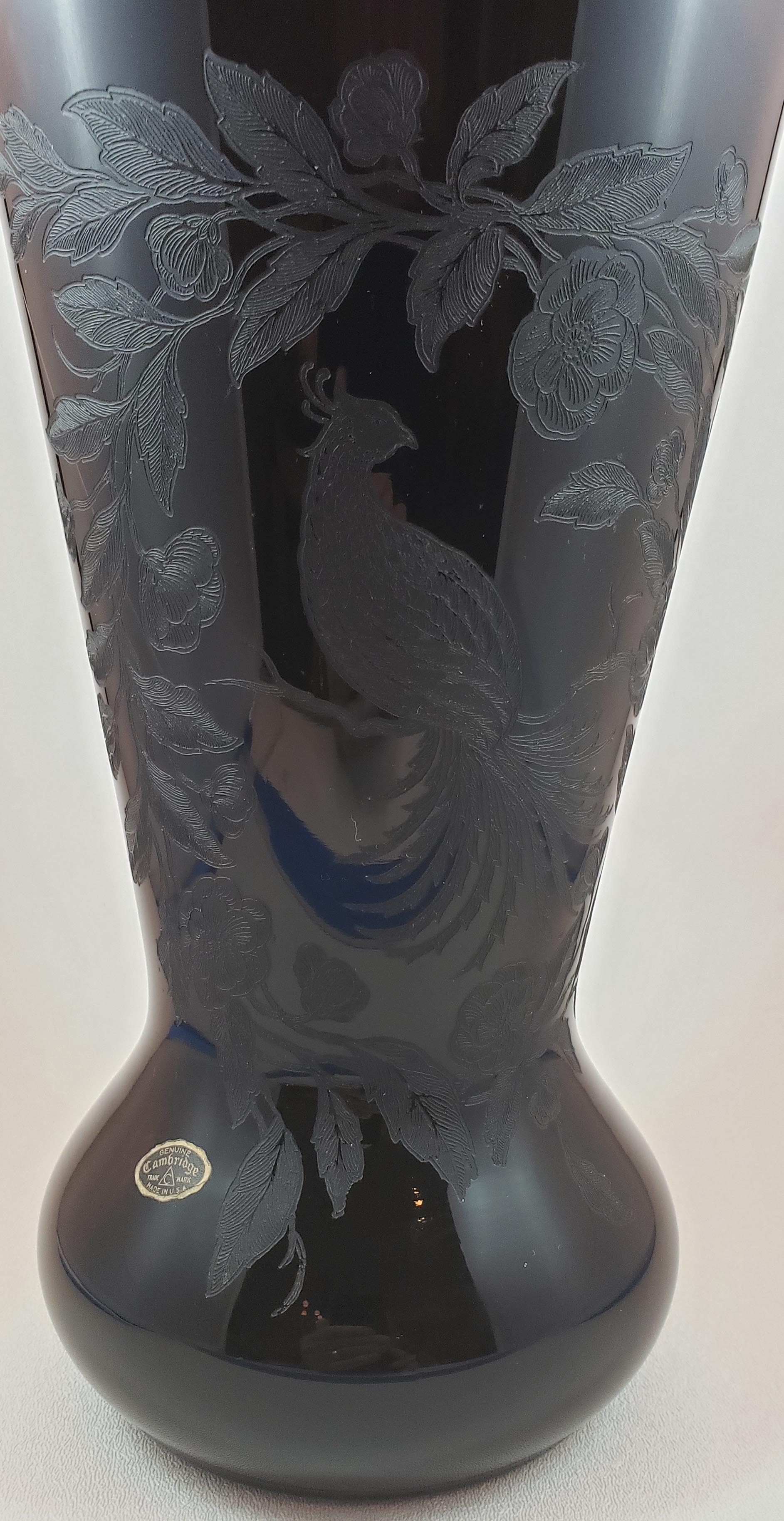 Cambridge Glass 12-inch Tall Ebony Vase Etched 736 - Bird