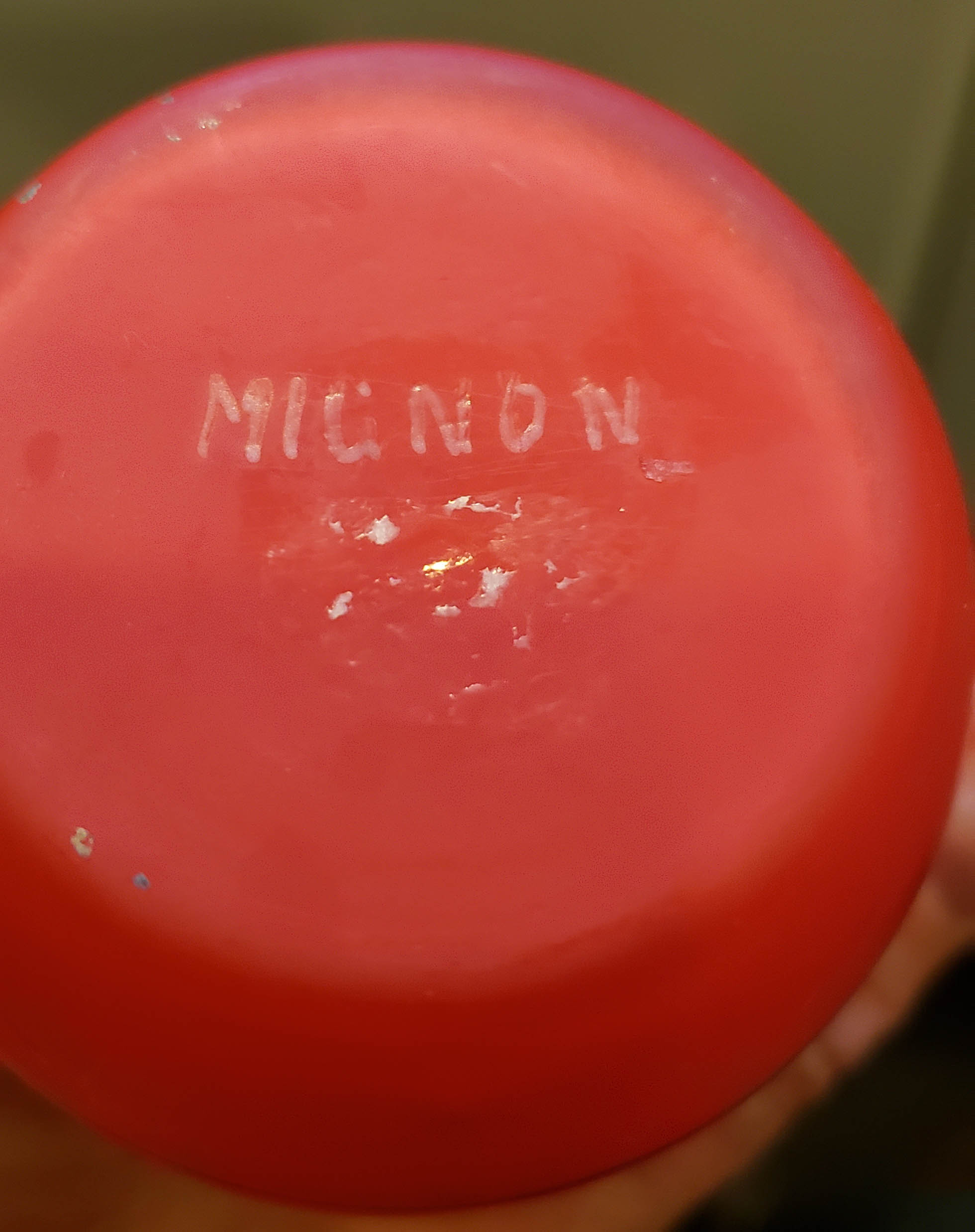 Beautiful Mignon perfume atomizer from the 1920s. Mignon was a premiere manufacturer of perfume atomizers from that period that purchased glass bottles from the finest glass houses of the period including Steuben and Baccarat and fitted them with fine French atomizer hardware. We cannot identify the maker of this bottle. The metal spray fittings are marked "Made in France" and are bright gold plated and show little wear, pitting or scratching. The ball and cord are new. The bottle is satin-finished on the exterior and is interior-enameled in a bright red-orange and decorated with a dancing nymph in fired-on black enamel. It is signed on the bottom "MIGNON" in acid. The bottle is in top condition, with no chips, cracks or scratches in the glass. It is 7 1/2 inches tall to top of atomizer head.
