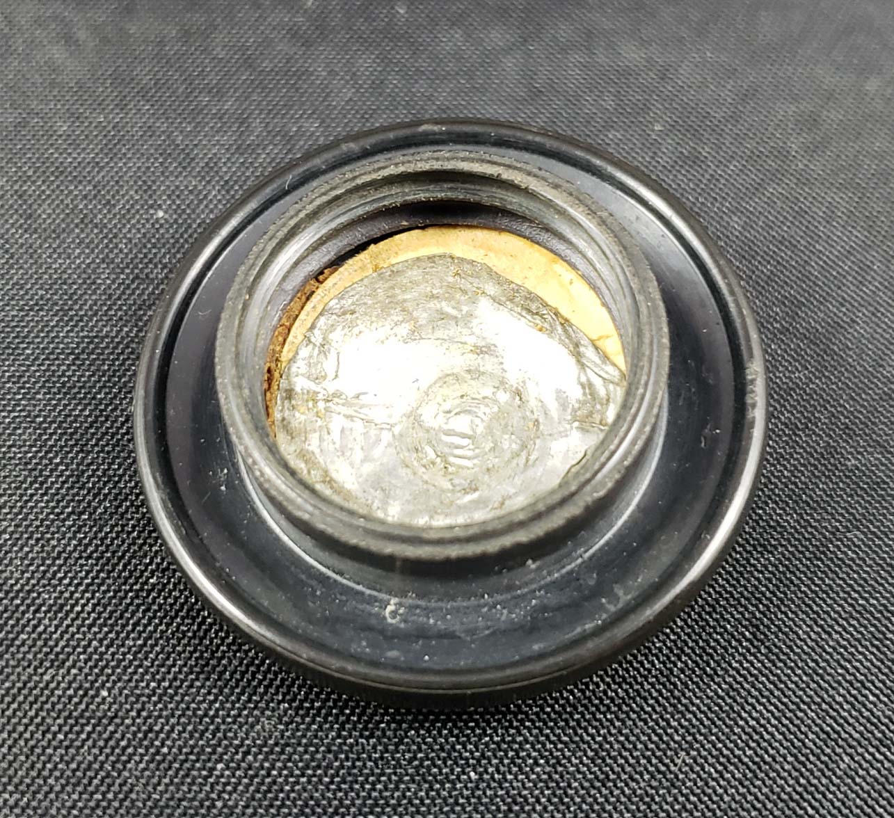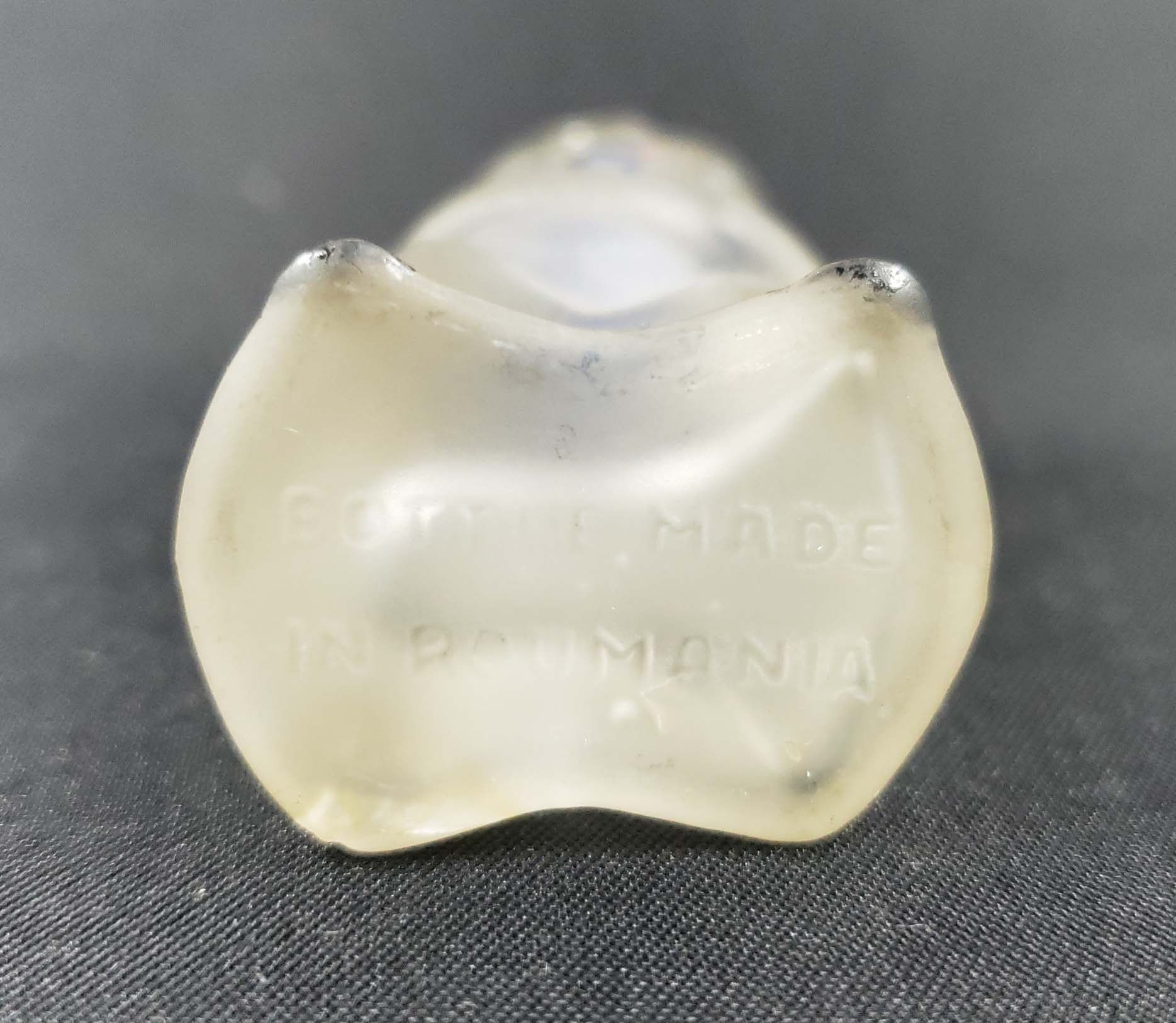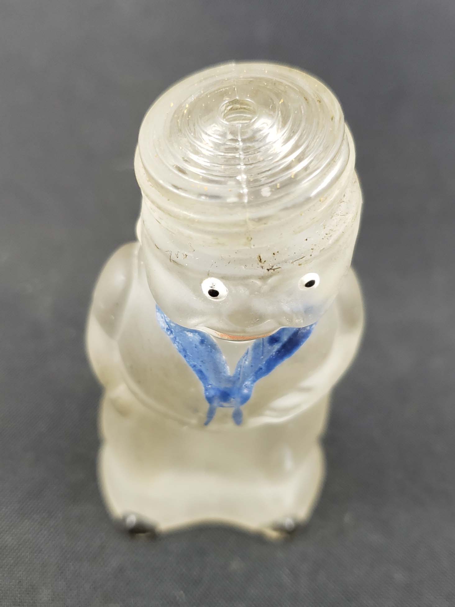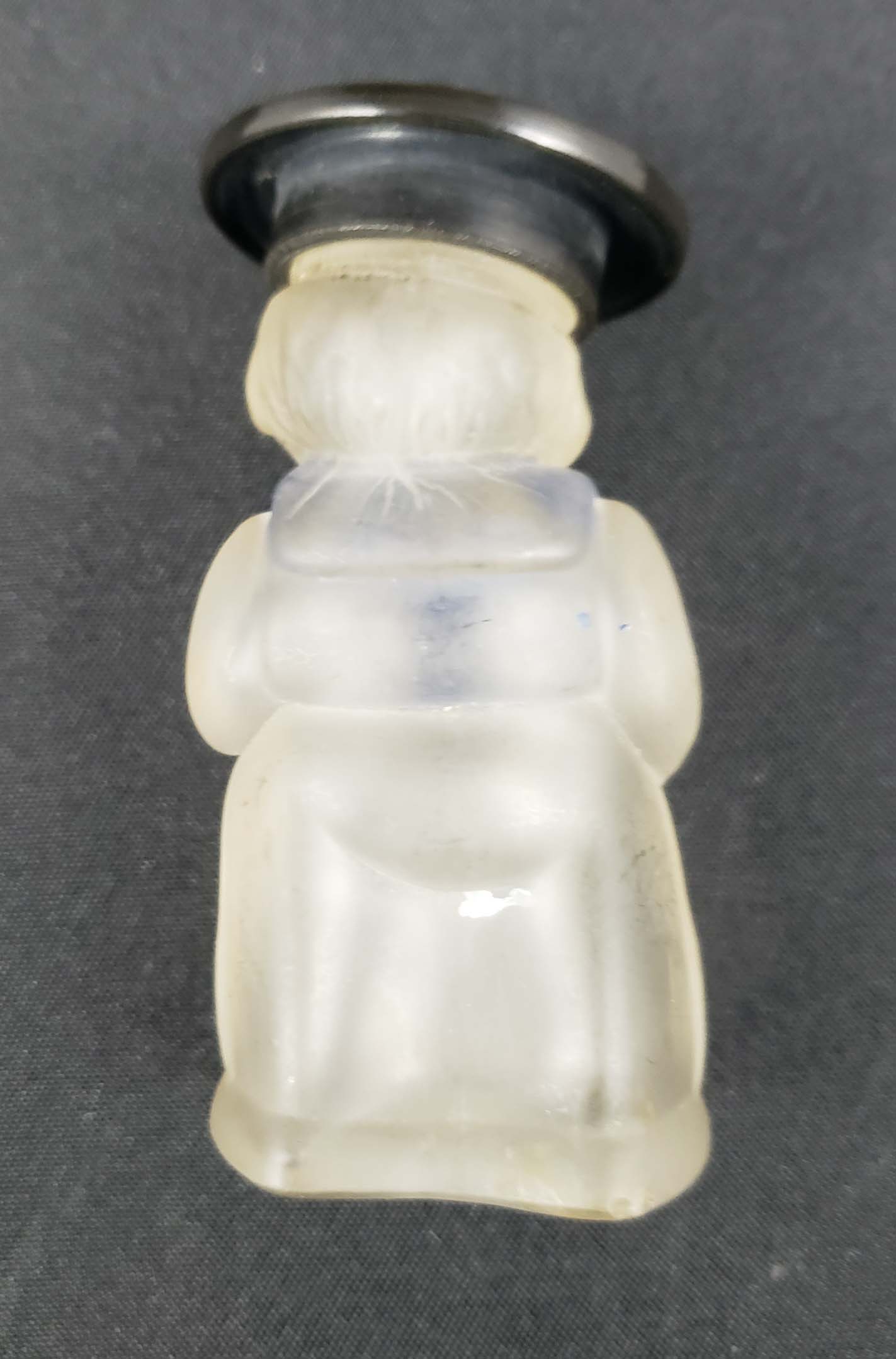 Perfume Bottle Sailor Figural with black Bakelite screw cap. Enameled scarf, lips, eyes and feet. Marked in mold, "Bottle Made in Roumania". 2 3/4 inches tall. Excellent condition.