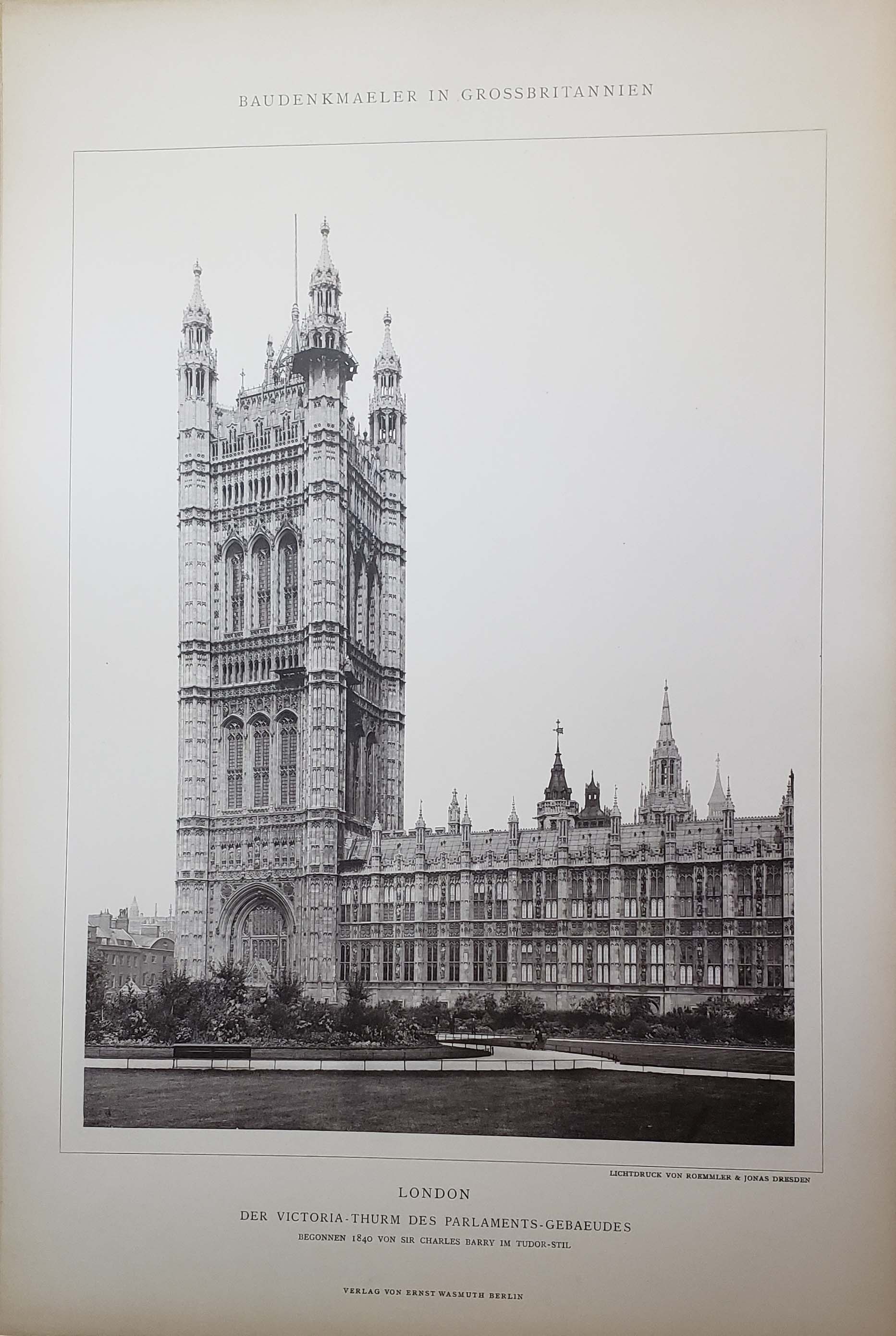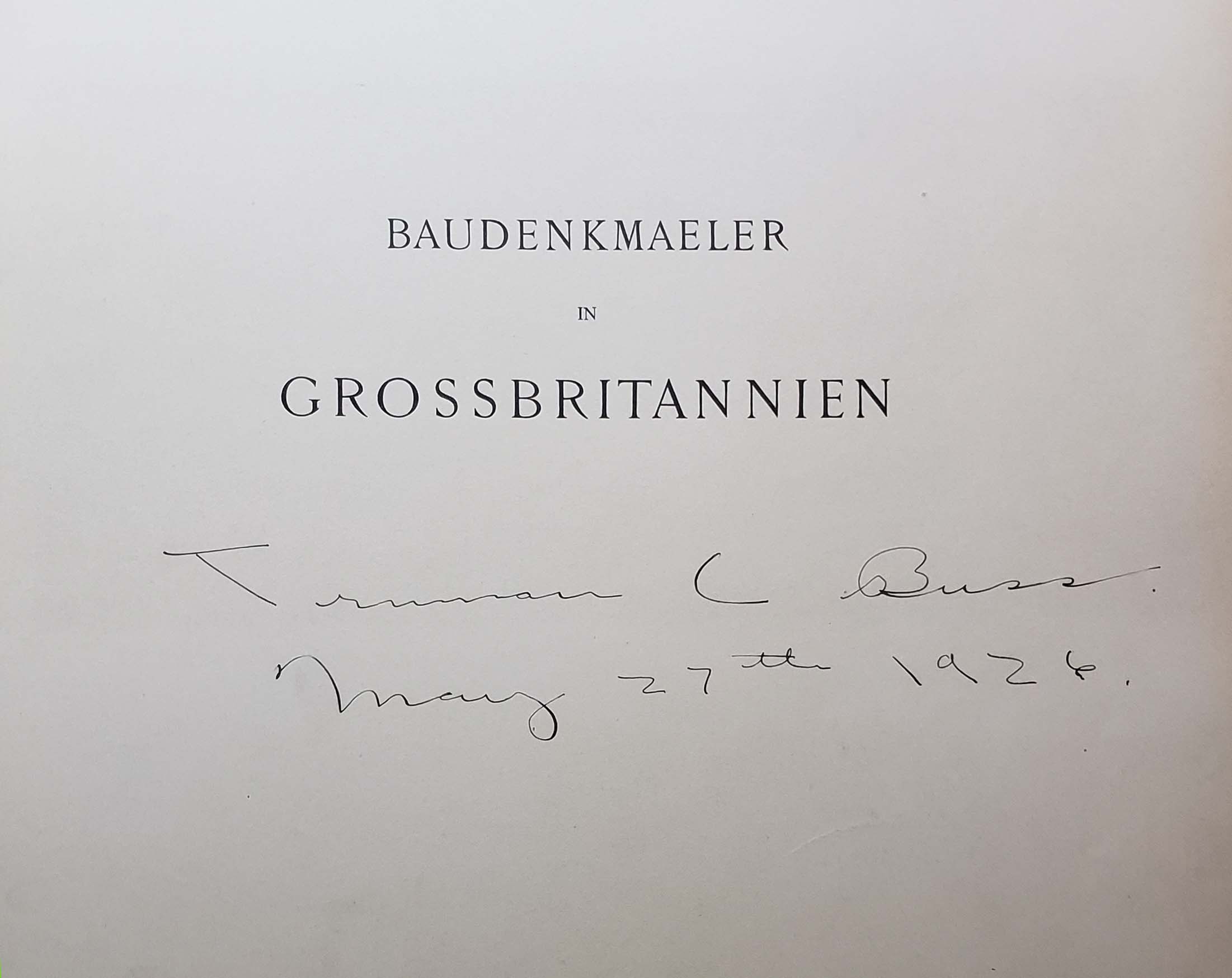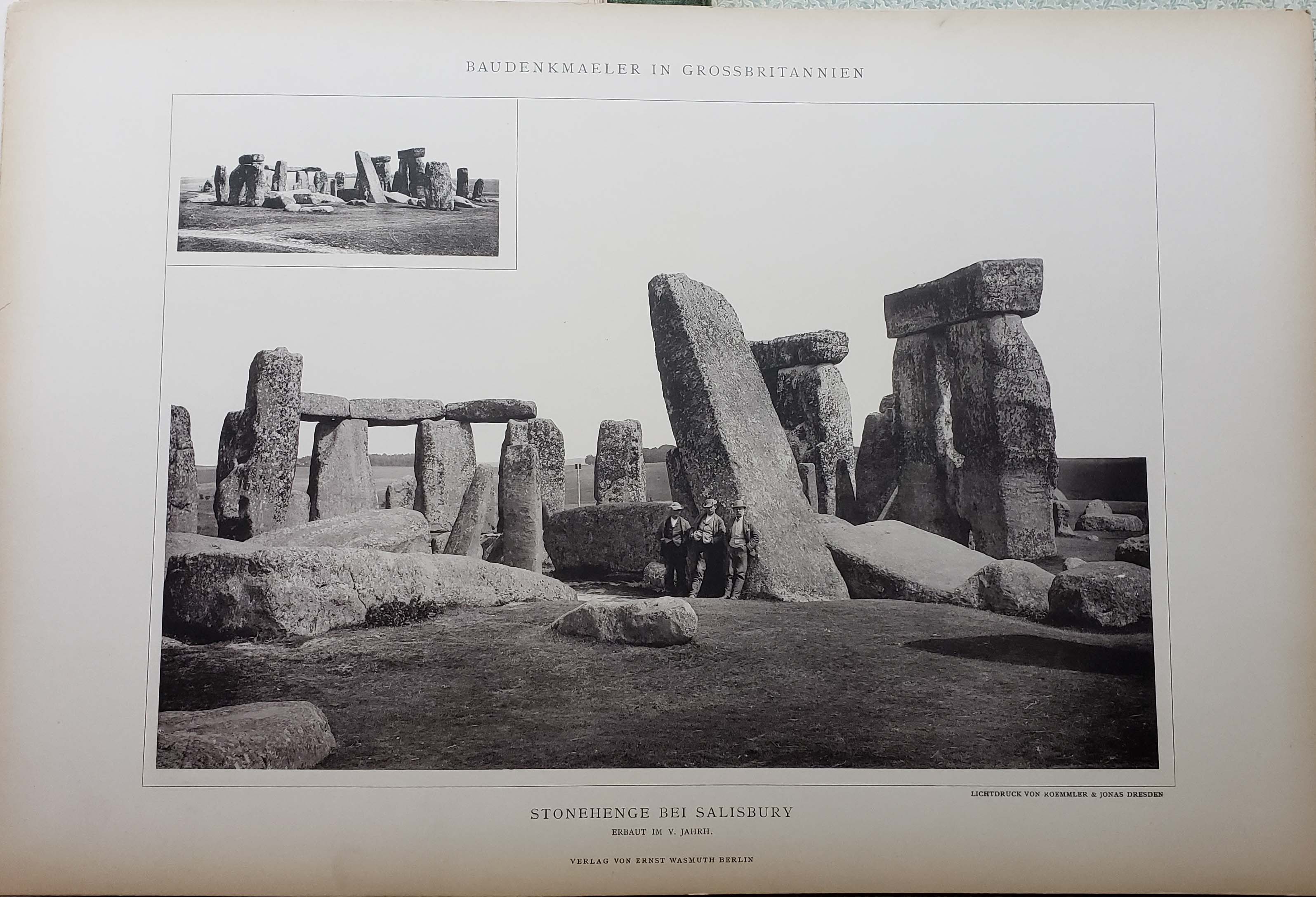 BAUDENKMAELER IN GROSSBRITANNIEN. (Museum of Buildings in Great Britain) Berlin: Ernst Wasmuth, 1894. Folio. First edition. By Constantin Uhde. Thirty-one unbound plates (those in the table of contents plus six others) from a comprehensive photographic survey of British architecture, showing the work Sir Christopher Wren, Inigo Jones, and others. It features Chester Cathedral, York Cathedral, Windsor Castle, and a photograph of Stonehenge. This folio was owned by Truman C. Buss, (hand signed by him in 1926) author of the 1951 definitive textbook "Simplified Architectural Drawing". Dimensions of plates are 19" high by 12.5 inches wide. In good condition with some darkening around edges of plates and cone edges and corners very slightly rough.