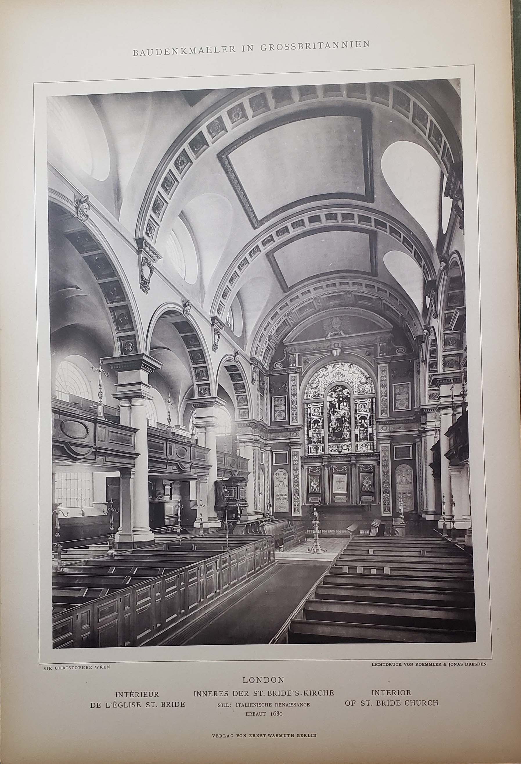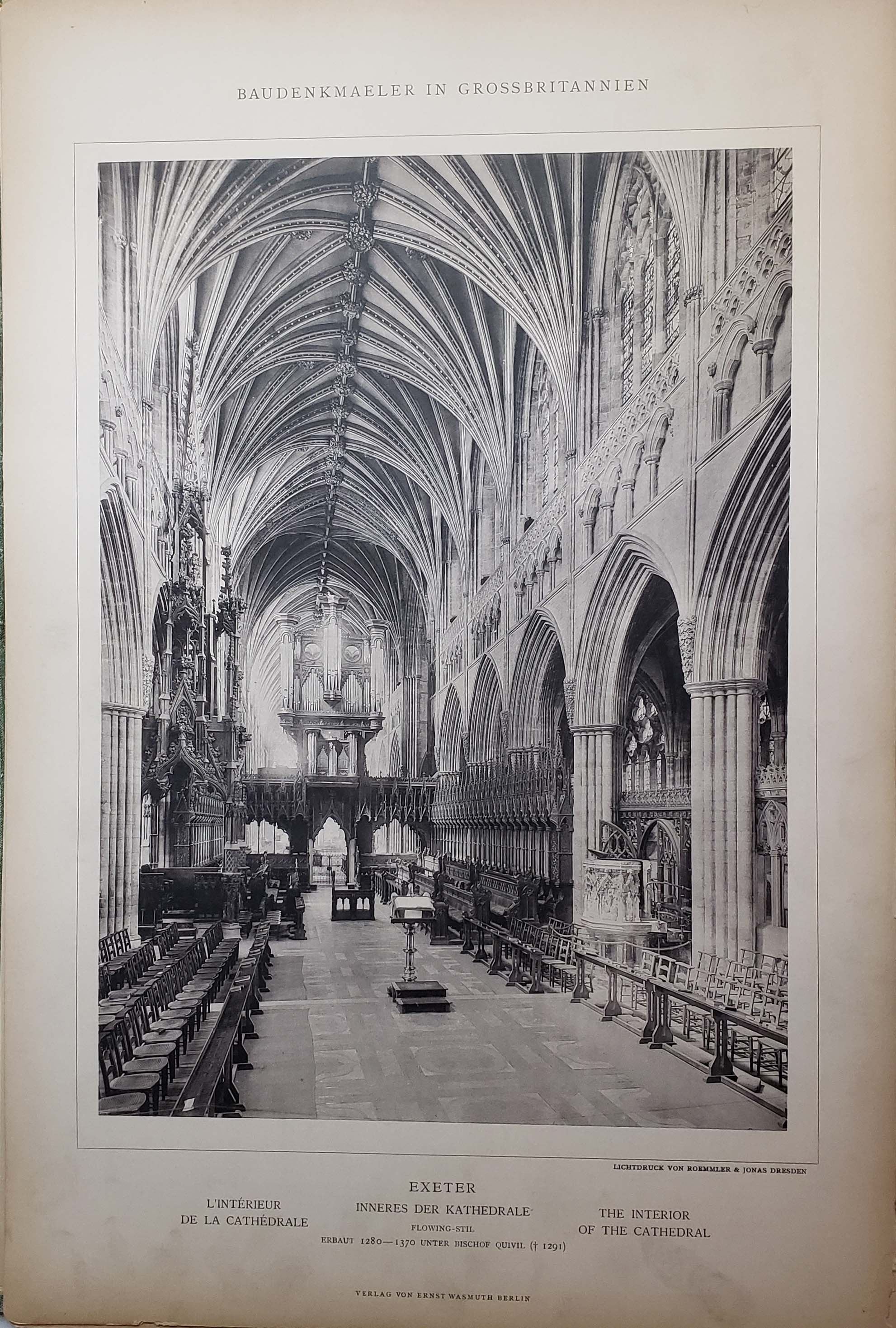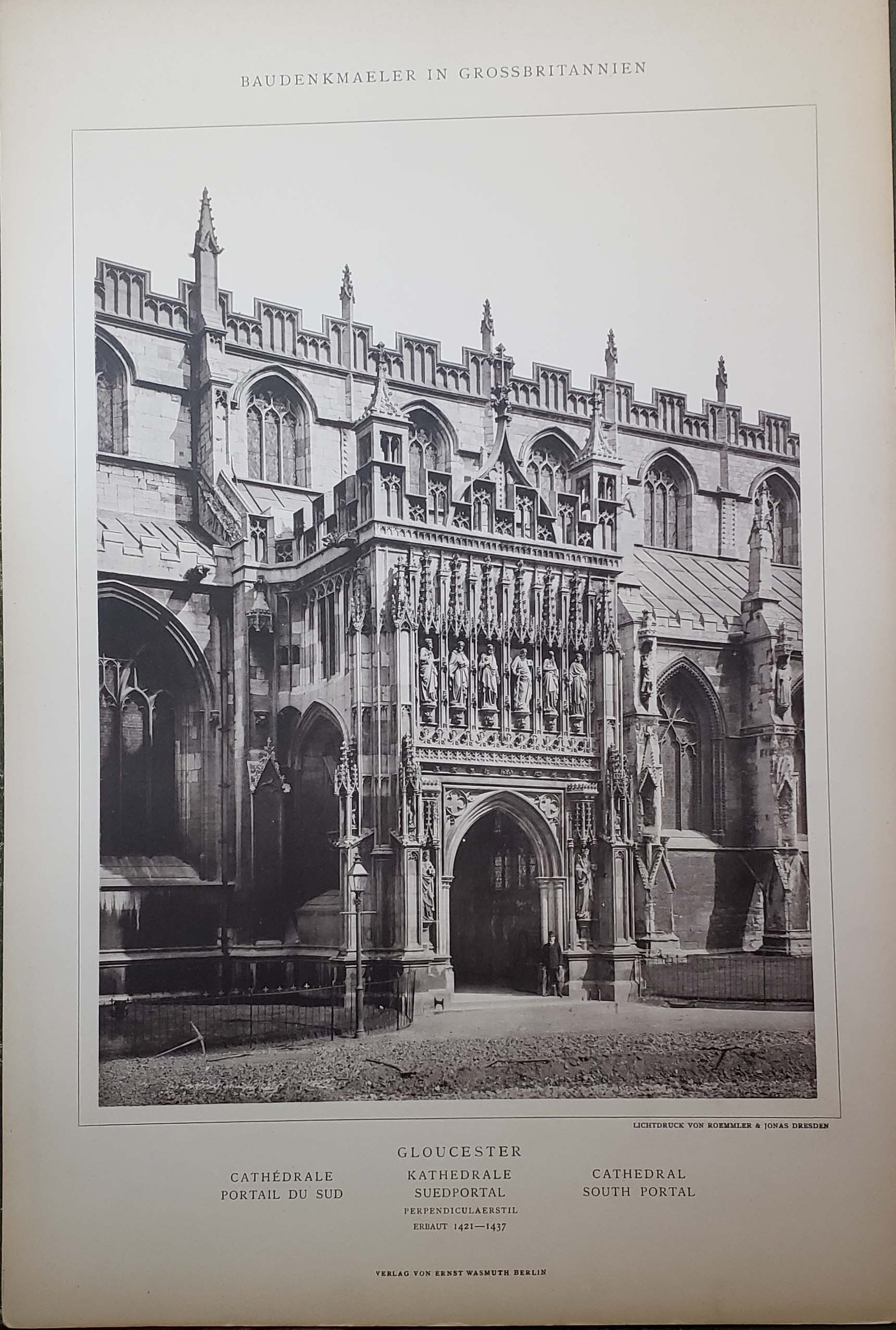 BAUDENKMAELER IN GROSSBRITANNIEN. (Museum of Buildings in Great Britain) Berlin: Ernst Wasmuth, 1894. Folio. First edition. By Constantin Uhde. Thirty-one unbound plates (those in the table of contents plus six others) from a comprehensive photographic survey of British architecture, showing the work Sir Christopher Wren, Inigo Jones, and others. It features Chester Cathedral, York Cathedral, Windsor Castle, and a photograph of Stonehenge. This folio was owned by Truman C. Buss, (hand signed by him in 1926) author of the 1951 definitive textbook "Simplified Architectural Drawing". Dimensions of plates are 19" high by 12.5 inches wide. In good condition with some darkening around edges of plates and cone edges and corners very slightly rough.