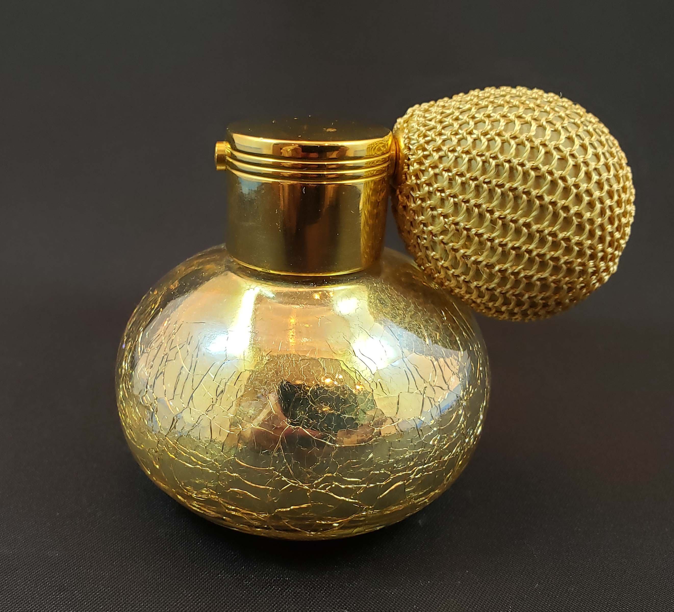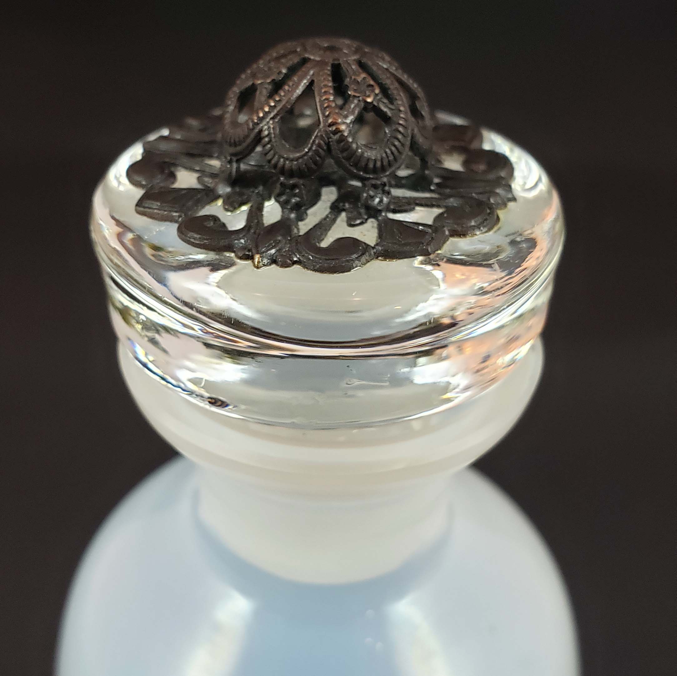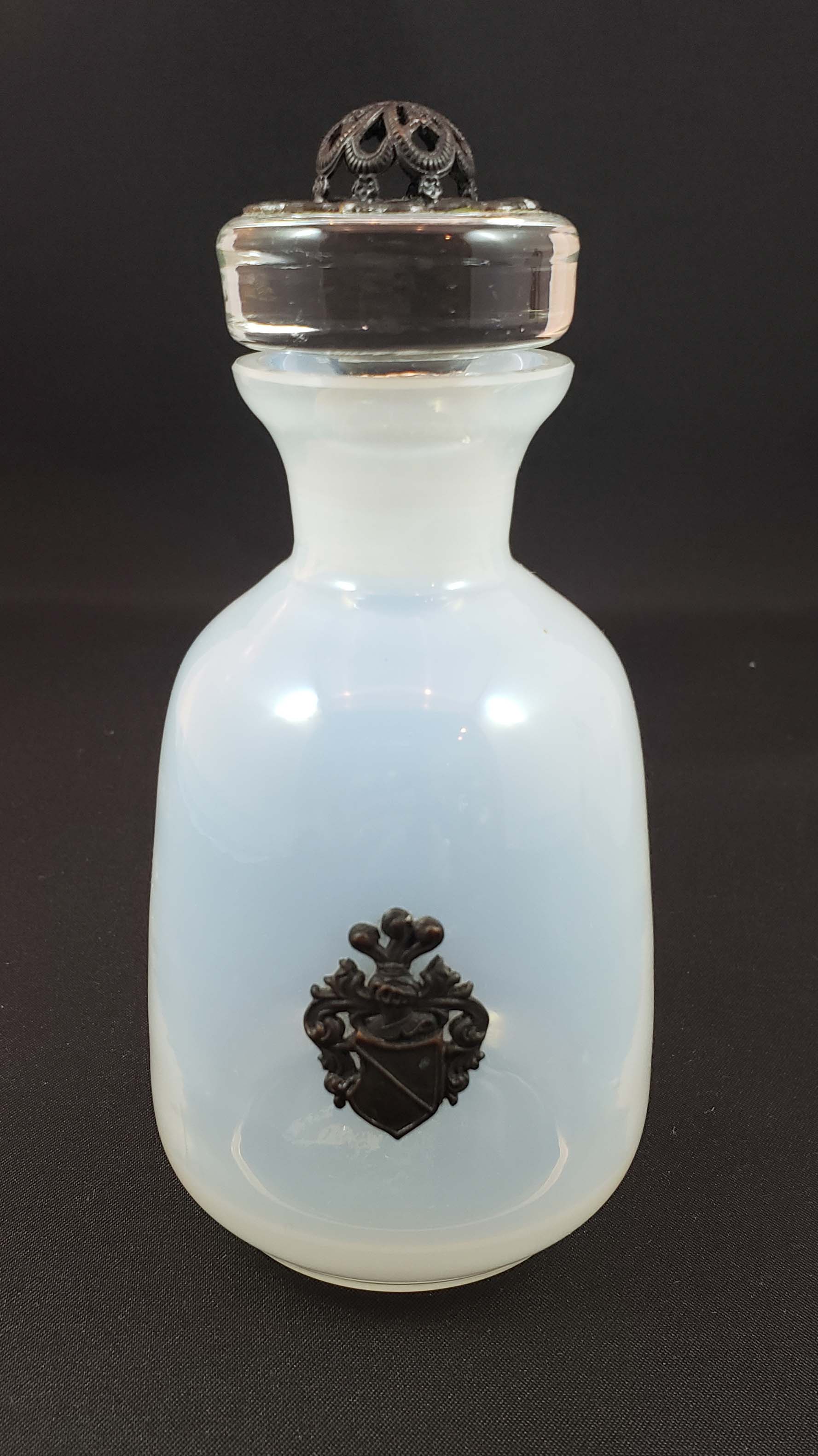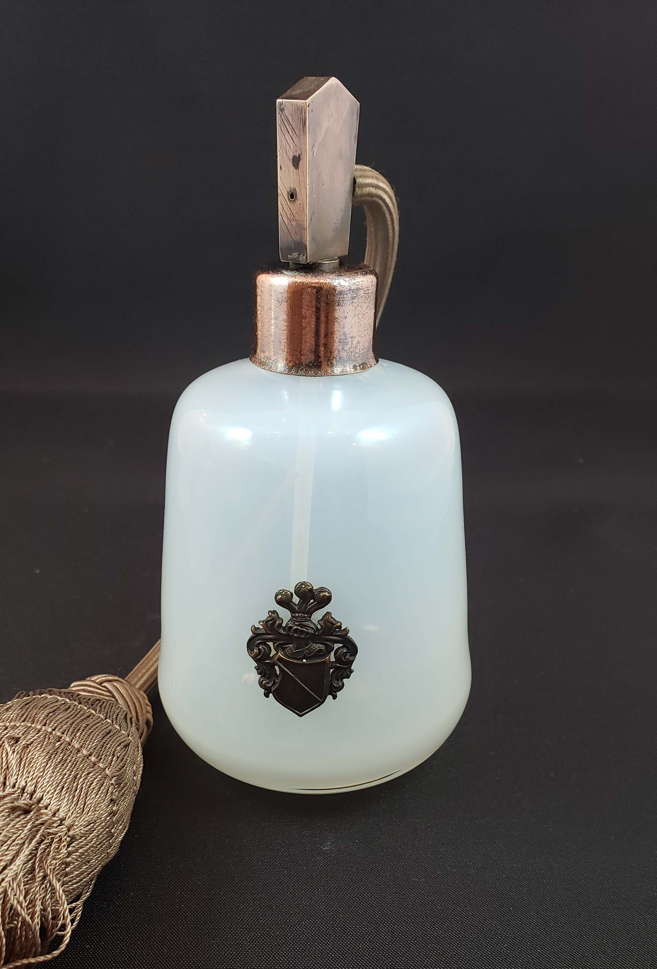 Beautiful Czech opalescent cologne with antique bronze hardware and applied decorative shield