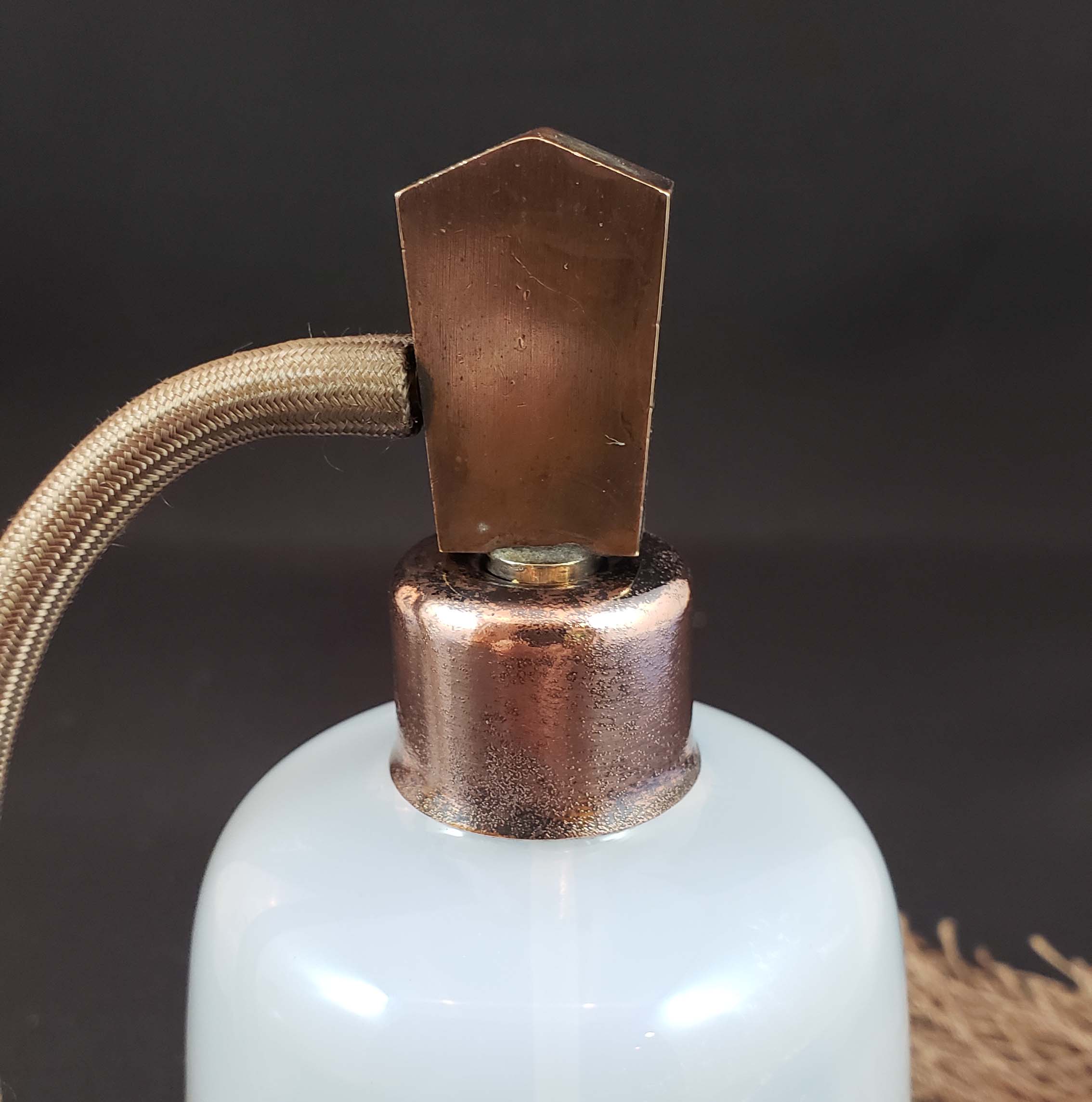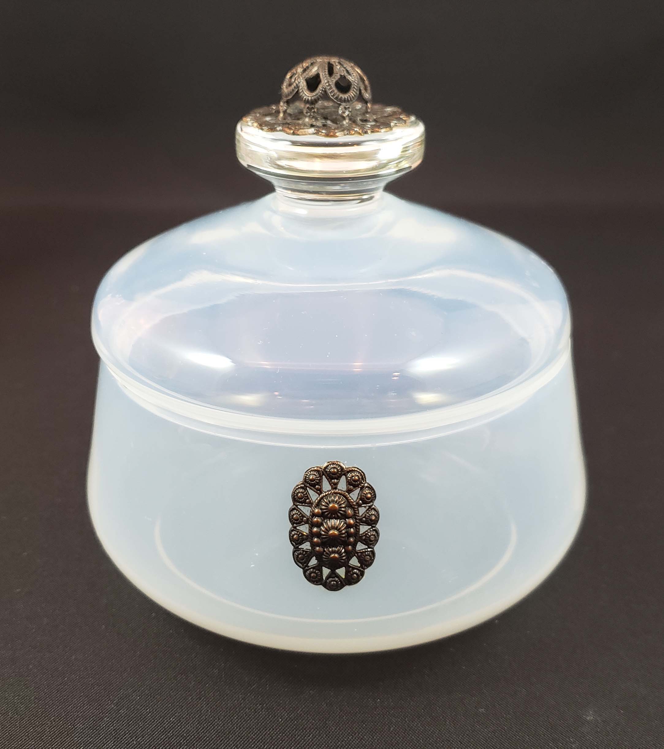 Beautiful three-piece perfume atomizer, cologne bottle and powder jar vanity set. White opalescent blown glass with filigree decorations on cologne and jar handles; shields on sides of each piece. The glass maker is unknown but very possibly H. C. Fry. The atomizer hardware is bronze finished and the ball and cord with tassel are original. All in great condition. One tiny bruise on the powder jar lip as shown - not a chip and you can't catch your fingernail on it. The atomizer and cologne are 5.5 inches tall.