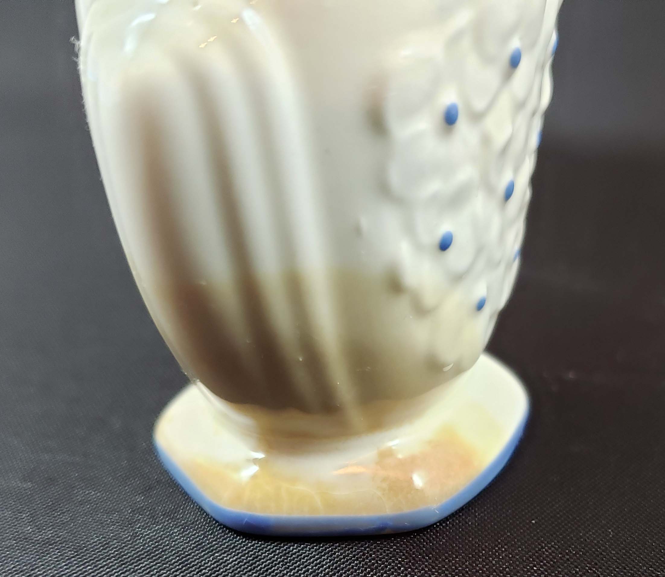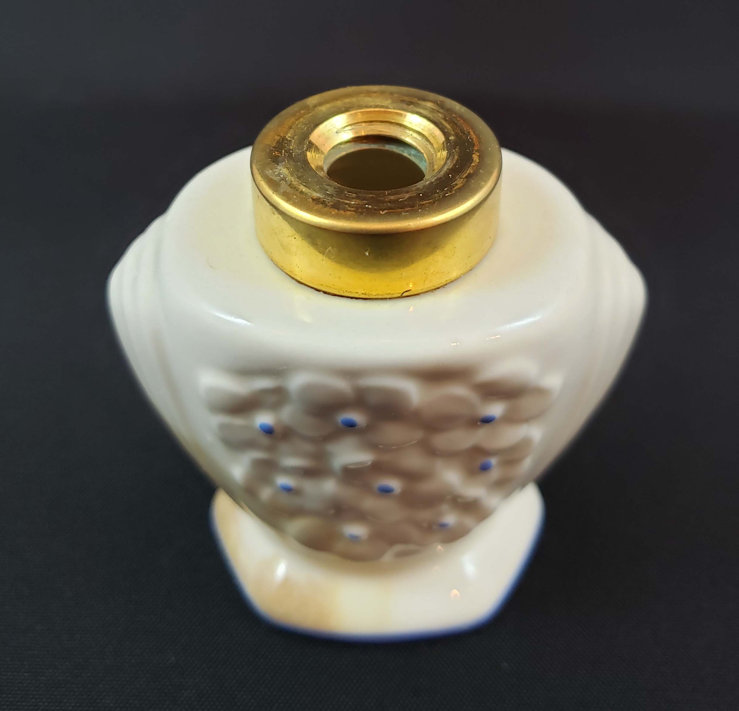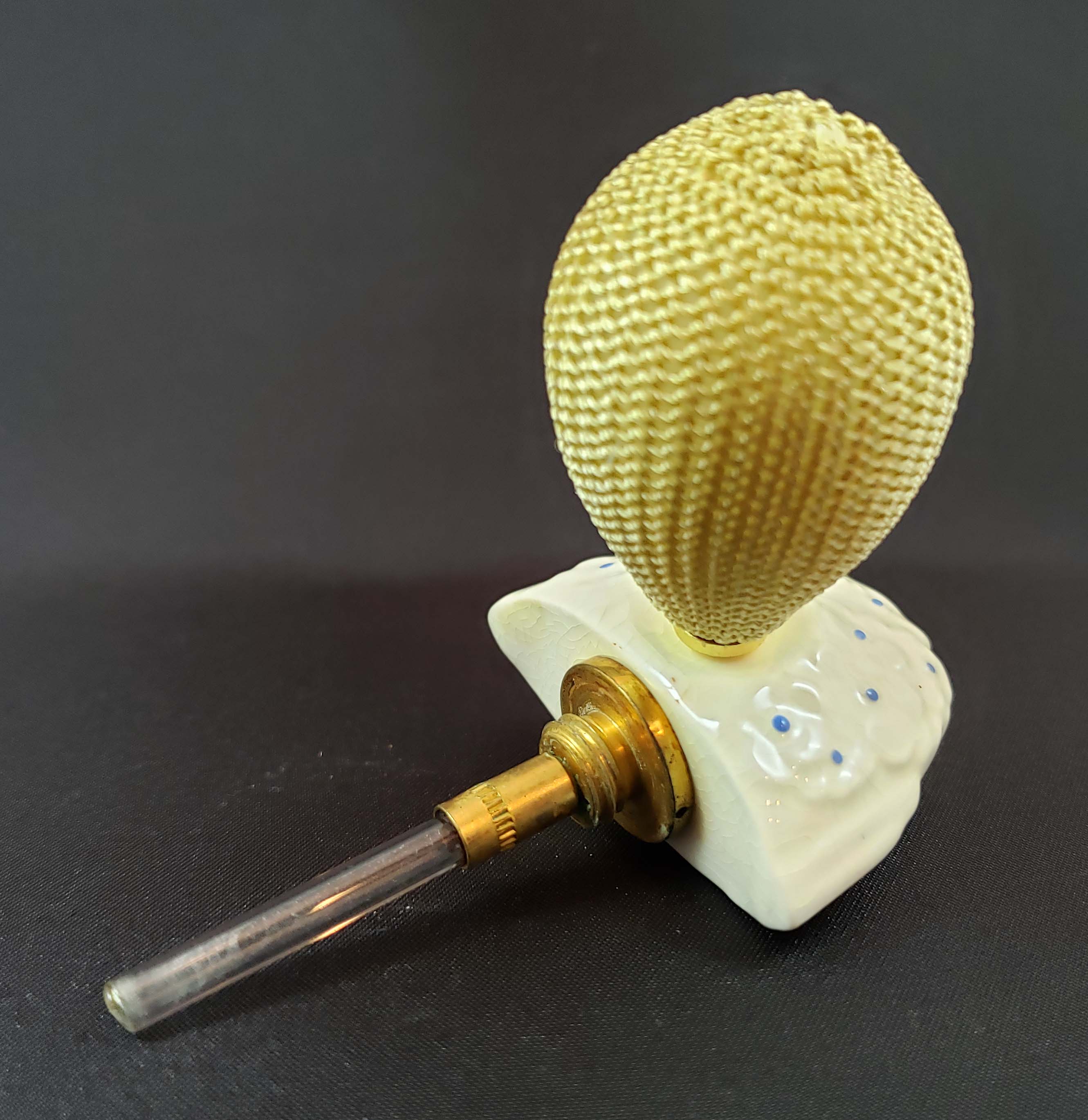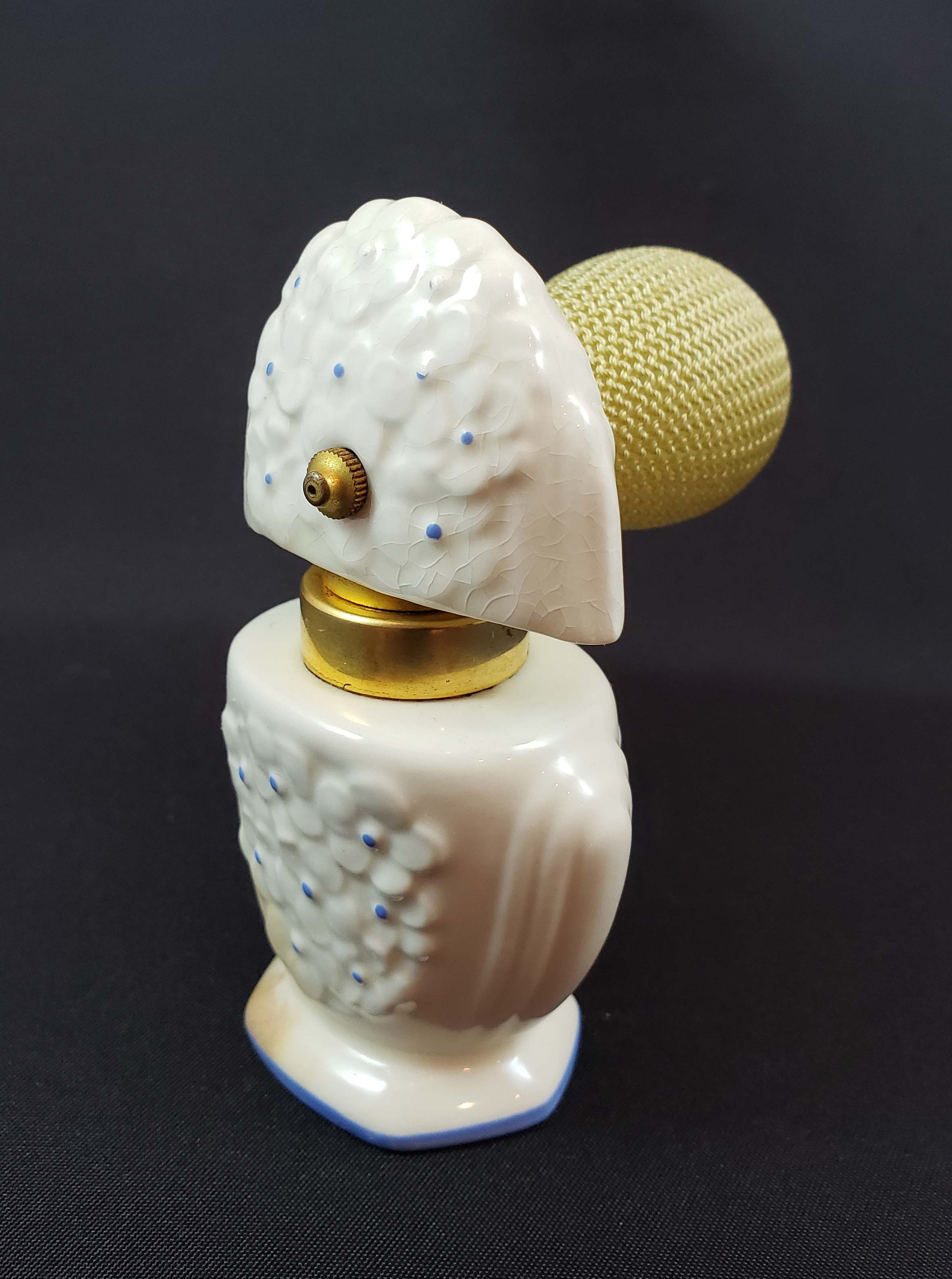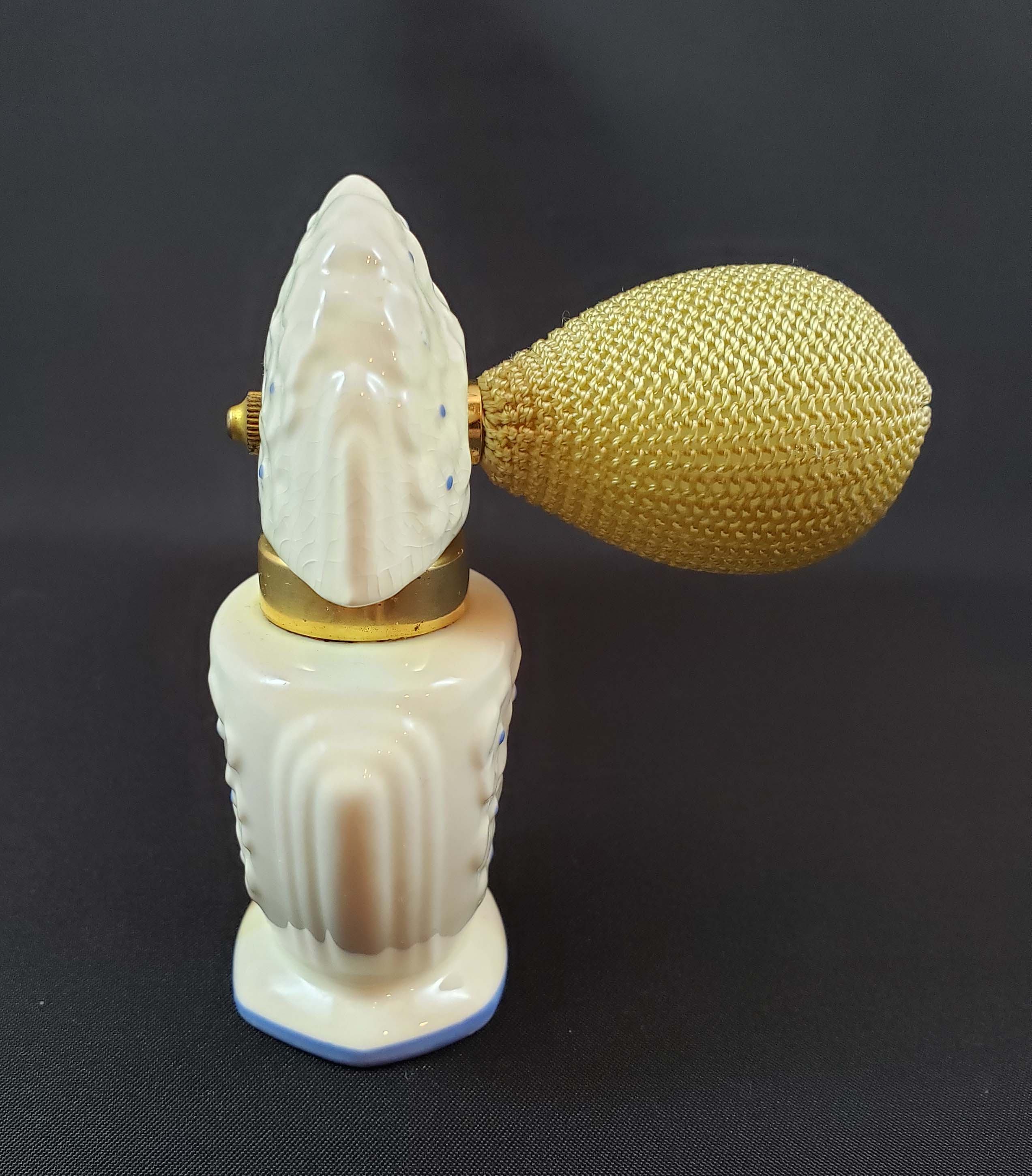 DeVilbiss Perfume Atomizer number S200-128 from 1936. White porcelain bottle by Lenox China white with blue dots. The ball is new. Atomizer works well. One problem is a brown perfume stain in the porcelain on the left bottom and base of the bottle. Otherwise great condition. Height is 3 3/4 inches. Signed both DeVilbiss and Lenox on the base.