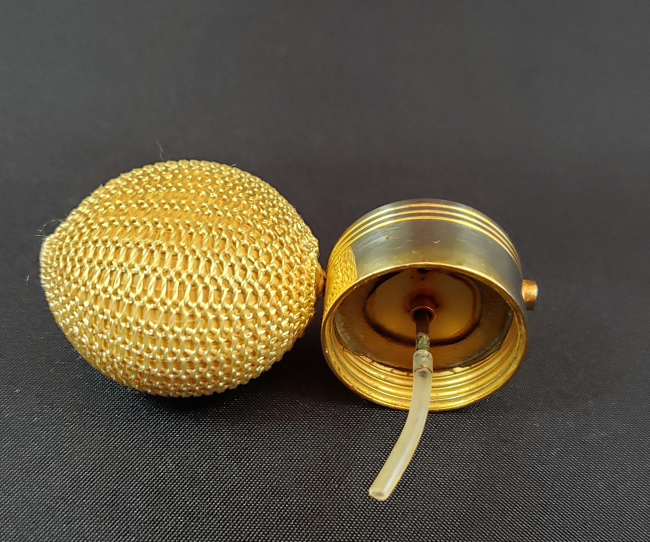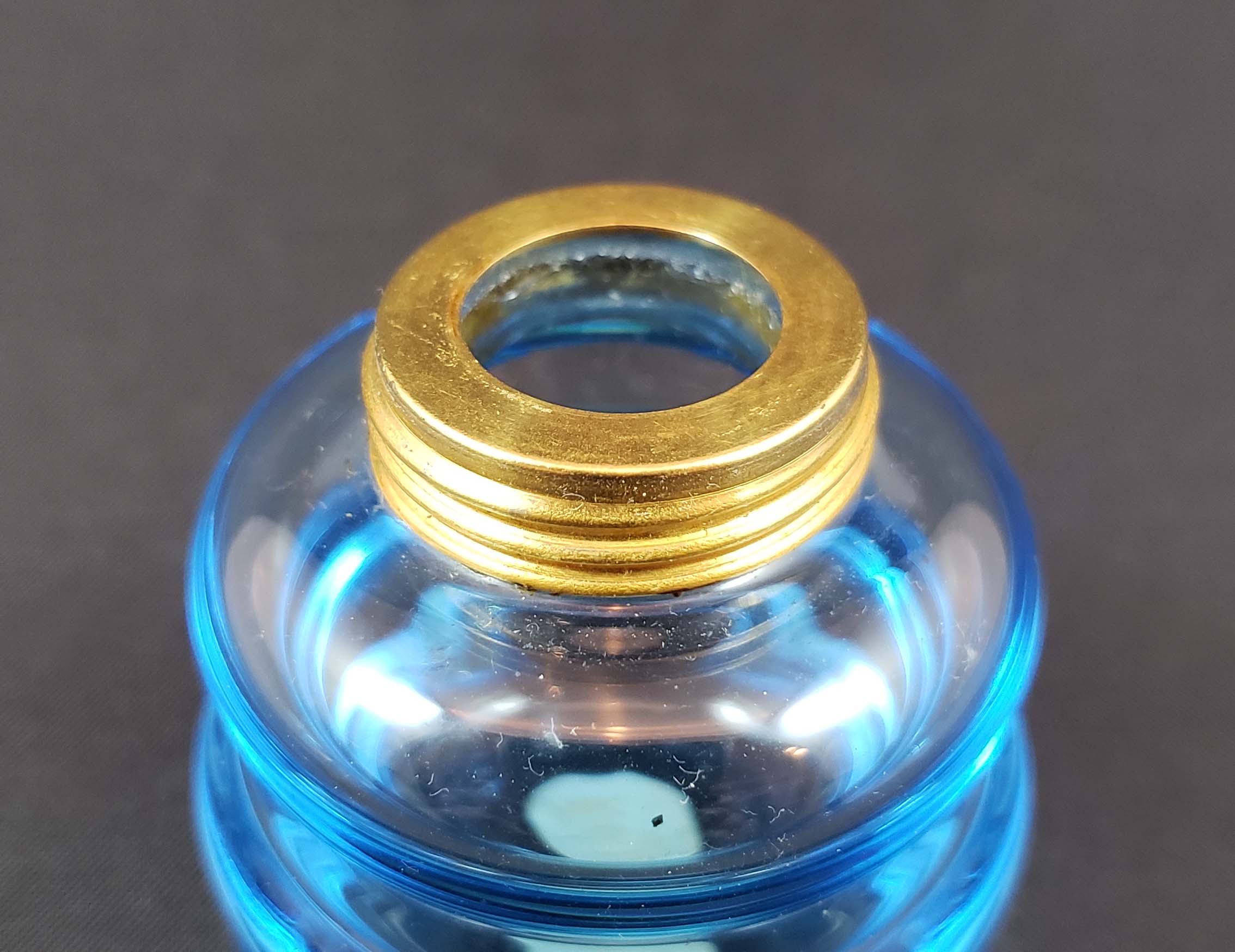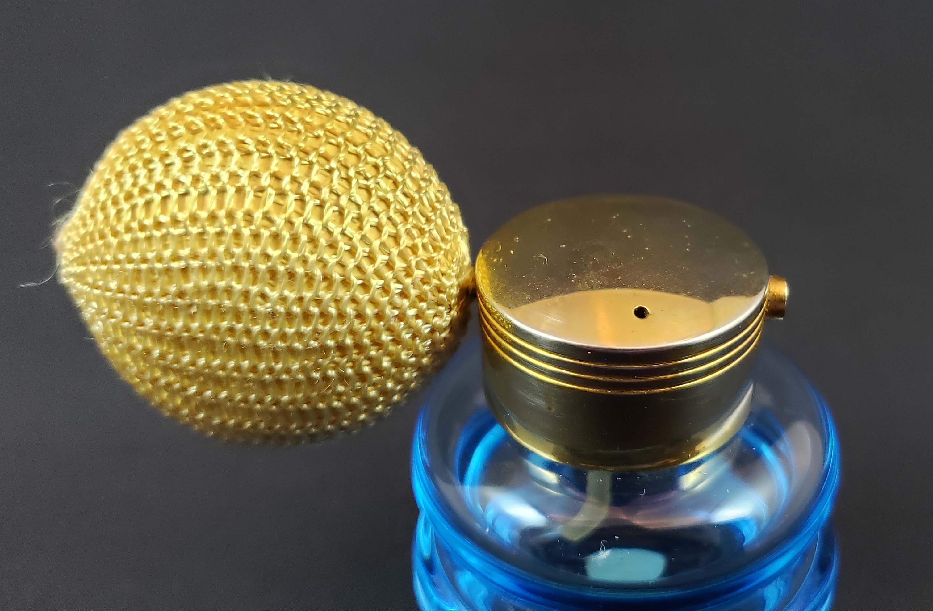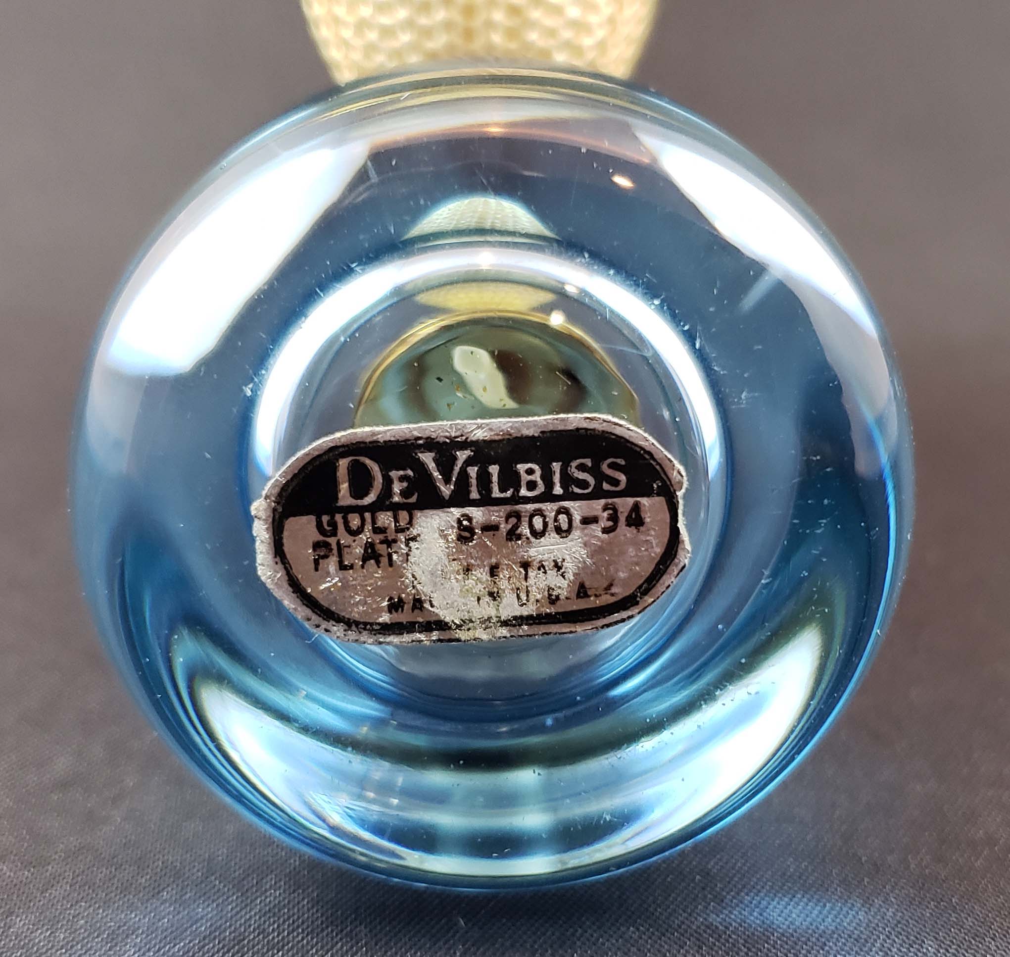 DeVilbiss Perfume Atomizer - 1.25-ounce - Mid-century from 1949 with blue heavy-sham bottle and gold-plated spray fittings all in excellent condition. As shown in DeGraaf-Mack DeVilbiss book on page 265. Height 2.5 inches. Original ball is hardened. DeVilbiss factory sticker on bottom.