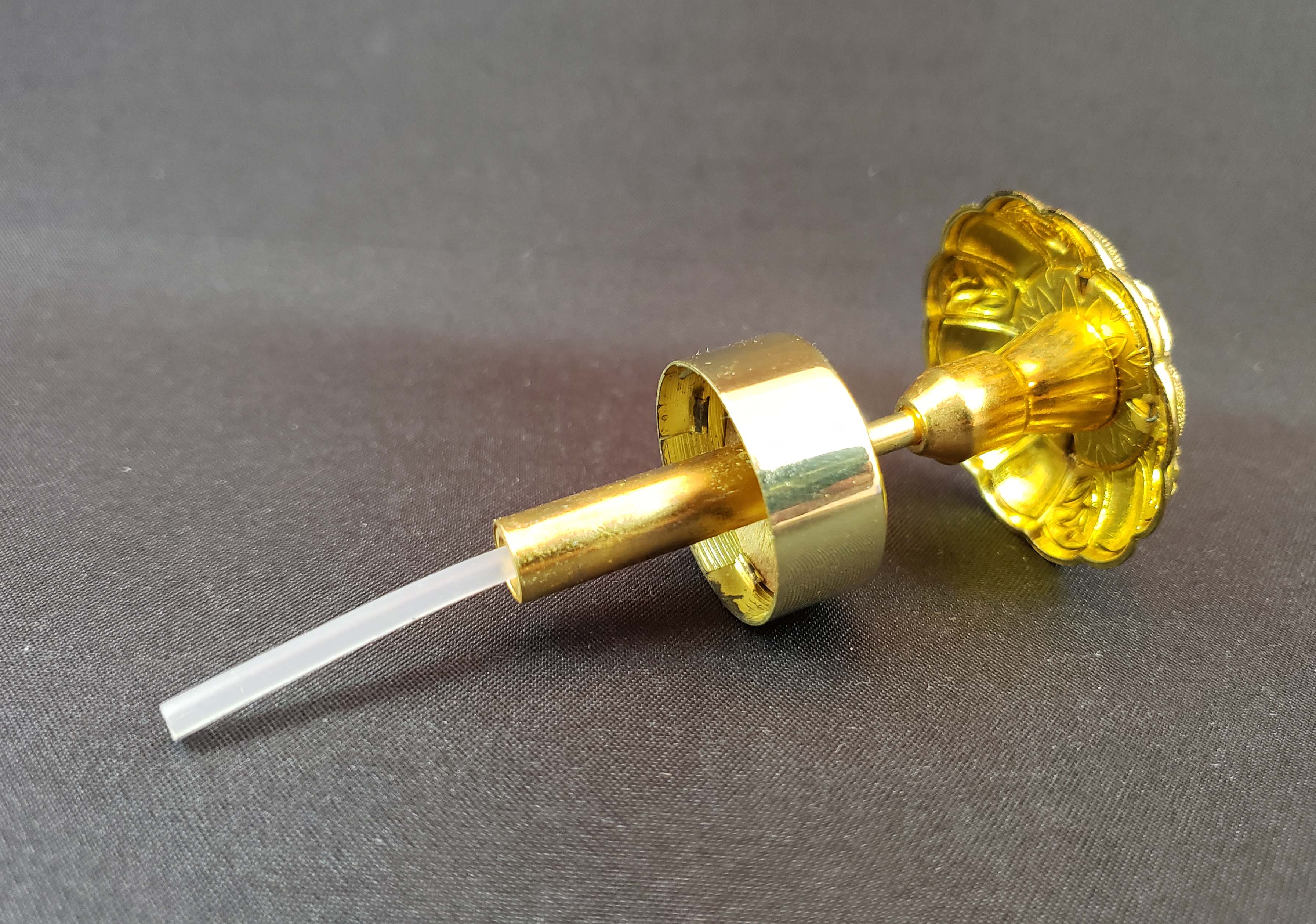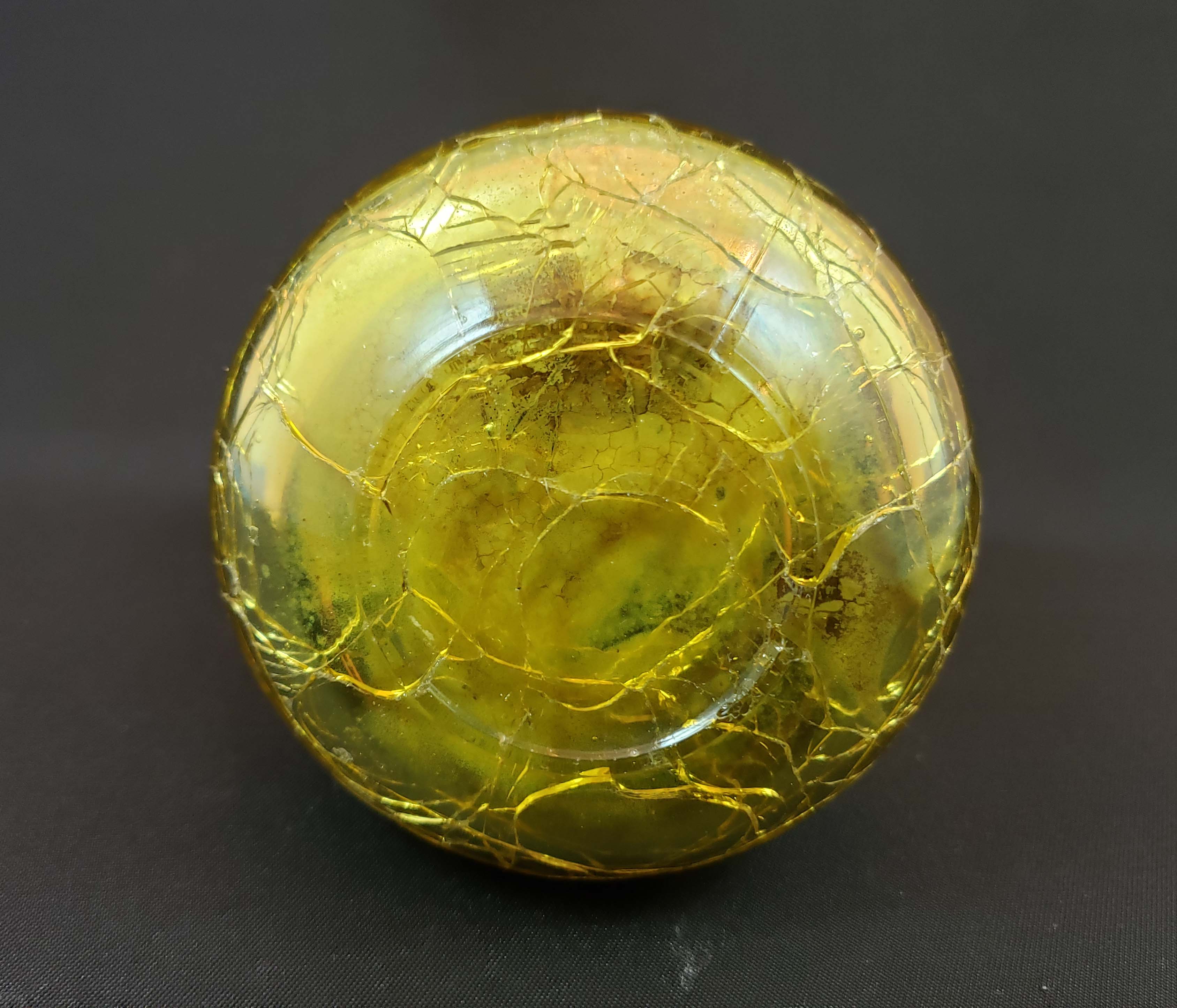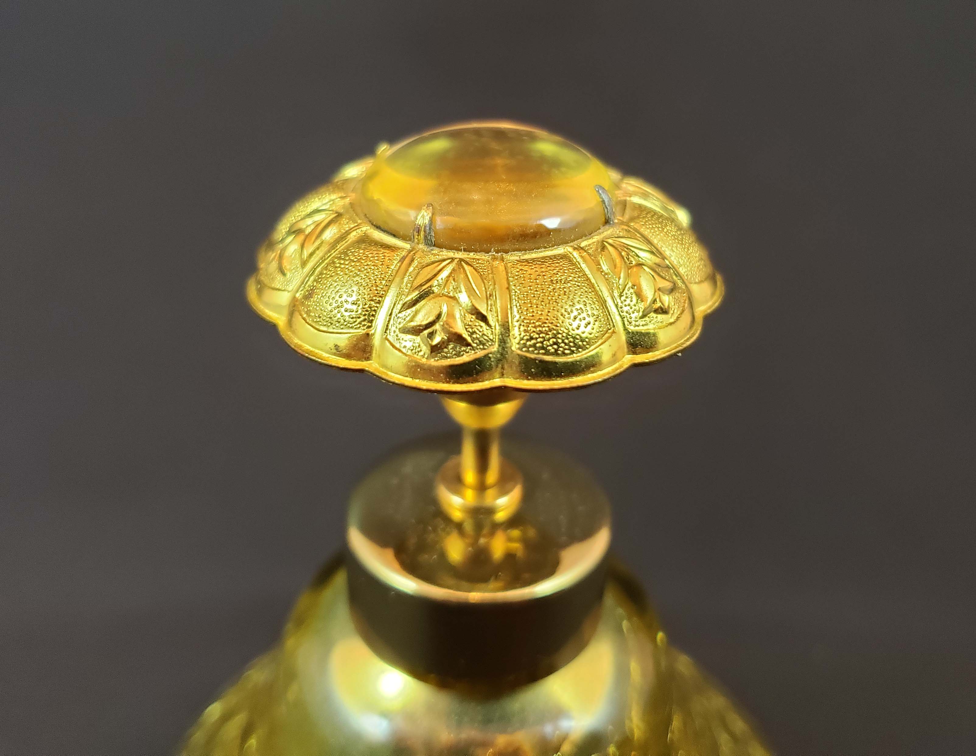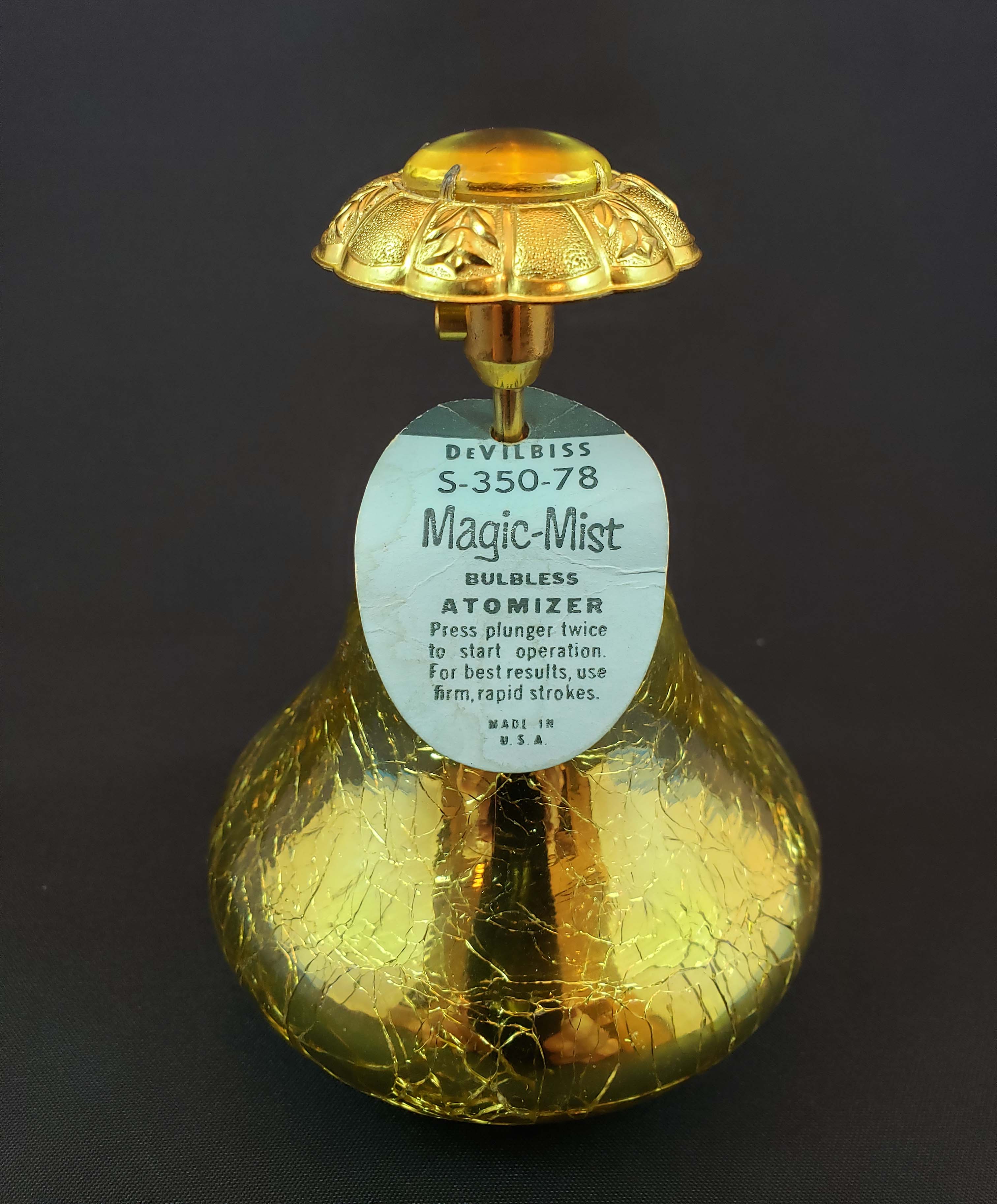 DeVilbiss Perfume Atomizer - Magic Mist model S350-78 gold crackle bottle and gold plated spray fittings with original store tag, from 1961. Matching gold glass jewel on top of spray plunger. Never used and in like-new condition. This bottle is pictured in the DeGraaf-Mack DeVilbiss book on page 276. Stands 4 1/2 inches tall.
