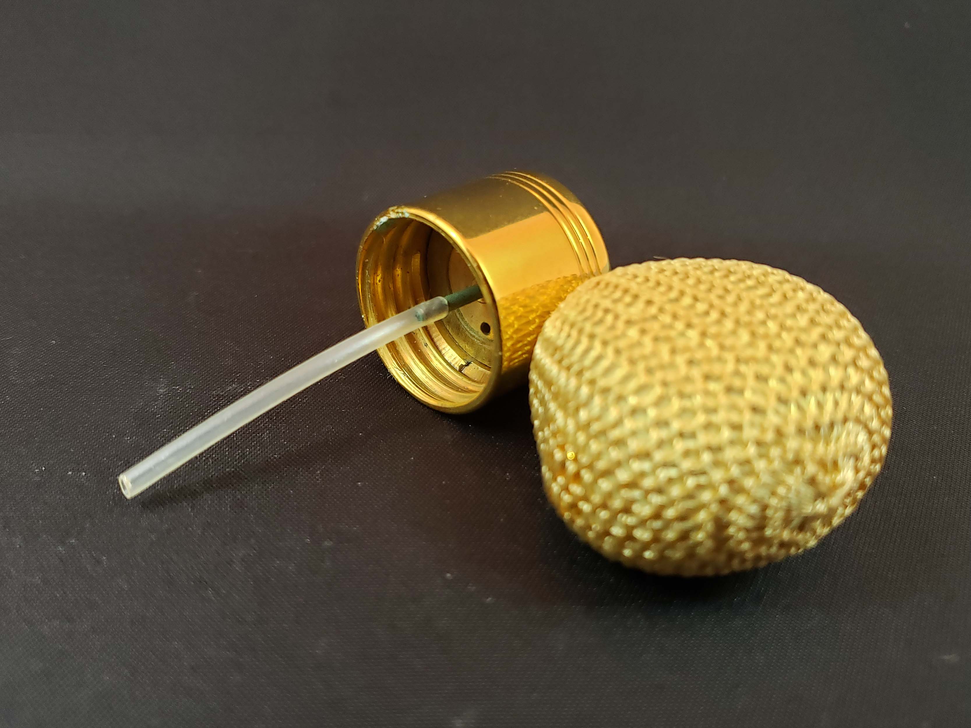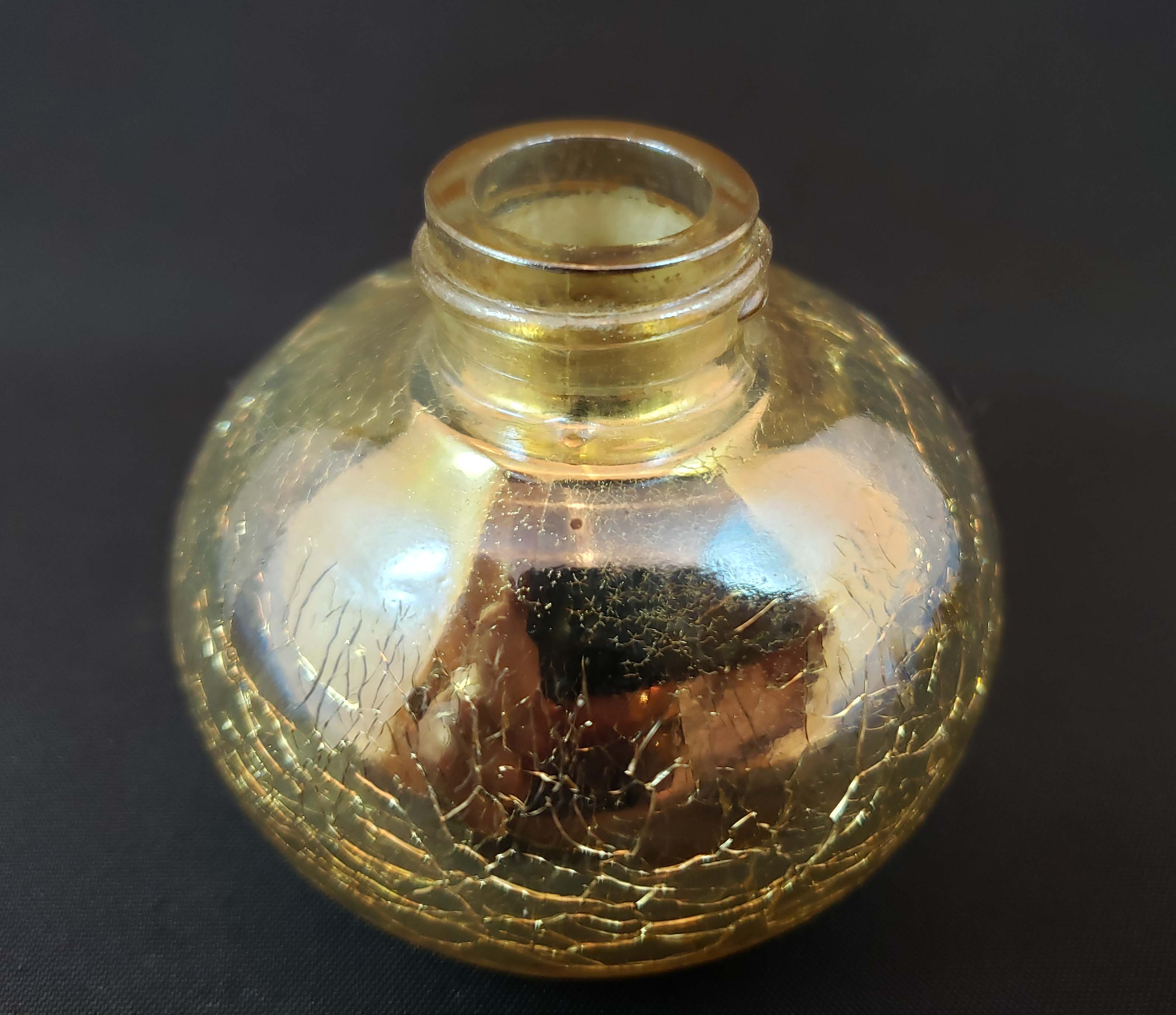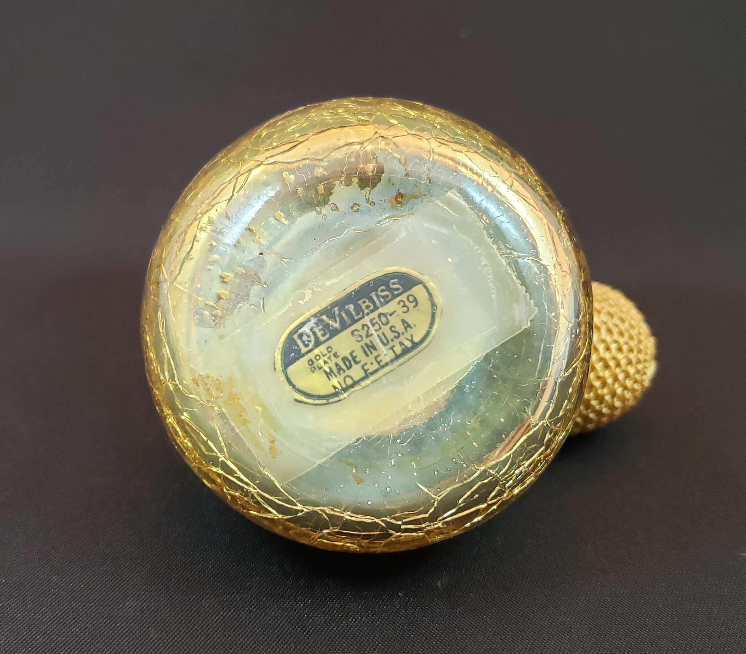 DeVilbiss Perfume Atomizer in Gold Crackle Glass, shown in DeVilbiss 1949 catalog. DeVilbiss Catalog number S250-29. Gold Plated atomizer fittings in excellent condition, as is the bottle itself. The ball is hardened and the rubber is detached but held in place by the silk netting. This bottle is shown on page 276 of the DeGraaf-Mack DeVilbiss book. Height 2 1/2 inches.