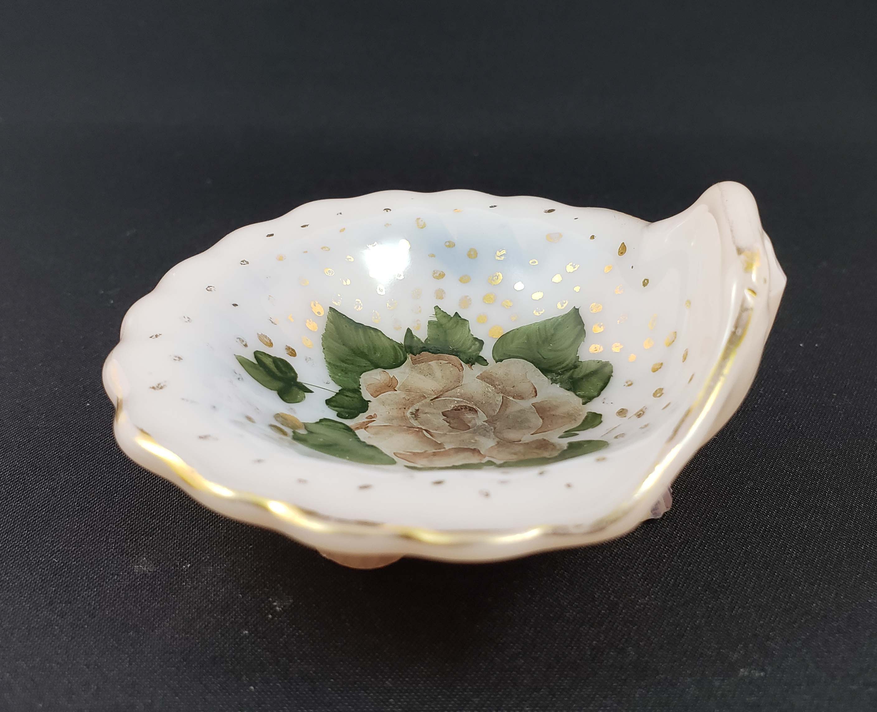 Cambridge Crown Tuscan Seashell 3-inch three-footed dish. Decorated by Charleton with a pink and green floral pattern and trimmed with gold enamel. In excellent condition with minor wear to the gold on the rim.