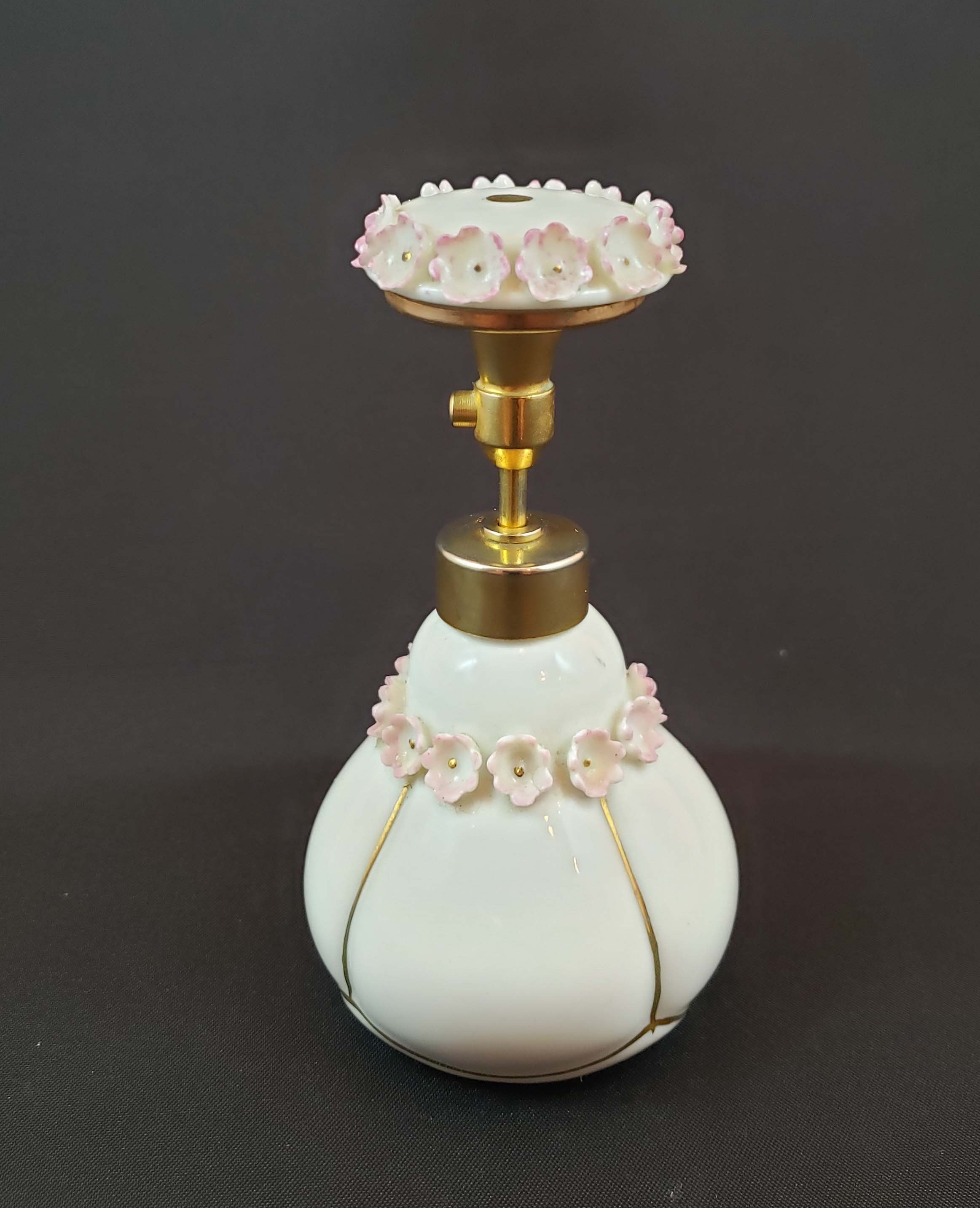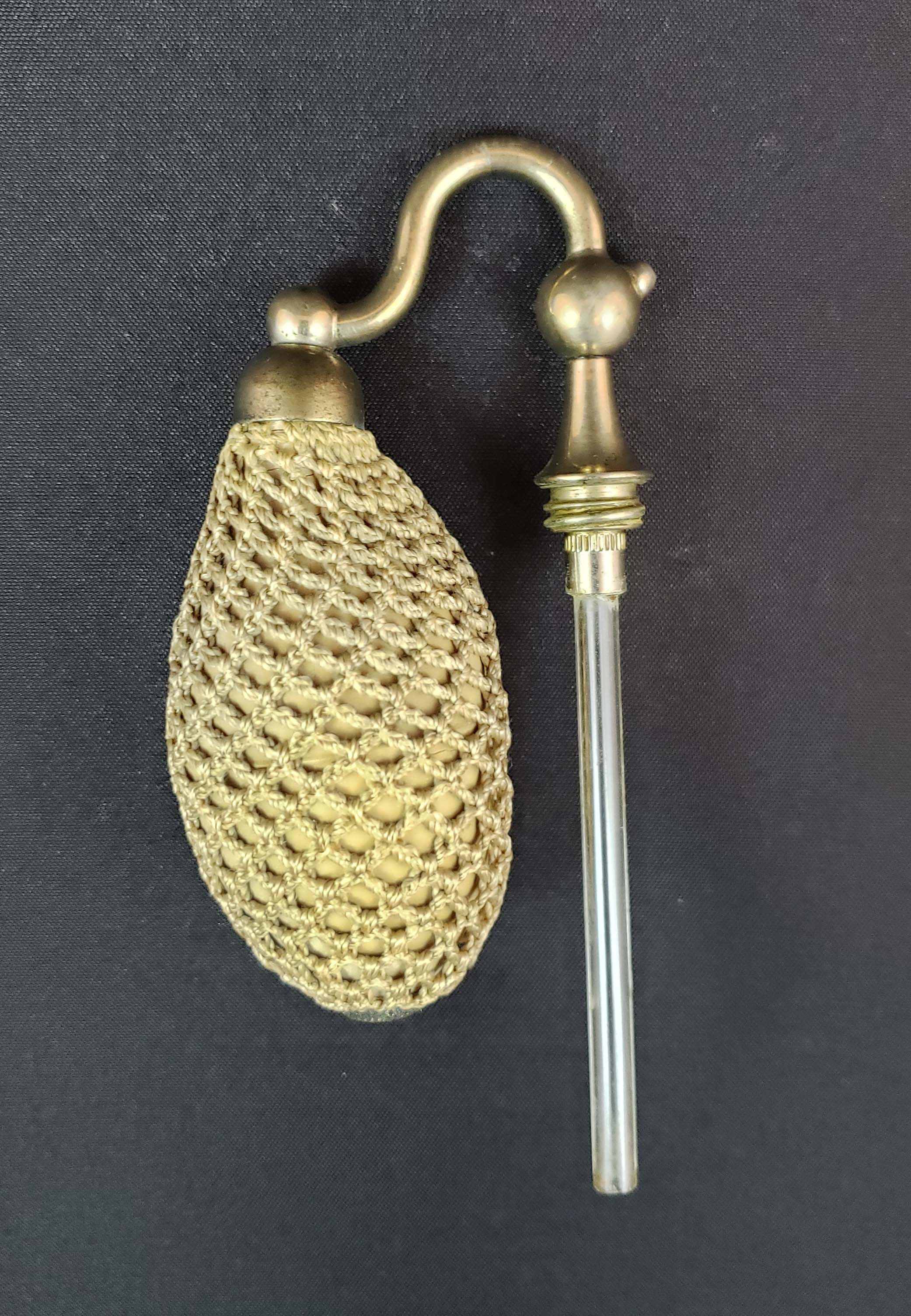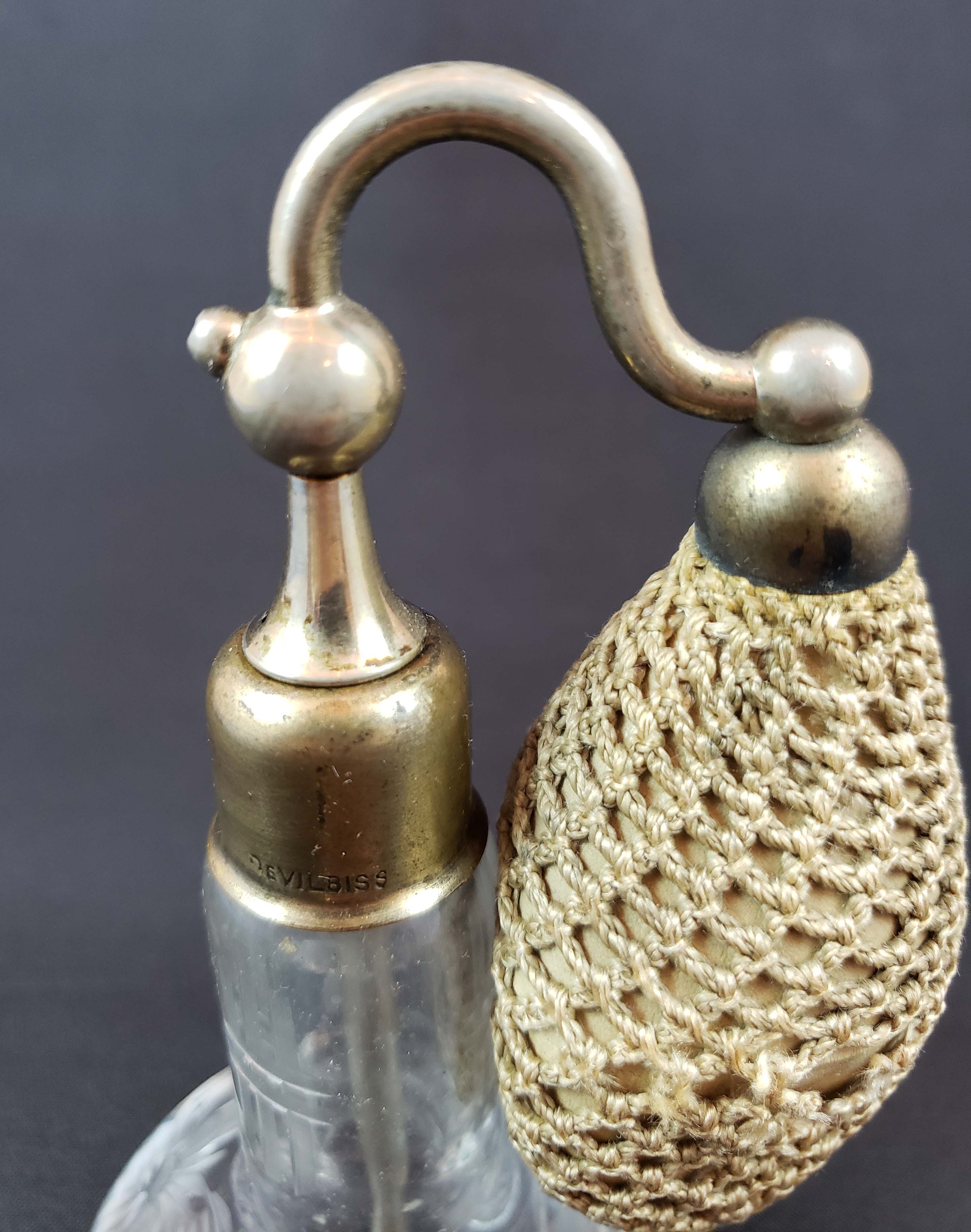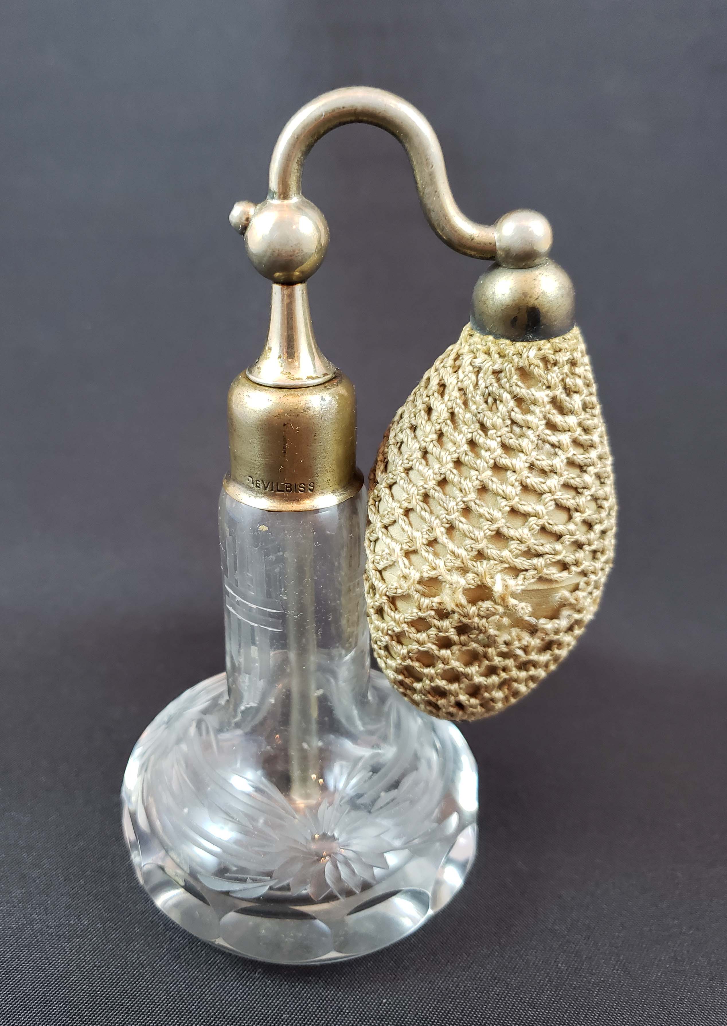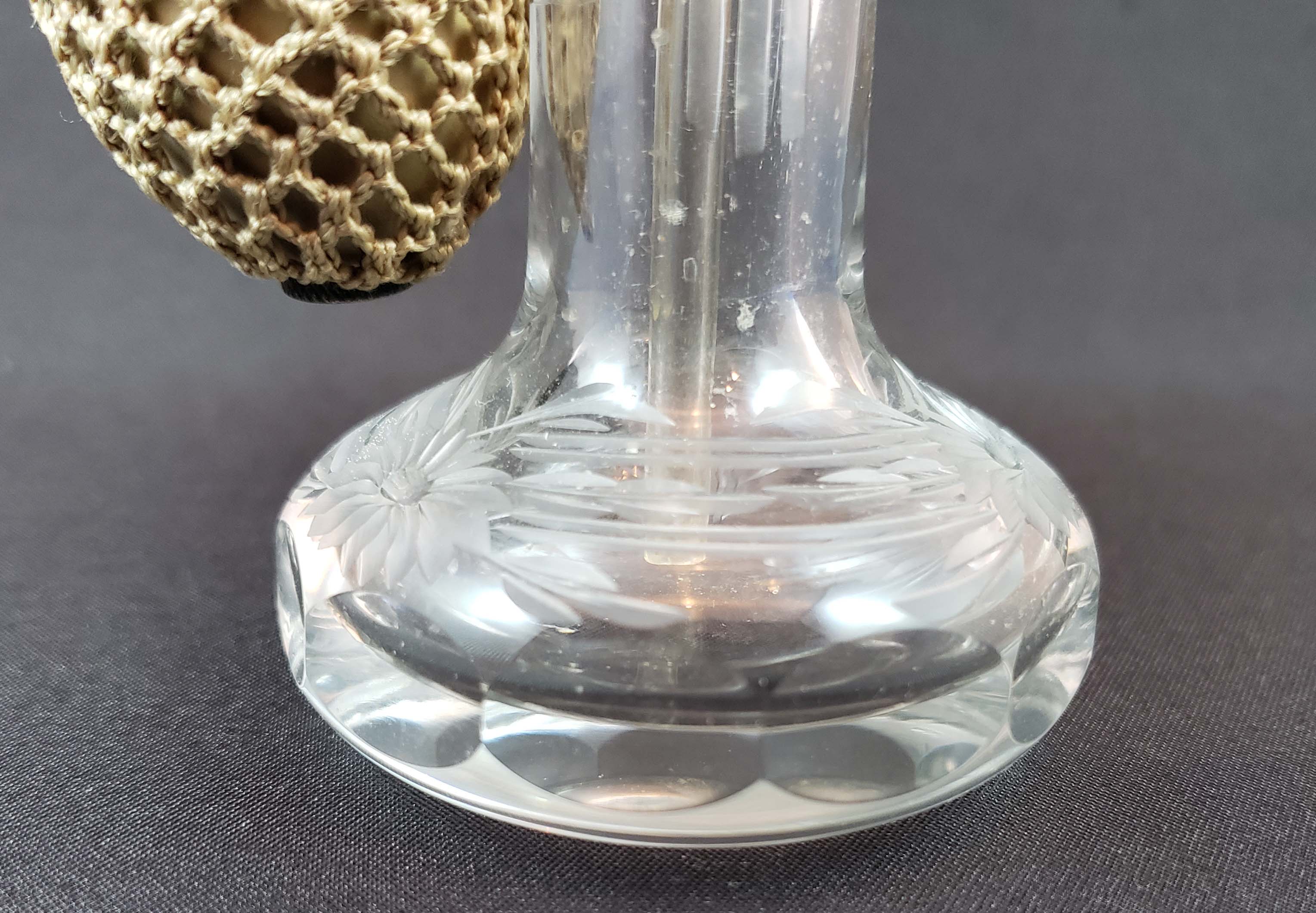 DeVilbiss Perfume Atomizer - Cut Crystal from 1924 - nickel fittings. DeVilbiss catalog number G-5. The bottle is a heavy premium glass both cut and engraved with facets ground around the base. Nickel fittings show some wear. Siphon tube is present. The collar is marked "DeVilbiss" Original silk hand-crocheted netting around hardened rubber ball. There is one area of torn netting as shown. Polished bottom. Height 4 1/2 inches. Overall good condition for its age.