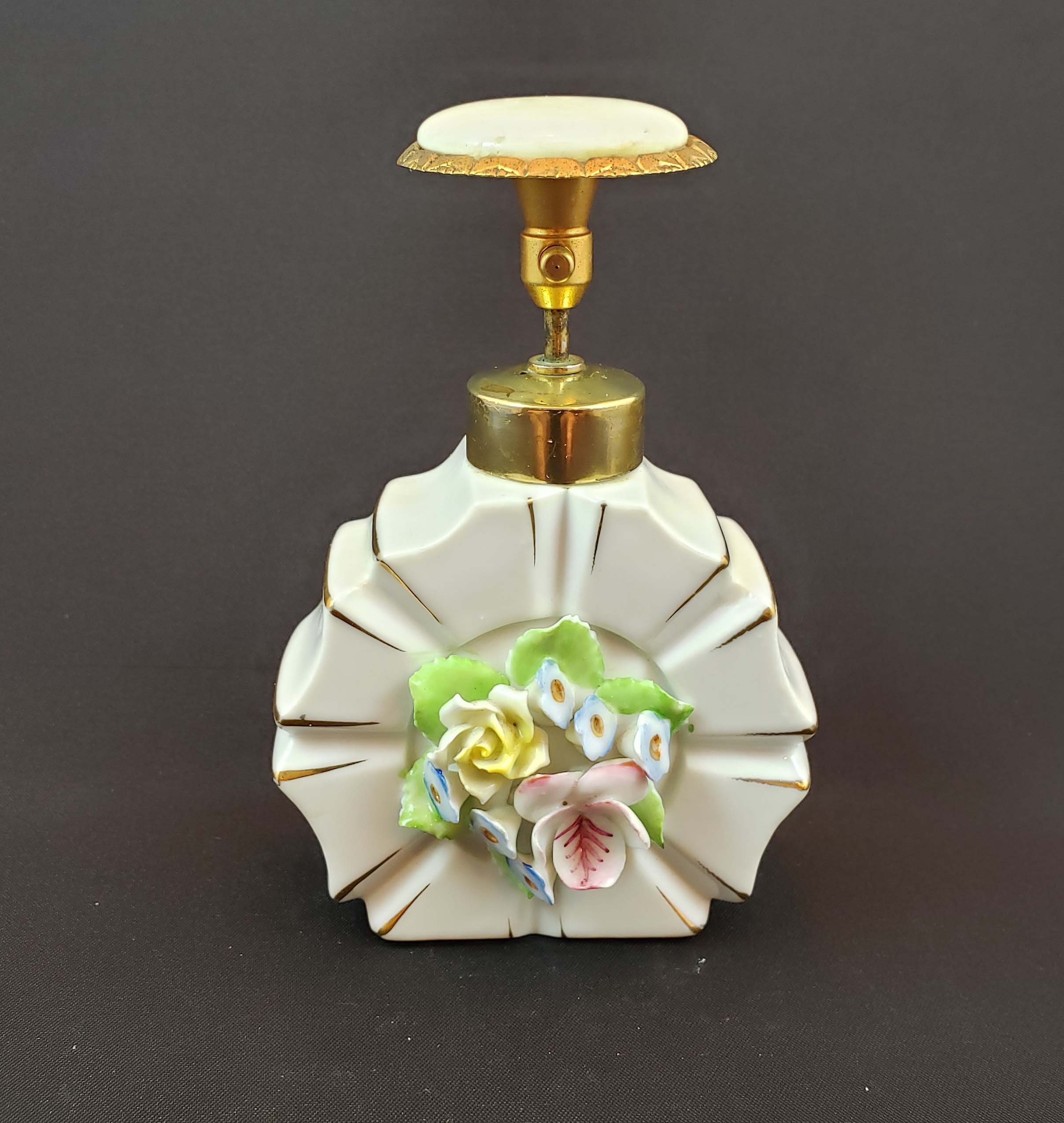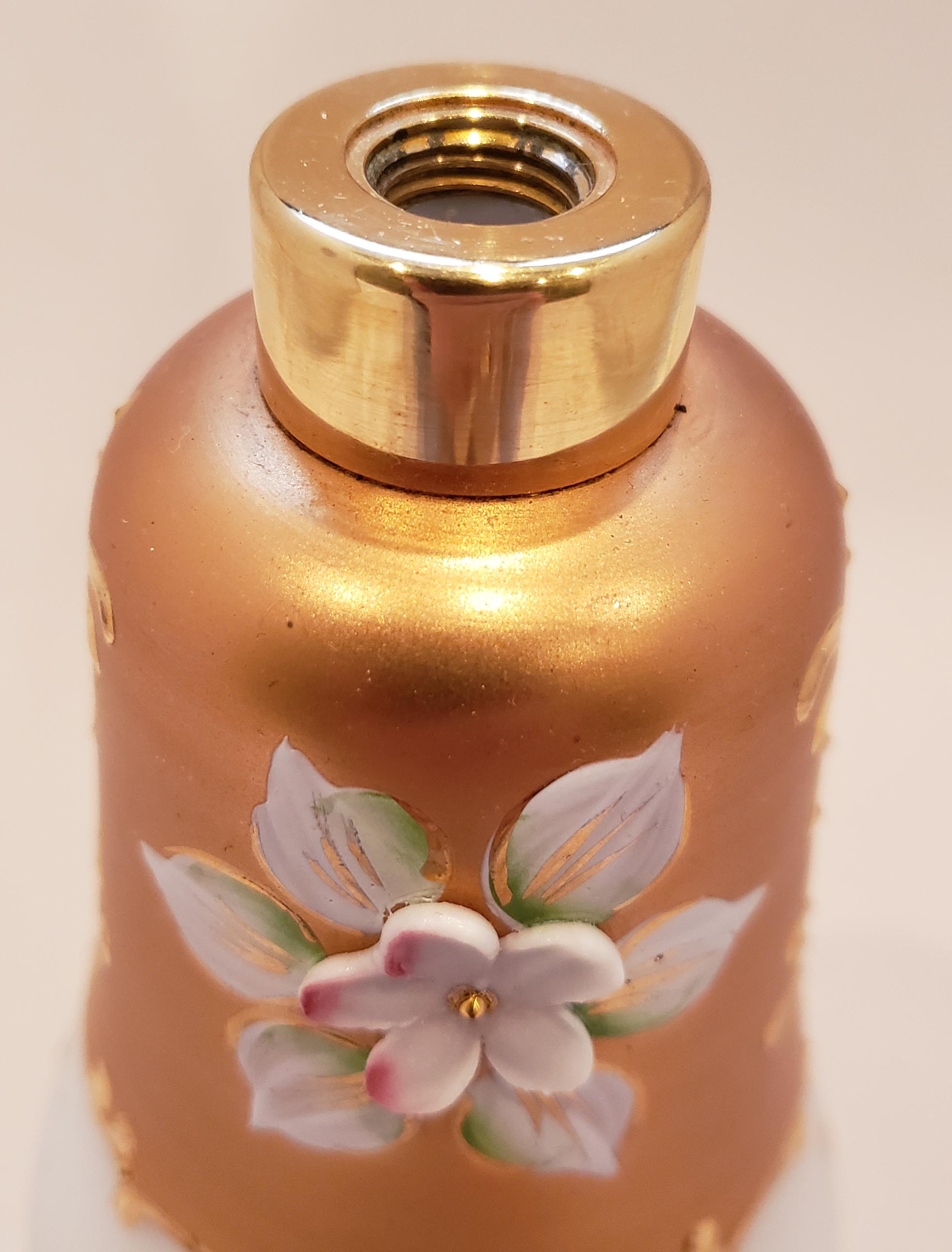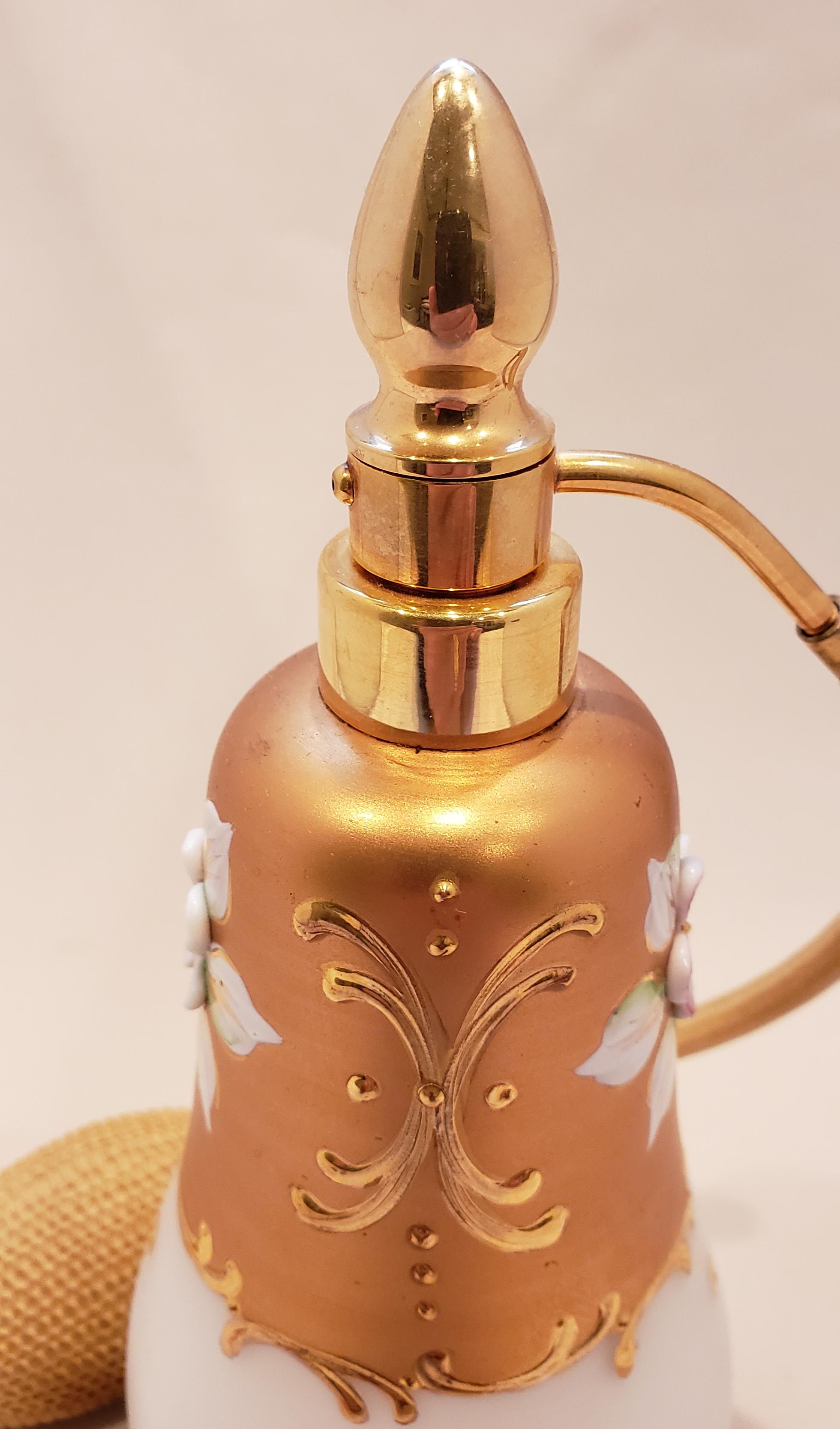Beautiful DeVilbiss Perfume Atomizer and Dropper set from 1959 with "triplex" (3-layered) glass from West Germany's Wittig Glas company. Enameled hand-painted gold decoration with applied porcelain flower petals. Shown in DeGraaf-Mack DeVilbiss Perfume Bottles book, 282. Gold plated spray fitting. Both bottles In excellent condition, with single exception of a chip out of the underside of the stopper as show. This is not visible with the stopper in the bottle. Original bulb and cord on the atomizer - ball has hardened. 7 inches.