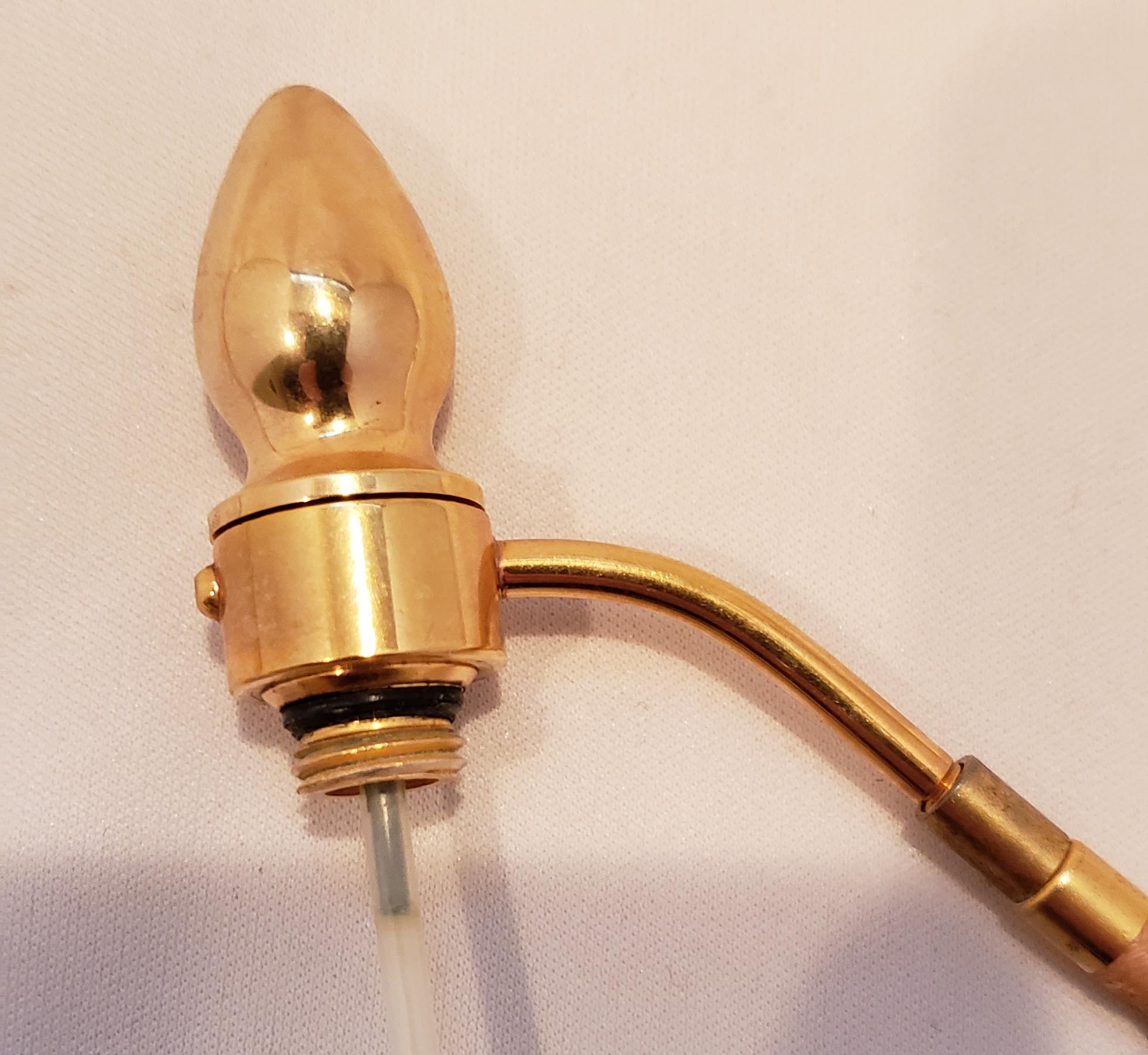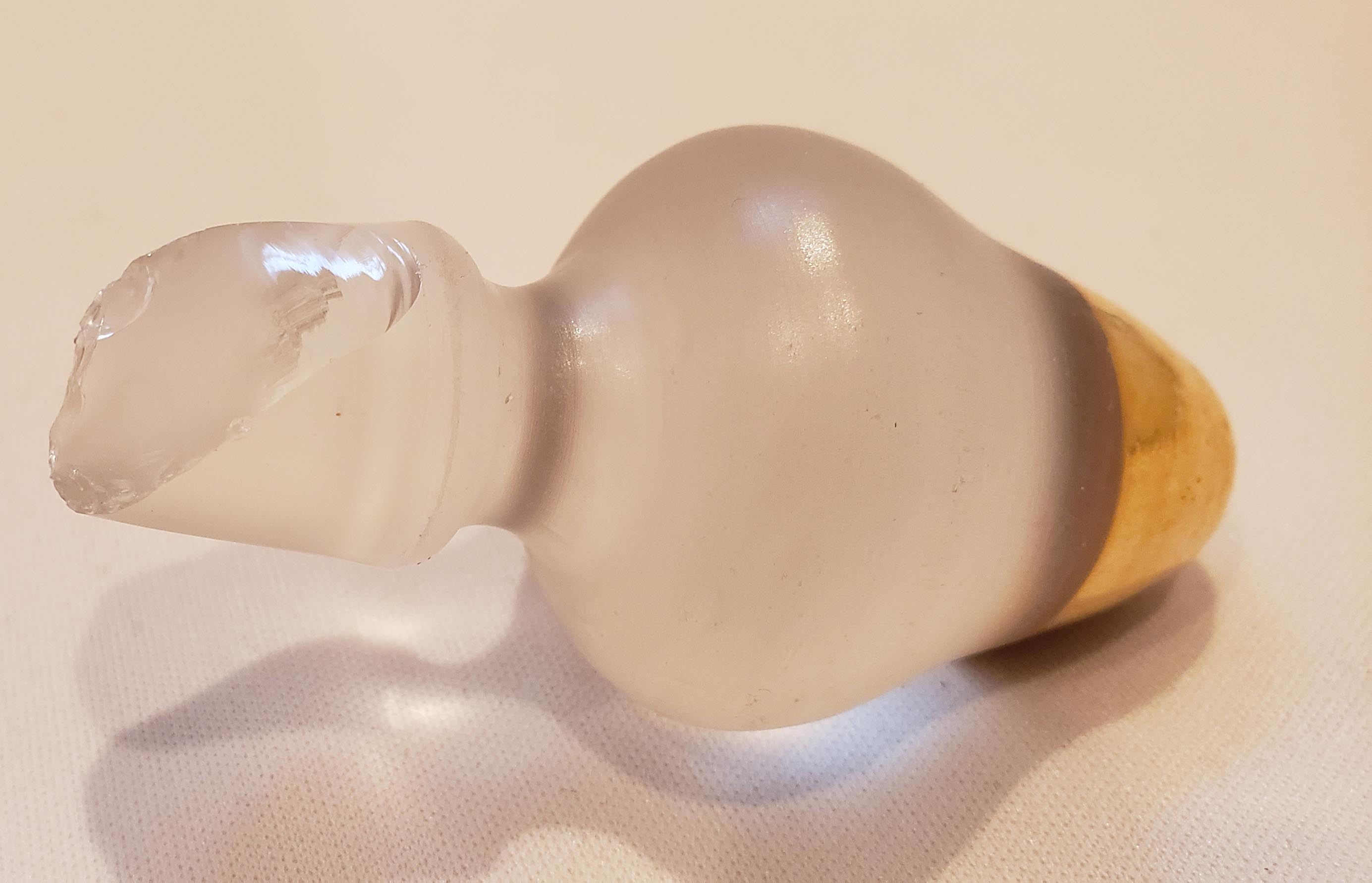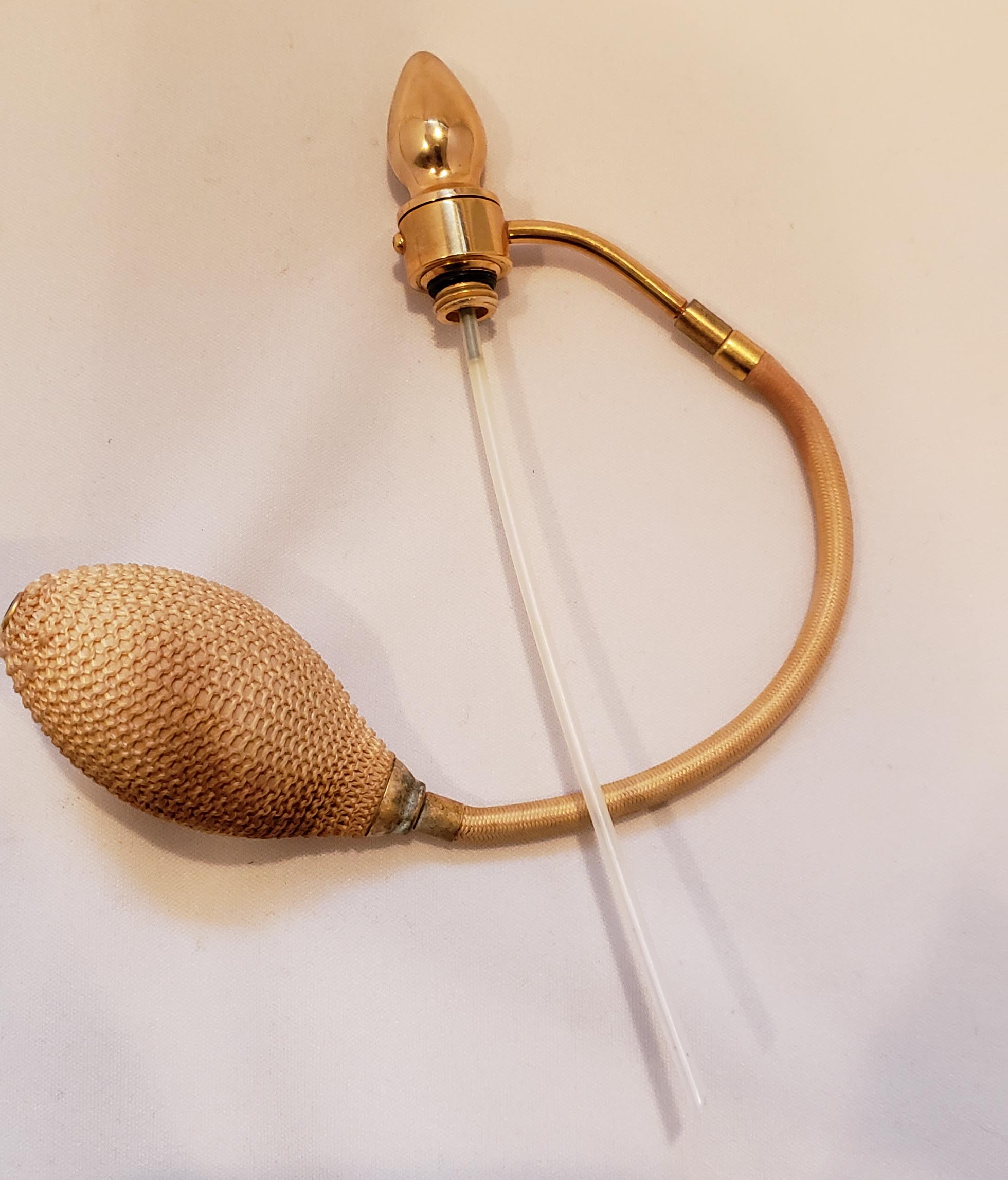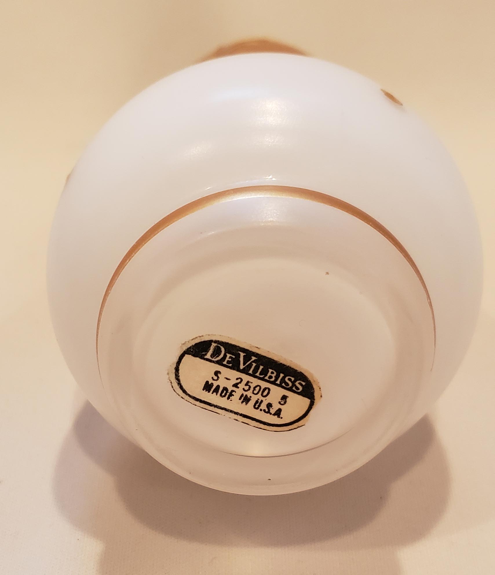 Beautiful DeVilbiss Perfume Atomizer and Dropper set from 1959 with "triplex" (3-layered) glass from West Germany's Wittig Glas company. Enameled hand-painted gold decoration with applied porcelain flower petals. Shown in DeGraaf-Mack DeVilbiss Perfume Bottles book, 282. Gold plated spray fitting. Both bottles In excellent condition, with single exception of a chip out of the underside of the stopper as show. This is not visible with the stopper in the bottle. Original bulb and cord on the atomizer - ball has hardened. 7 inches.