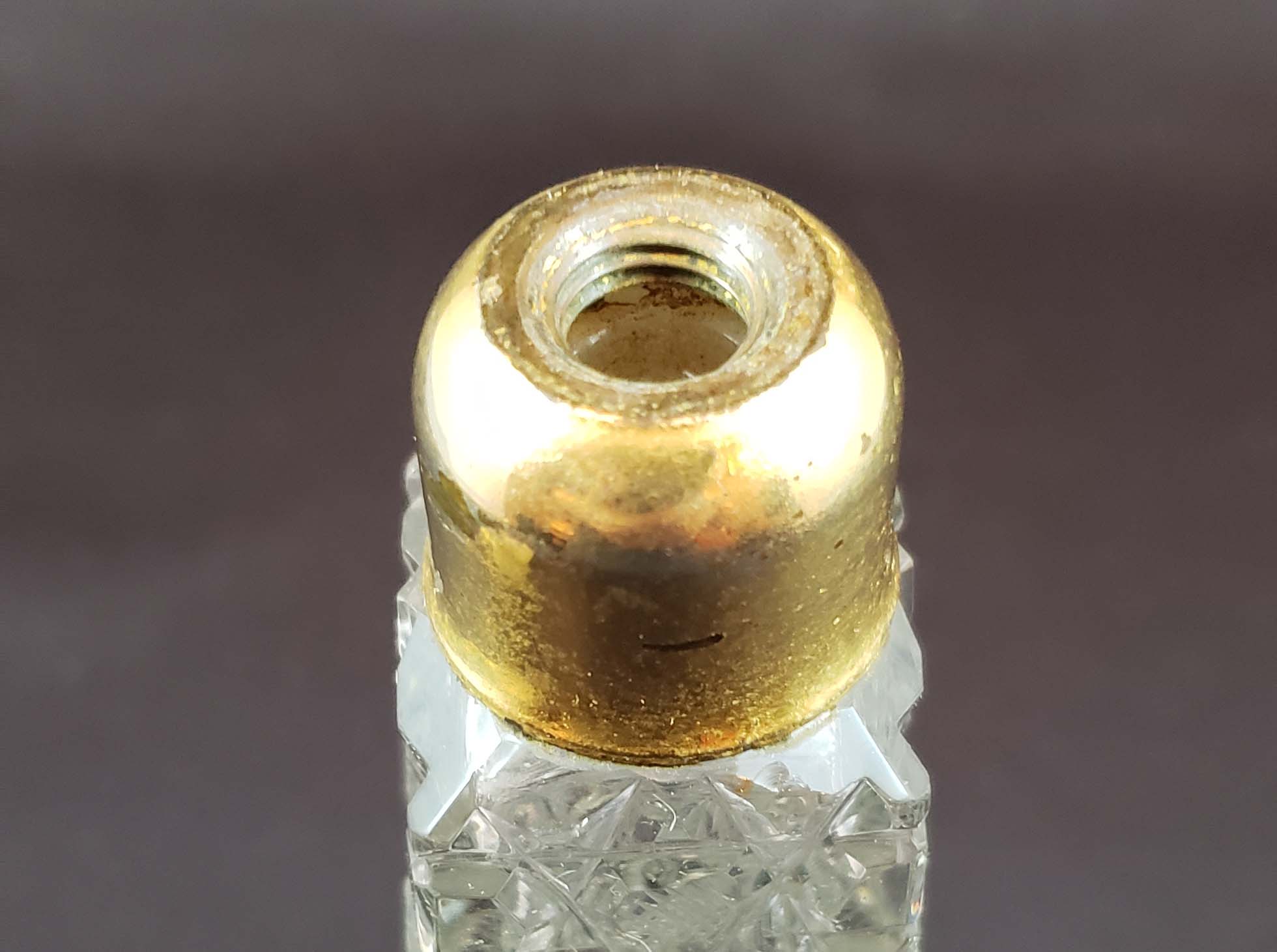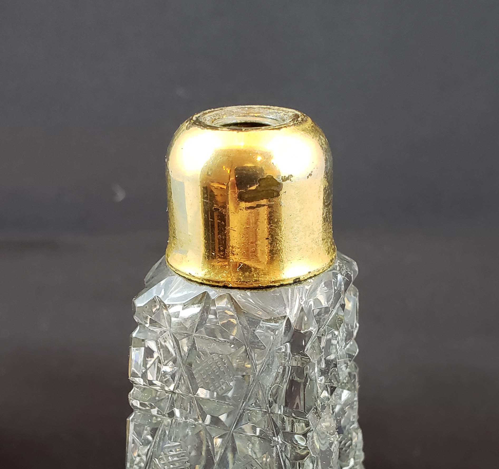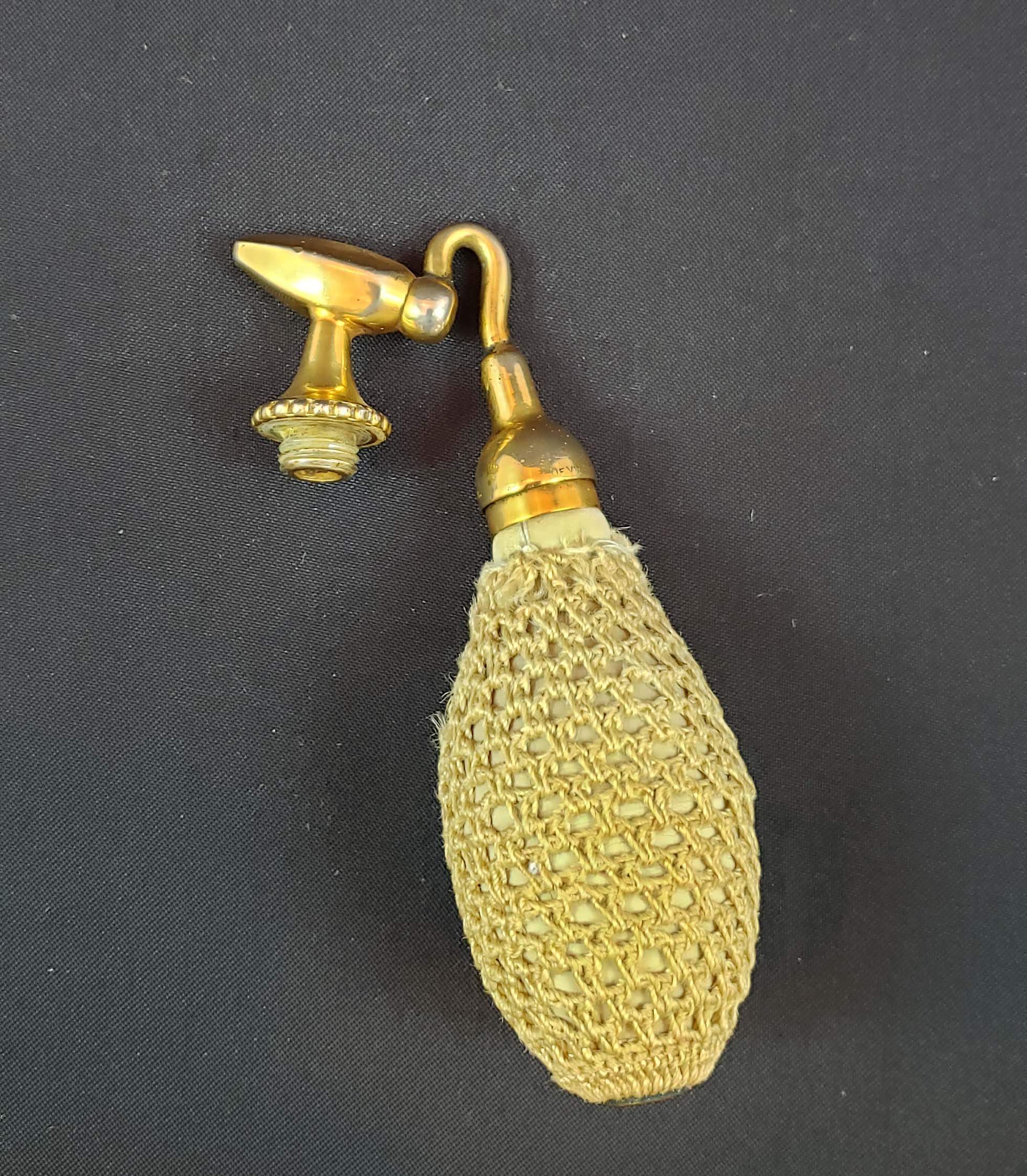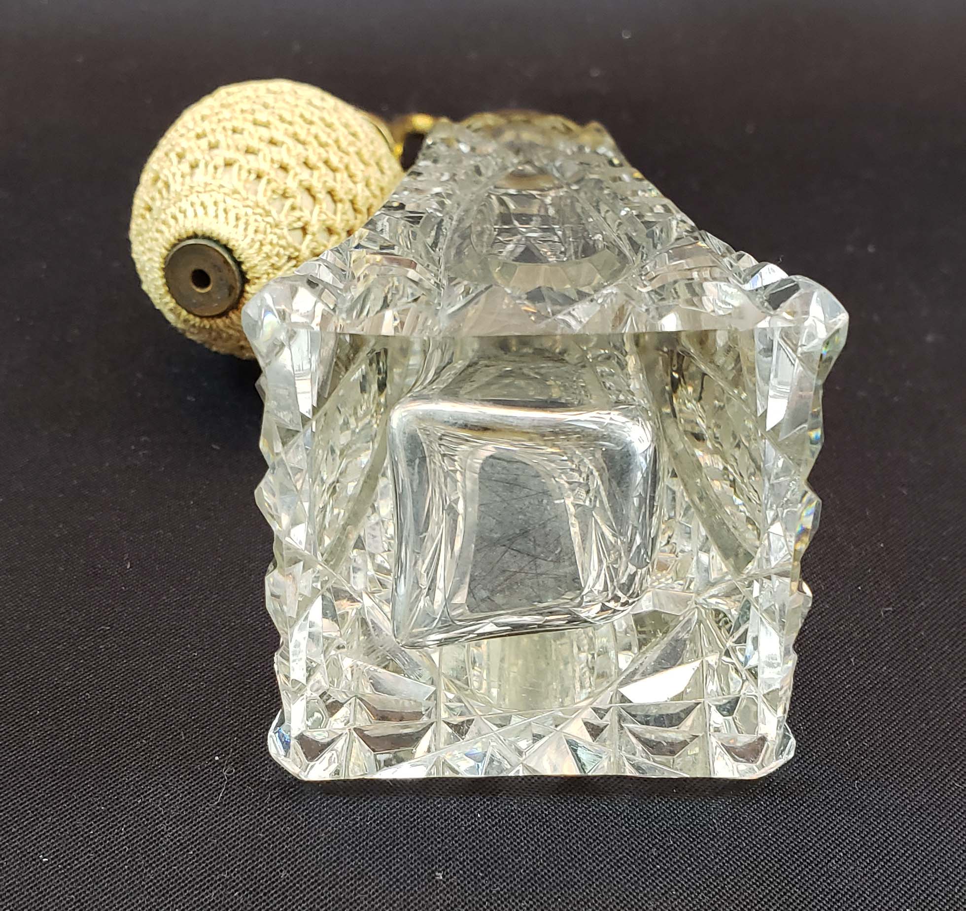 Brilliant Cut DeVilbiss Perfumizer from 1914. Beautifully clear glass with no dings or scratches. Polished bottom. Seen in 1914 DeVilbiss ad as Perfumizer number 2412. Gold-plated fittings and original ball (hardened). The crocheted silk netting has pulled back a short distance from the top. Three minor spots on the collar where the gold is worn. Siphon tube inside is missing. Marked on collar of the spray arm (just above the bulb) "DeVilbiss Patented September 15, 1908" Bottle is pictured in Mack-DeGraaf DeVilbiss book page 54. Height 6.5 inches.