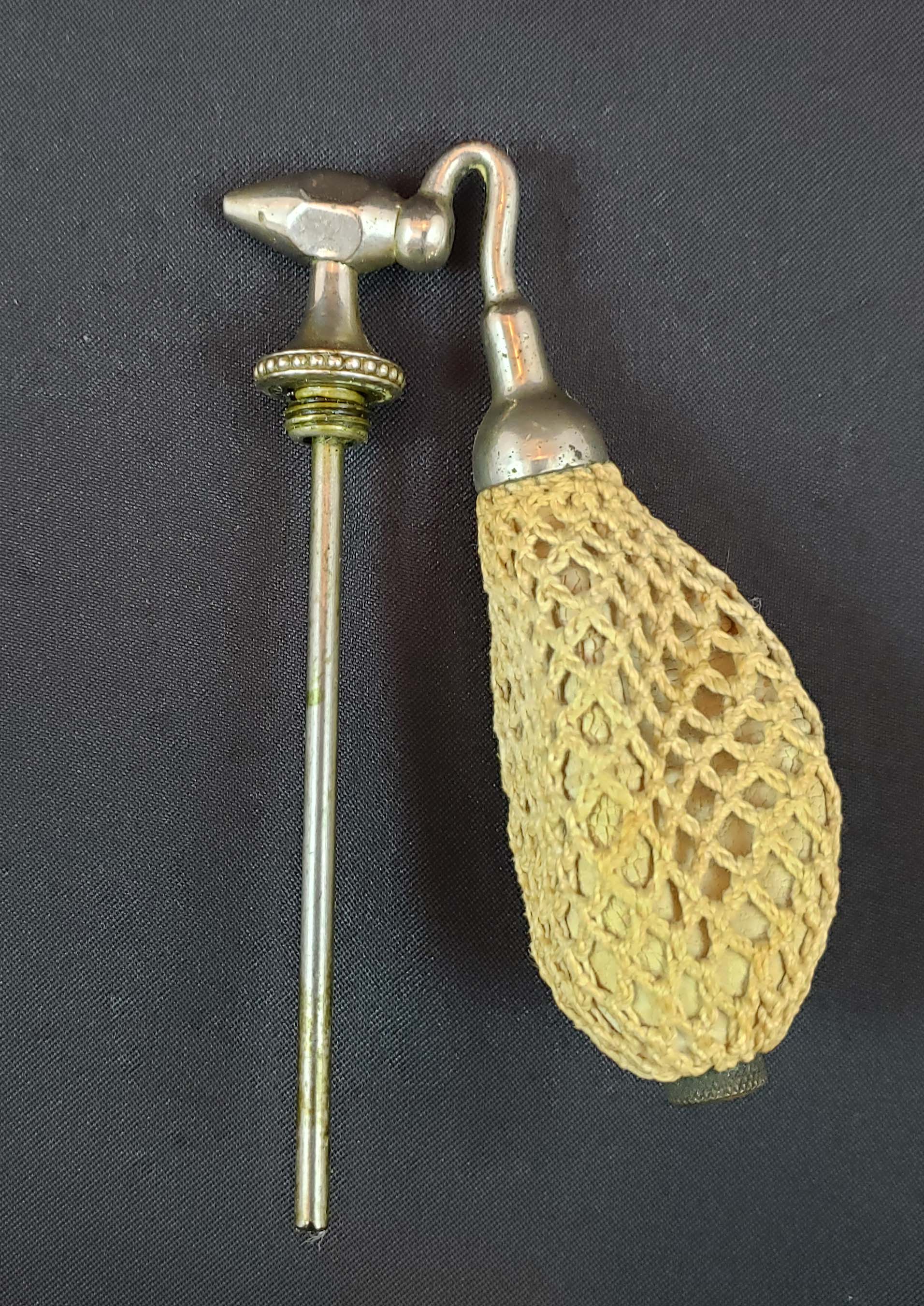 DeVilbiss "Perfumizer" perfume atomizer from 1910. Finely hand cut, polished and beautifully clear glass with no chips or scratches. Polished bottom. Nickel-plated fittings in excellent condition. The ball is original but hardened with hand-crocheted gold silk netting in perfect condition. The metal siphon tube is in place. Height 5 inches.