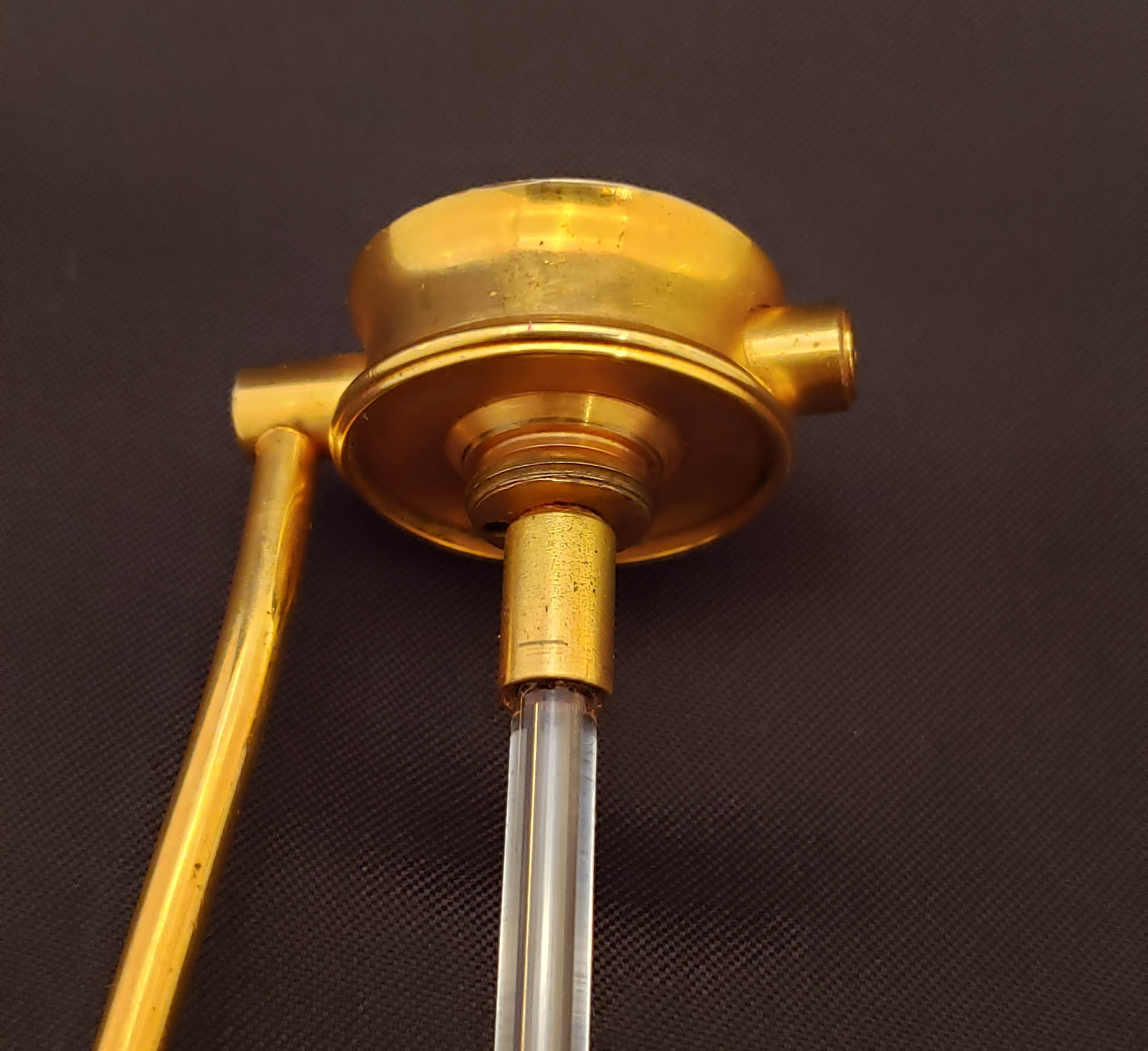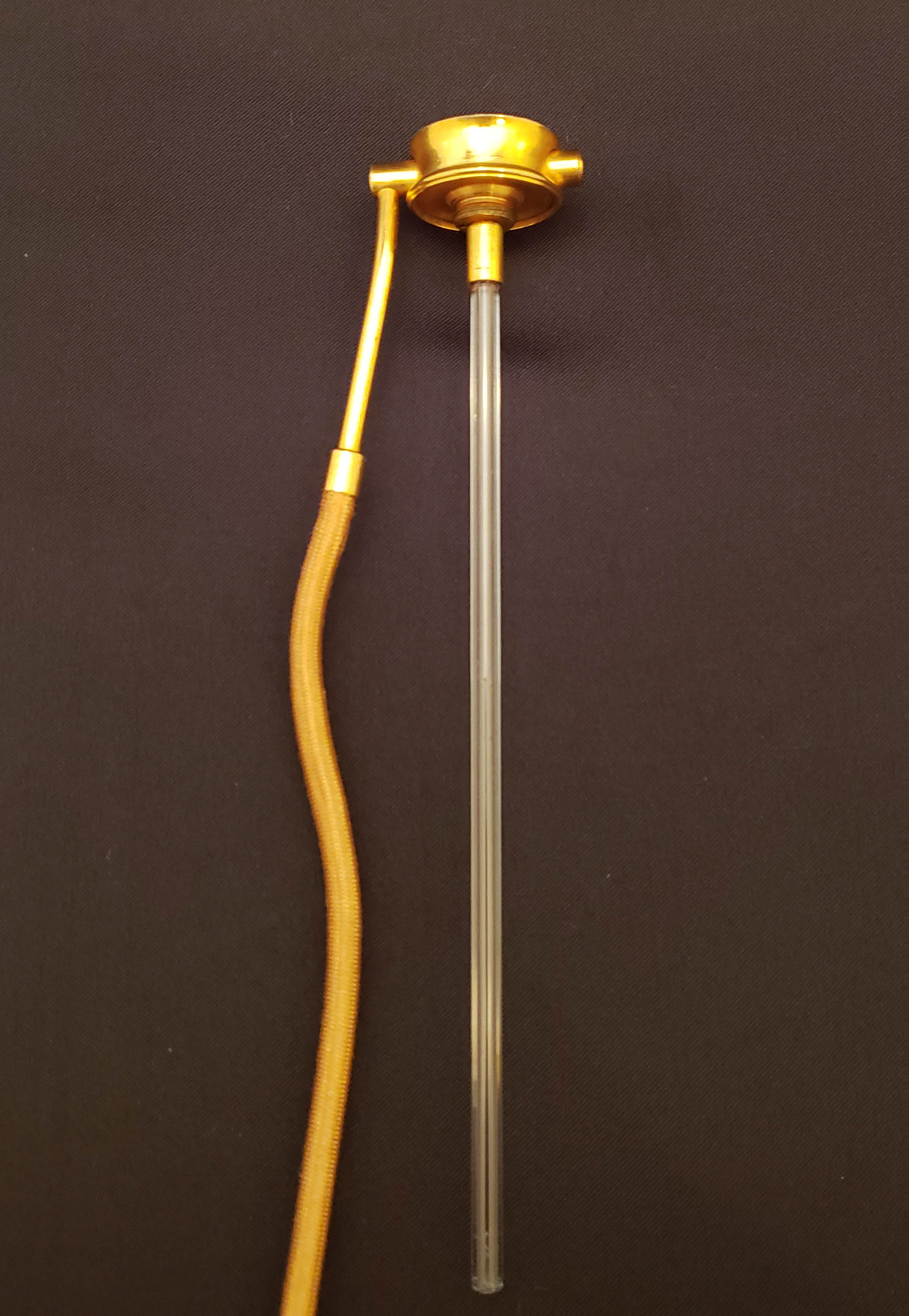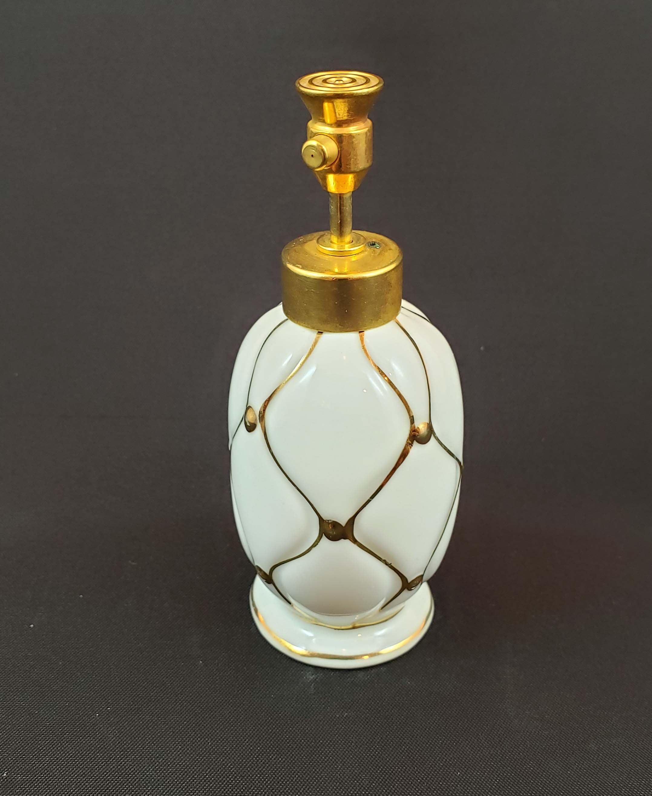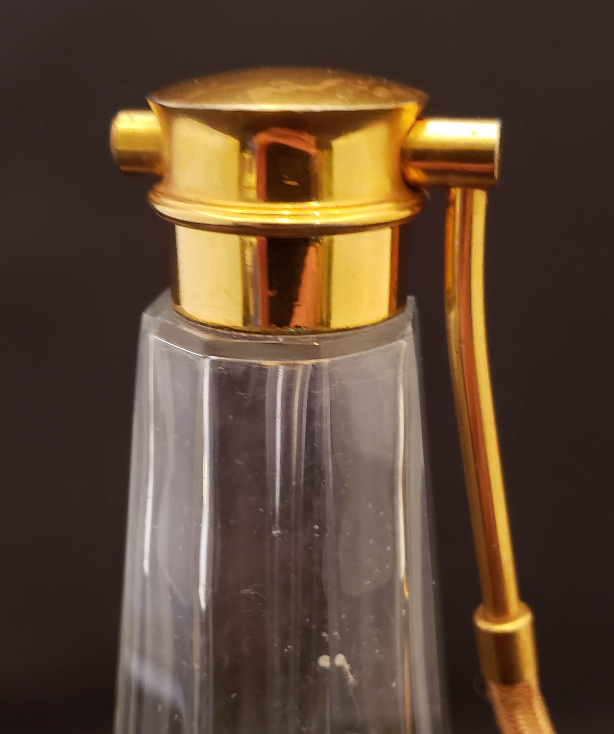 Beautiful and elegant DeVilbiss perfume atomizer from 1940, catalog number S1250-5. This bottle is shown in the DeGraaf-Mack DeVilbiss Perfume Bottles book on page 244. The metal spray fittings are bright gold plated and show no wear, pitting or scratching. The gold arm extending to the cord and ball swings up and down - in the down position the contents are sealed - swing up to spray. DeVilbiss called this a "closure" mechanism. The ball and cord are original, but the rubber ball that would go inside the tassled net is missing. The bottle is in top condition, with no chips, cracks or scratches in the glass. It is 7 1/2 inches tall to top of atomizer head.