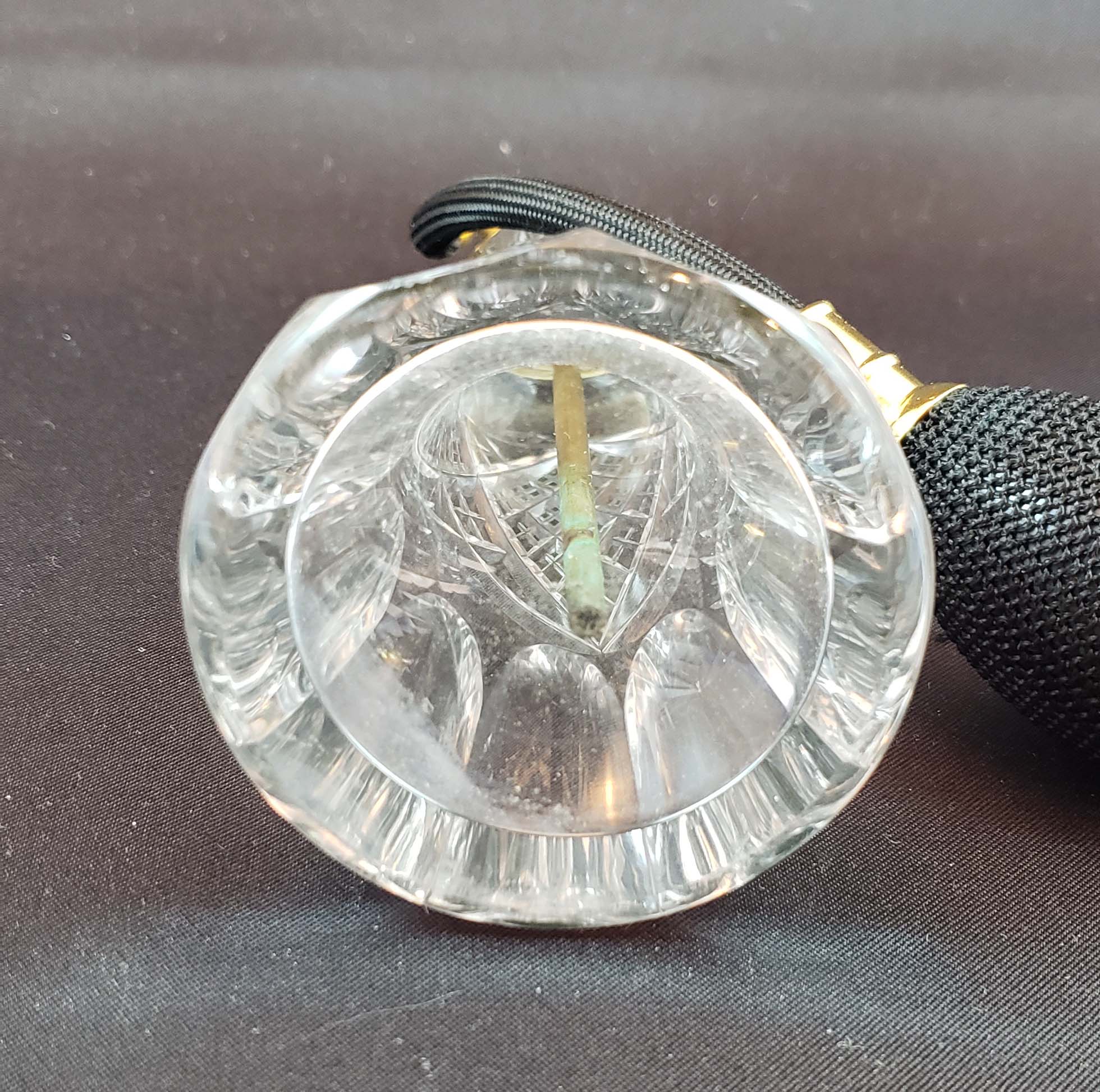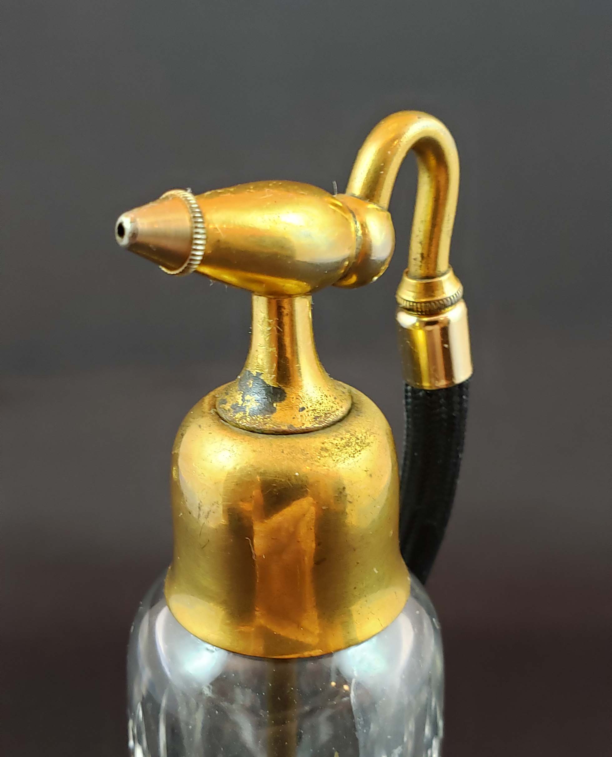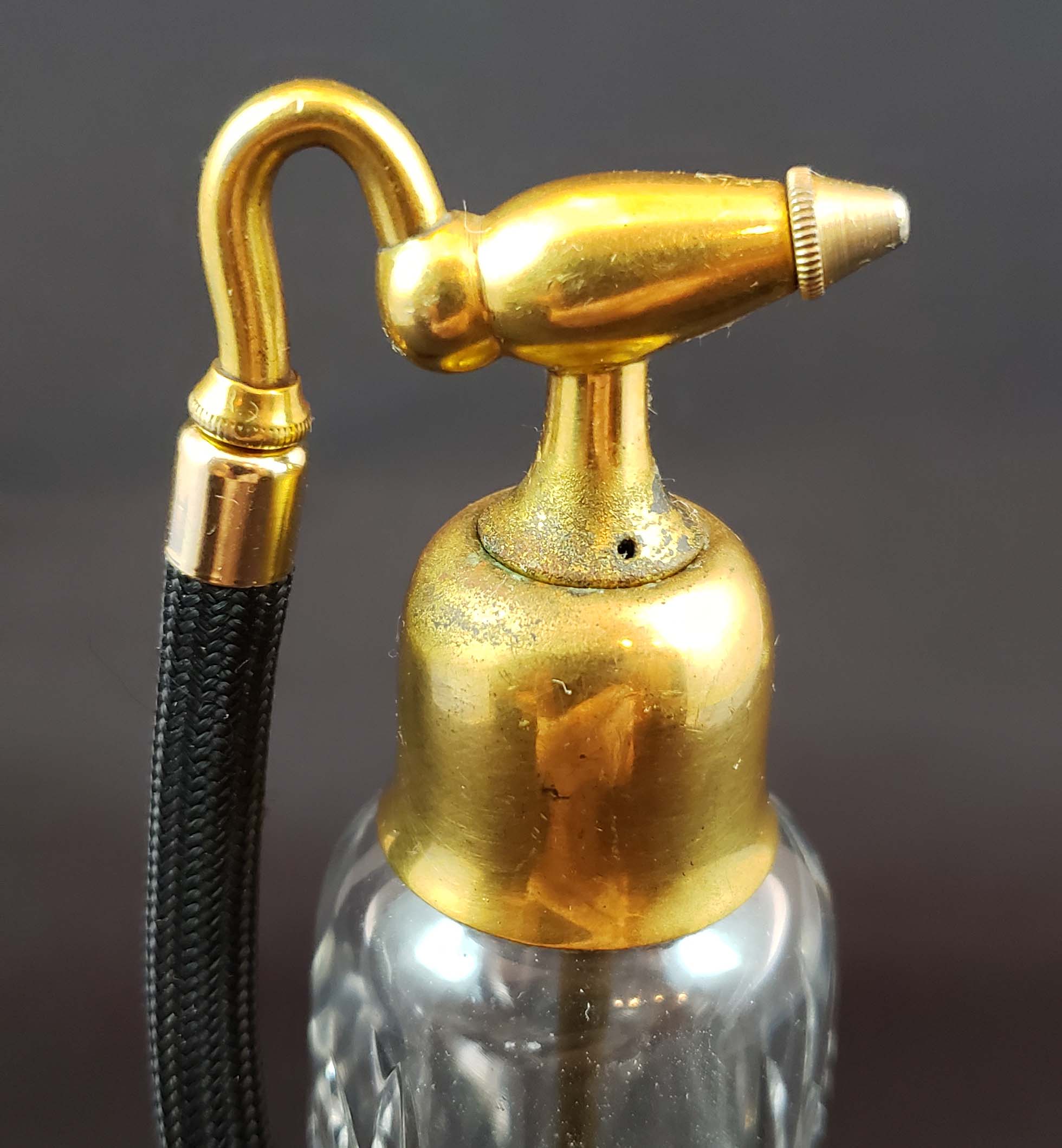 DeVilbiss Brilliant Cut "Perfumizer" perfume atomizer from 1920. Finely hand cut, polished and perfectly clear glass with no dings or scratches. Polished bottom. Gold-plated fittings in good condition, with some loss on the base of the spray fitting as shown. The ball and cord have been replaced, the siphon tube is in place and the atomizer works! Bottle is pictured in Mack-DeGraaf DeVilbiss book page 68. Height 6.5 inches.
