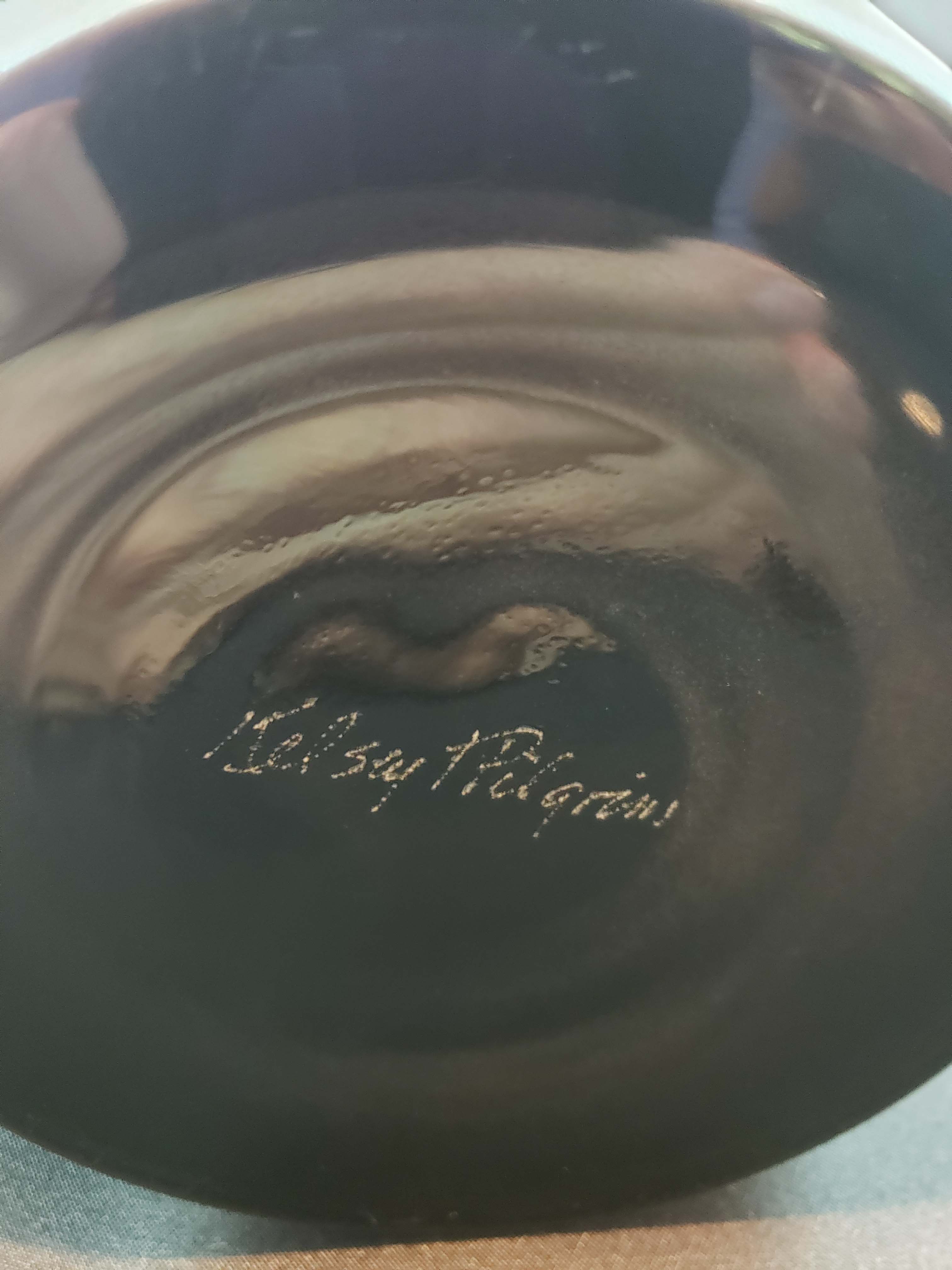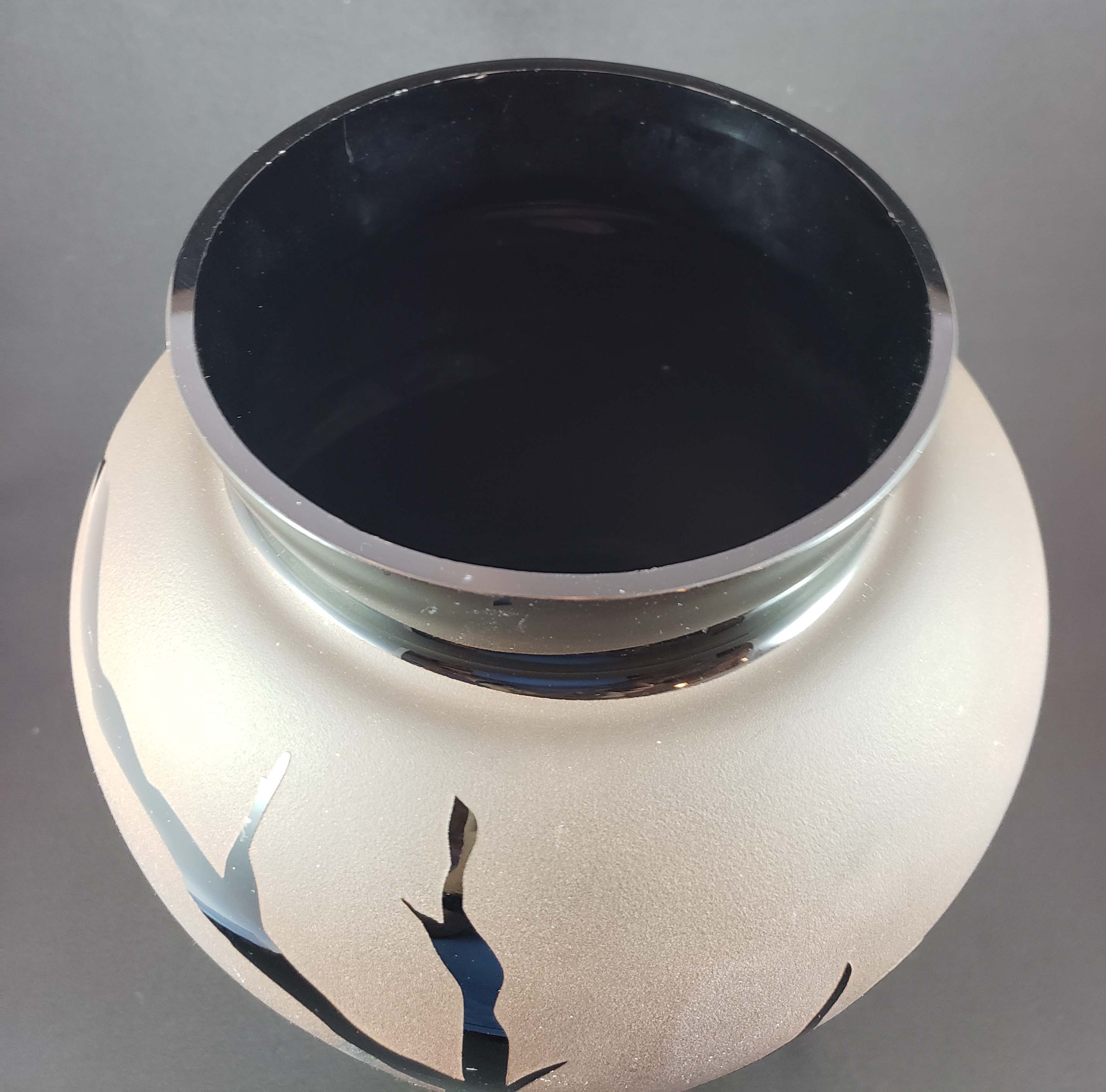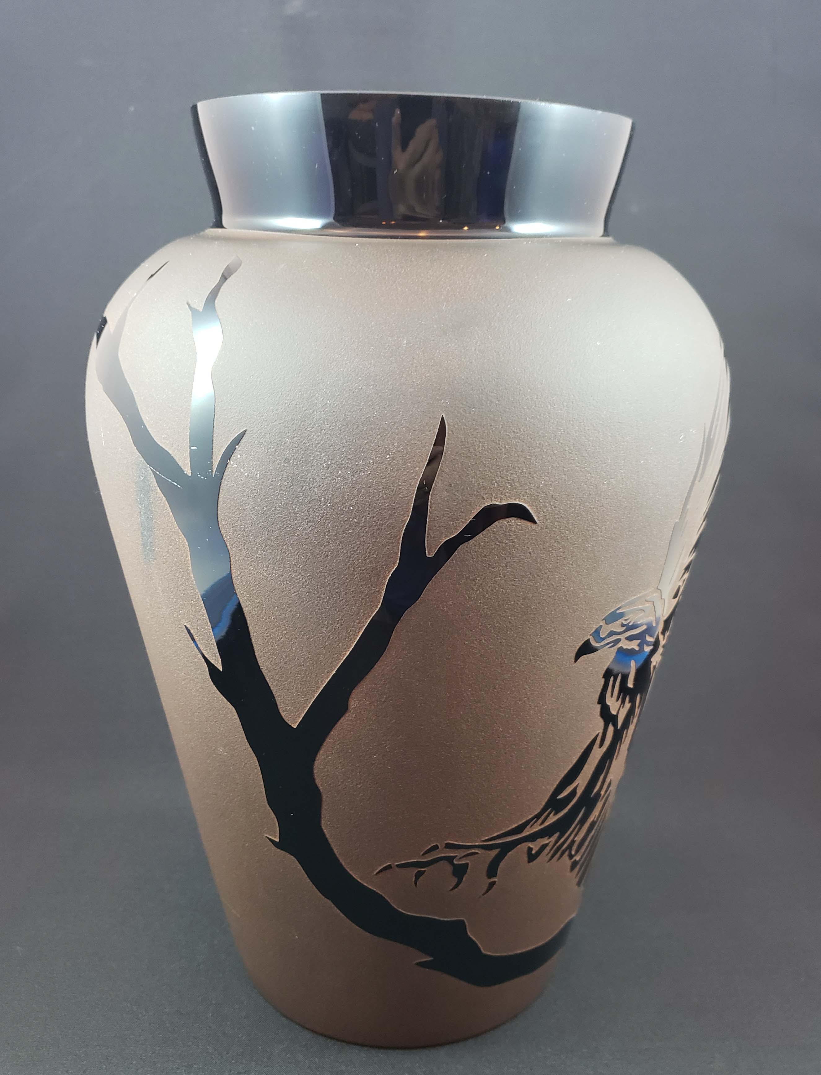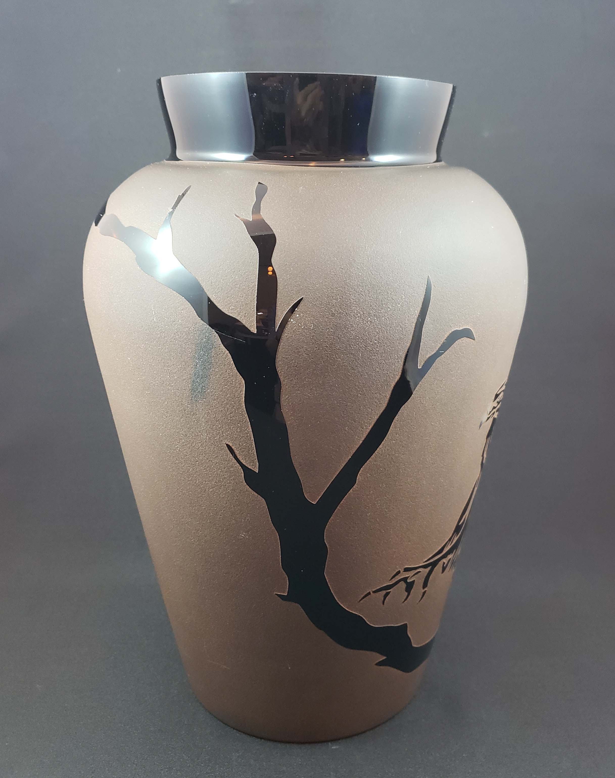 Kelsey/Pilgrim carved glass vase with an eagle and tree decoration in black glass relief against a brown background, by cameo glass artist Kelsey Murphy. Vase is 11.5 inches tall, 5 inches at the top opening and 5 inches at the base. Signed as shown in photo. Excellent condition.