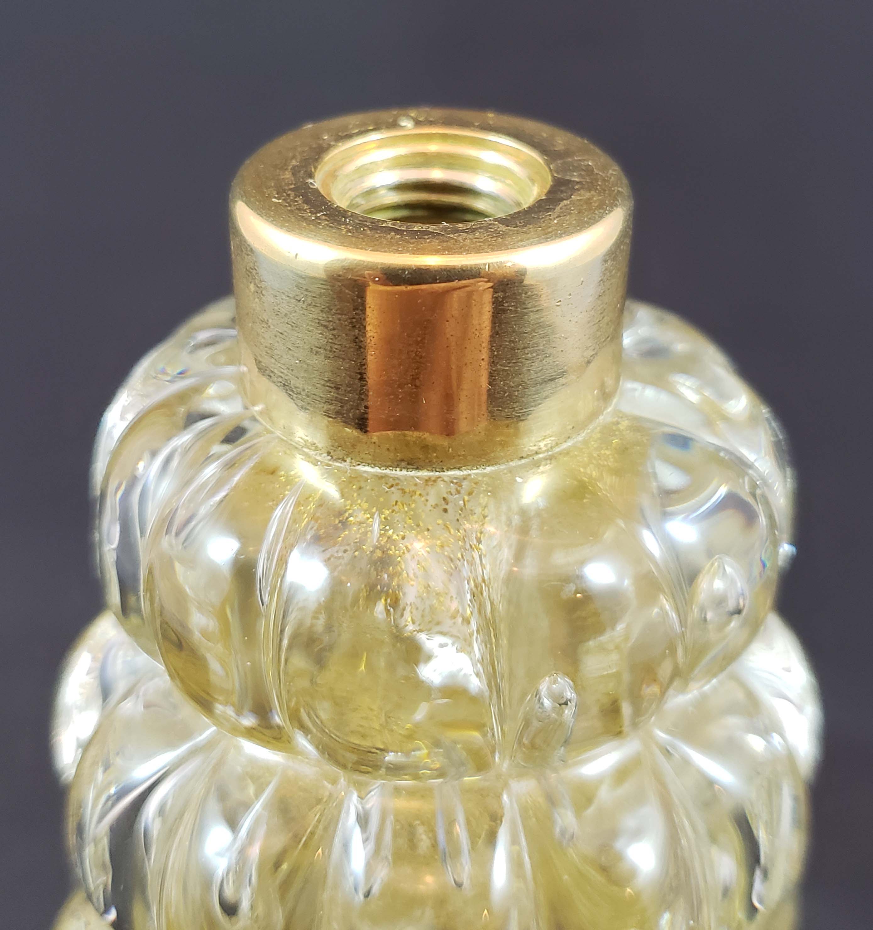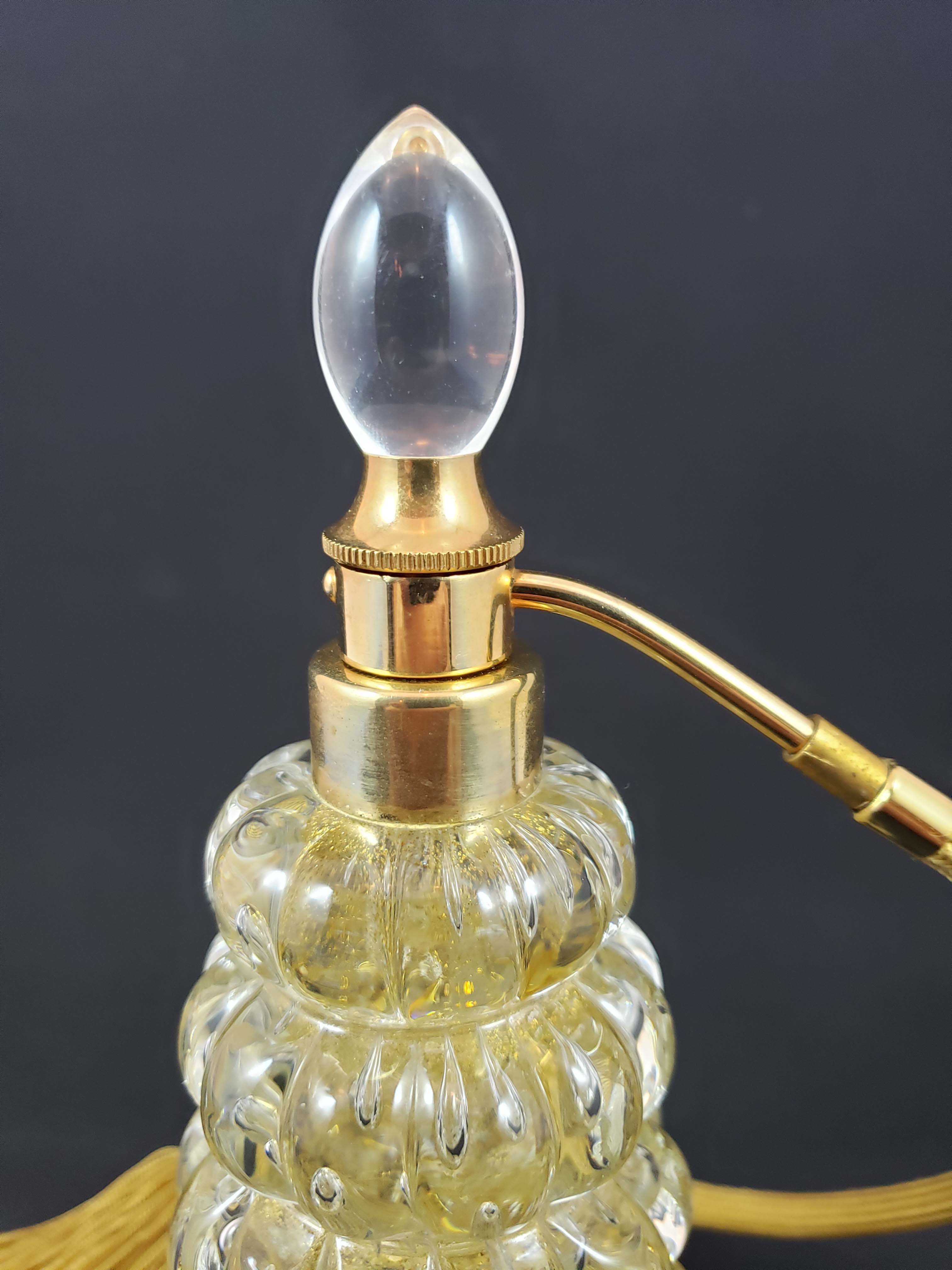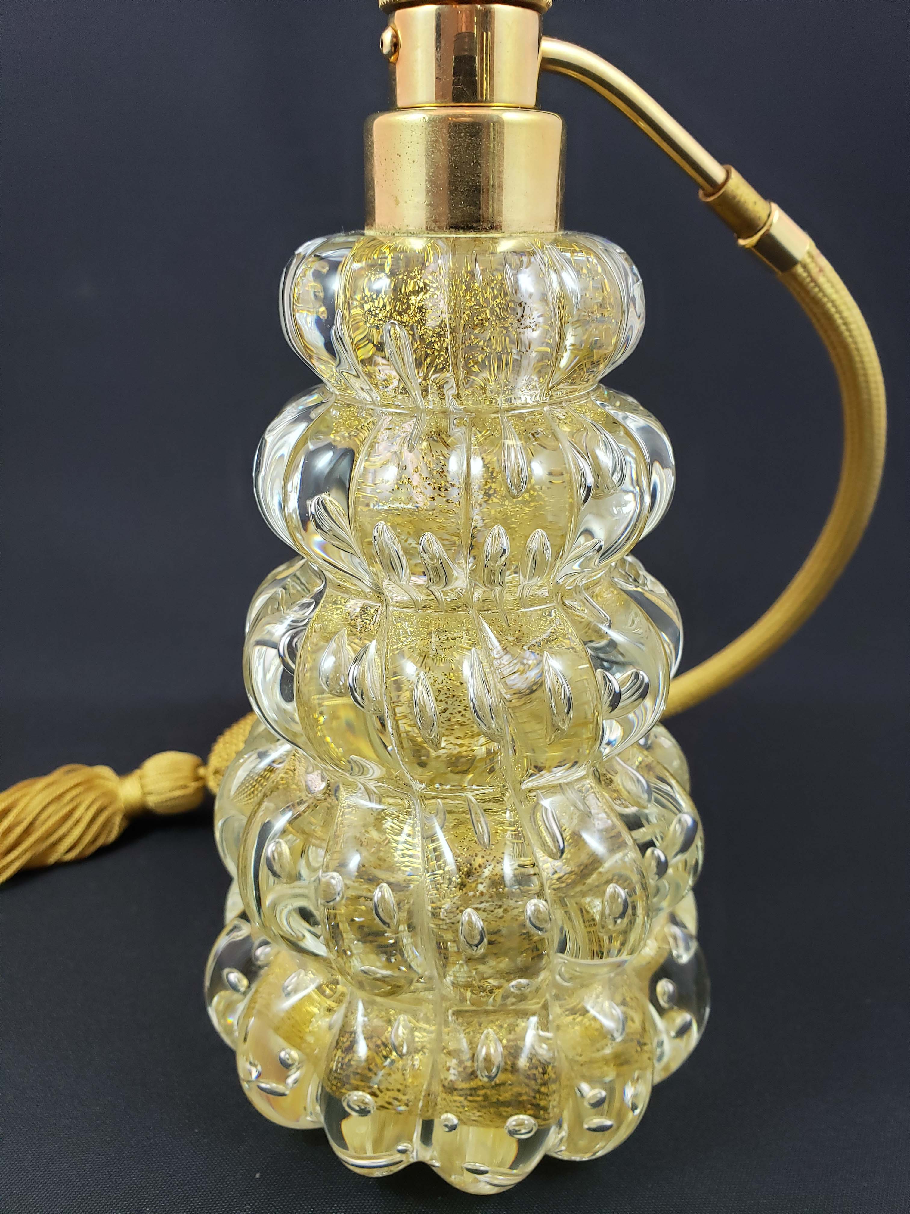 DeVilbiss Perfume Atomizer with bottle from Murano, Italy, circa 1953. Heavy clear cased glass with controlled bubbles and gold Aventurine flecks on the interior layer. Gold plated spray fittings with a Lucite jewel. The cord and ball are new. Original labels on bottom are illegible from wear. This bottle appears in the DeGraaf-Mack DeVilbiss book on page 273. In excellent condition with no issues on the glass, and no signs of wear on the gold plating. Height 7 1/4 inches to top of ornament.