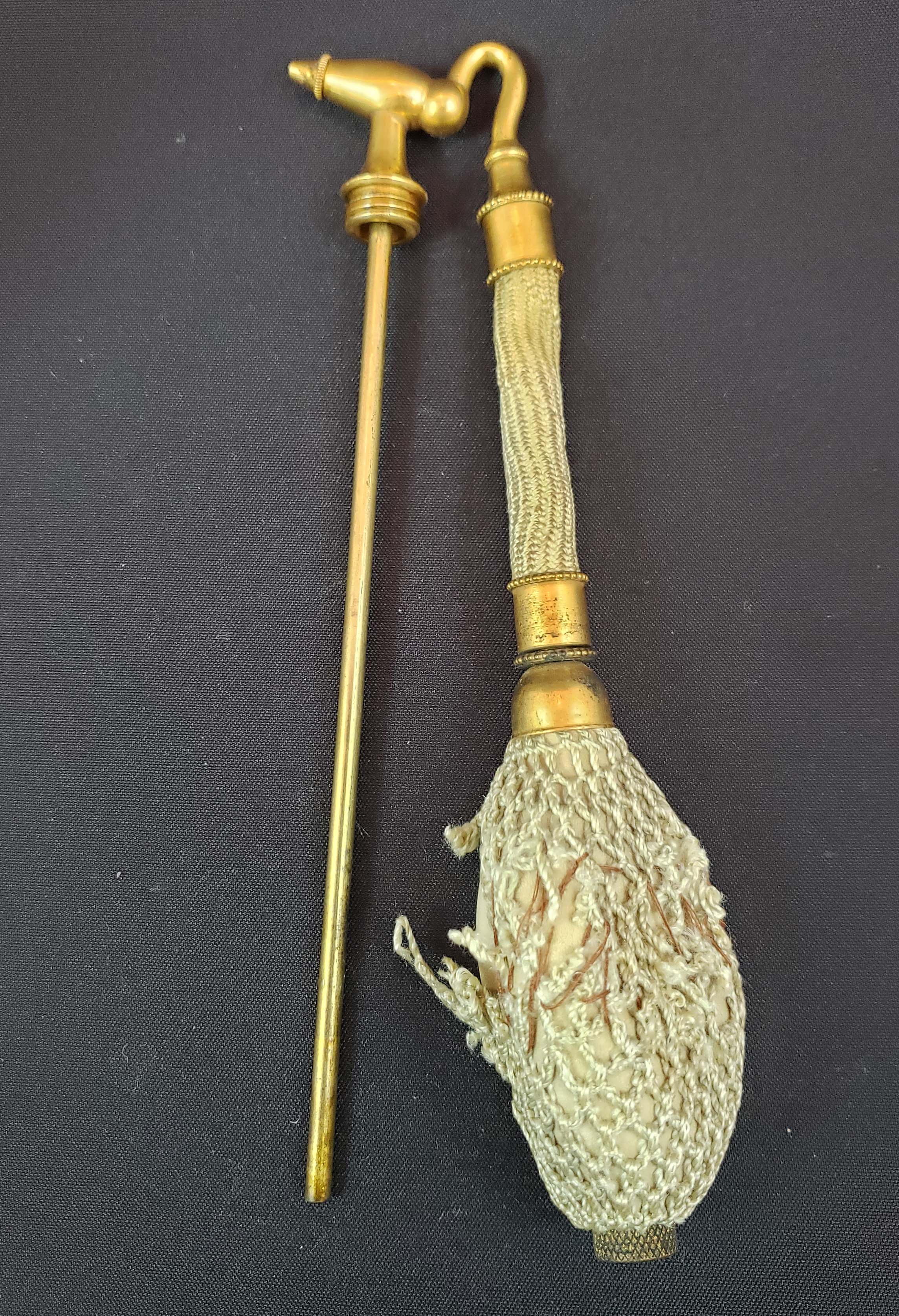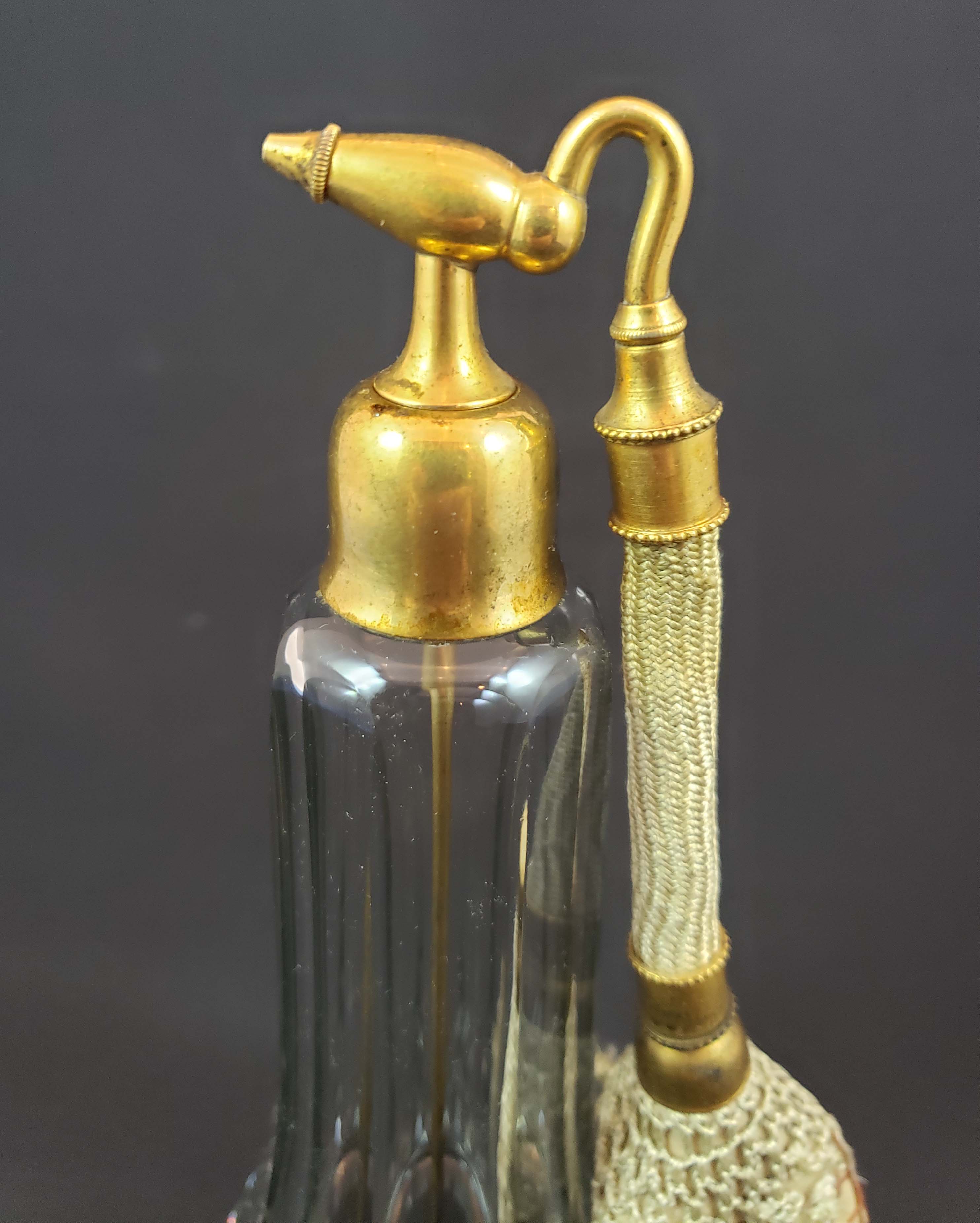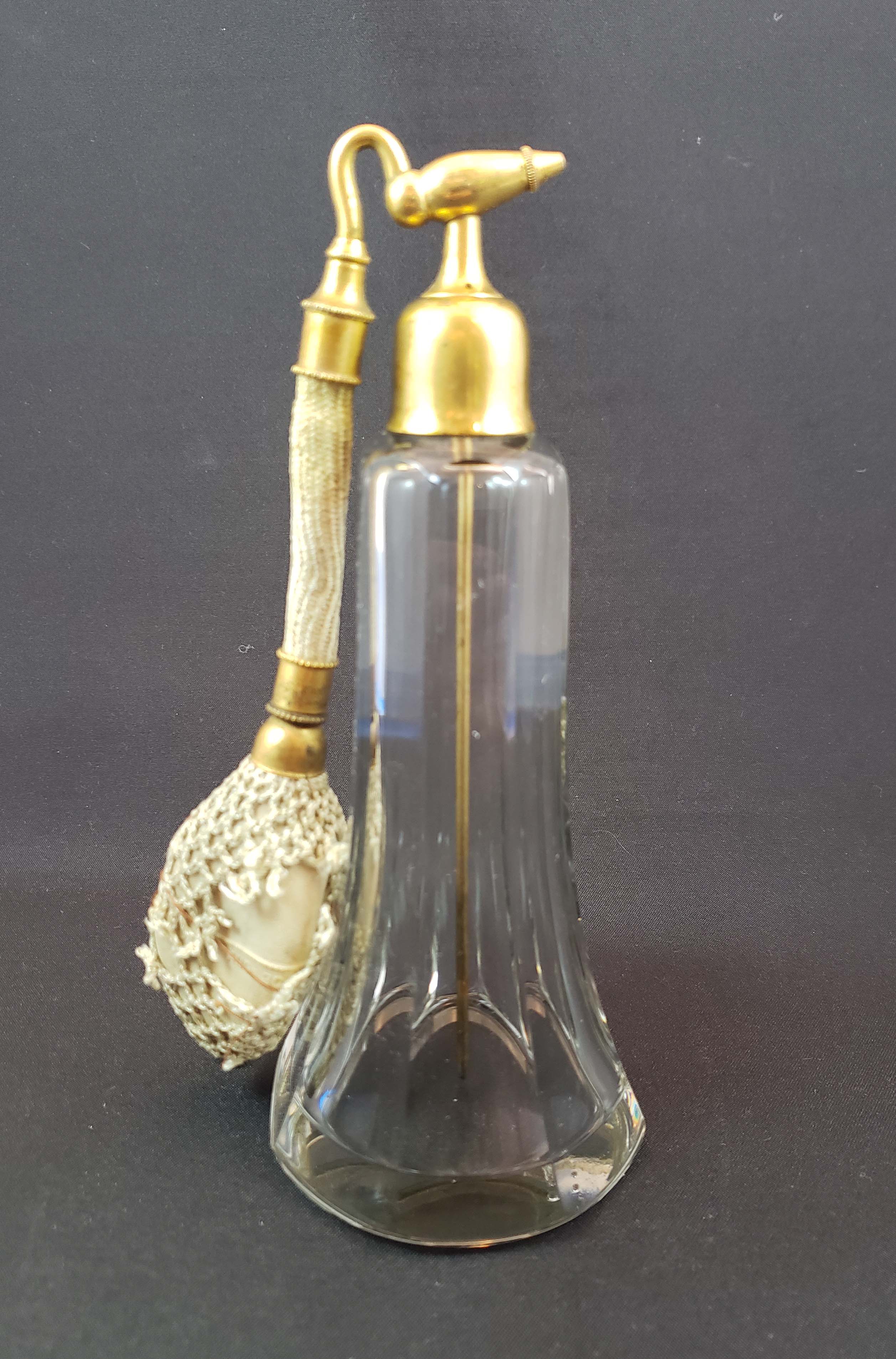 DeVilbiss "Perfumizer" perfume atomizer from 1920. Finely hand faceted, polished and beautifully clear glass with no chips or scratches. Polished bottom. Gold-plated fittings in excellent condition. The ball is original but hardened with the hand-crocheted gold silk netting torn in several places and stitched together as shown. The metal siphon tube is in place. Height 7 inches.