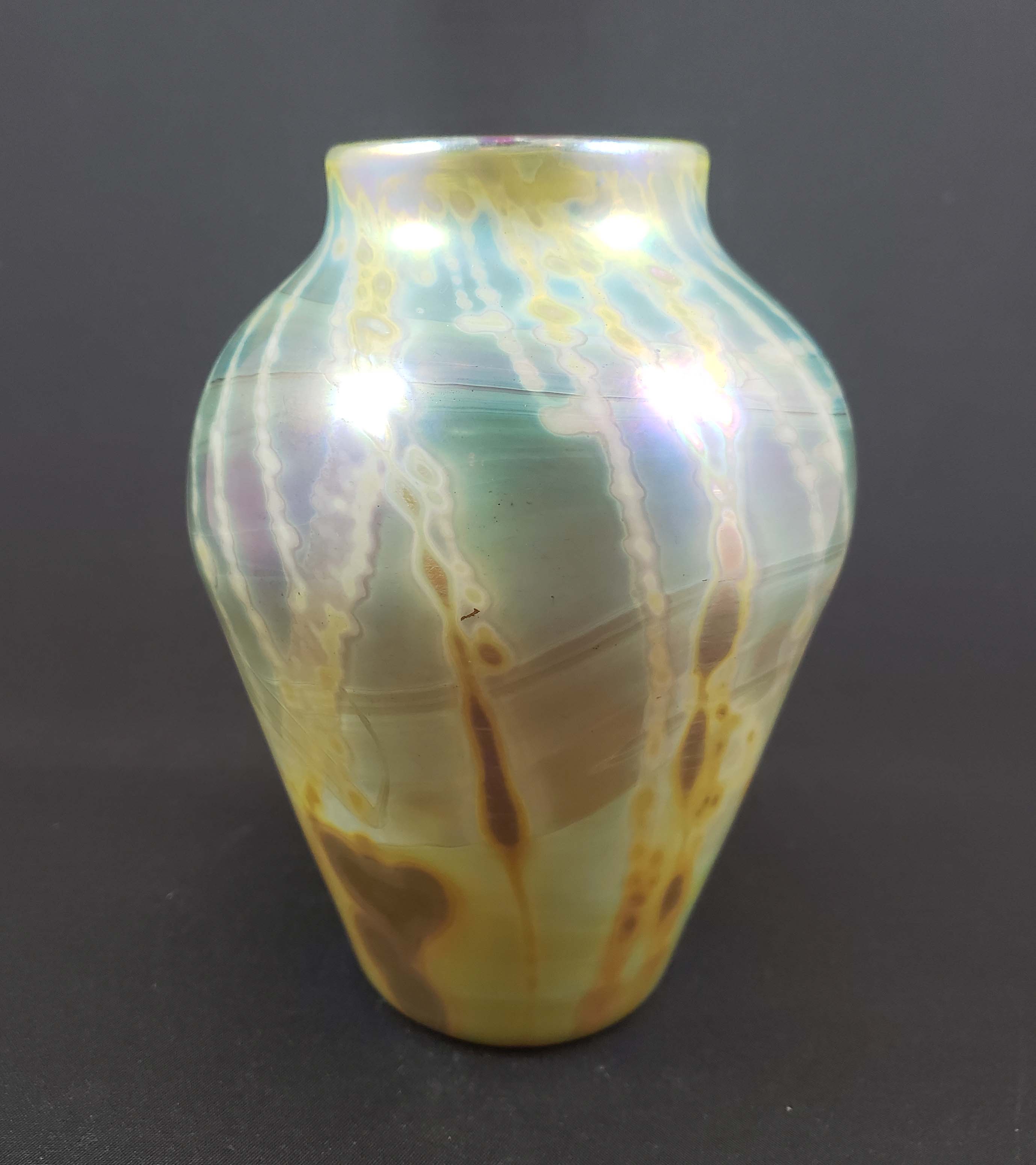 Studio Art Glass Vase by Correia and signed and numbered by Raymond Correia, number V-702-4 from the 1980s. Opalescent and iridized with muted amber and blue tones and pulled lines. Also features a Correia paper label on bottom. Dimensions 6 inches tall and 4 inches at the widest point. Wonderful example of unique studio art by this famed art glass house.