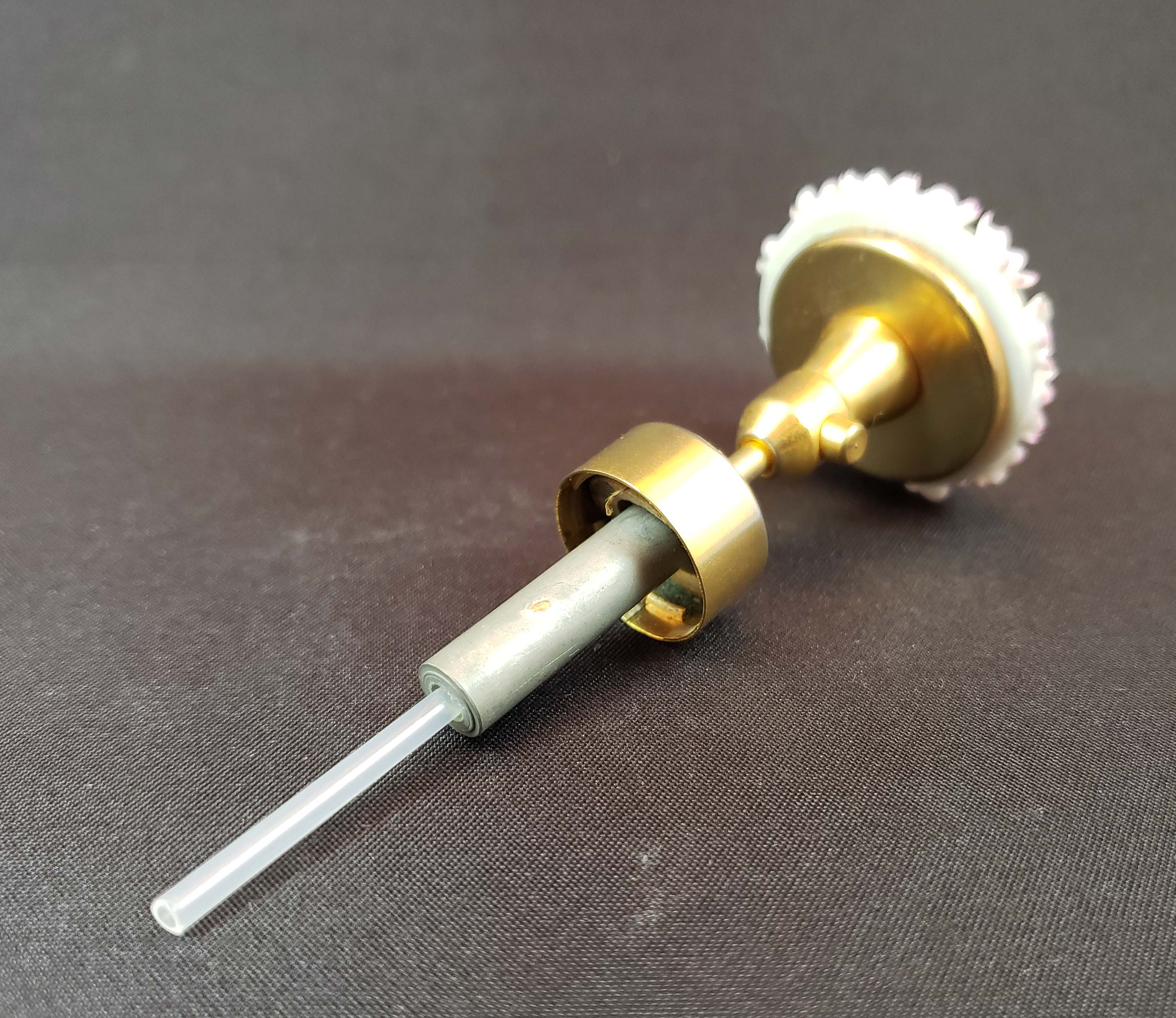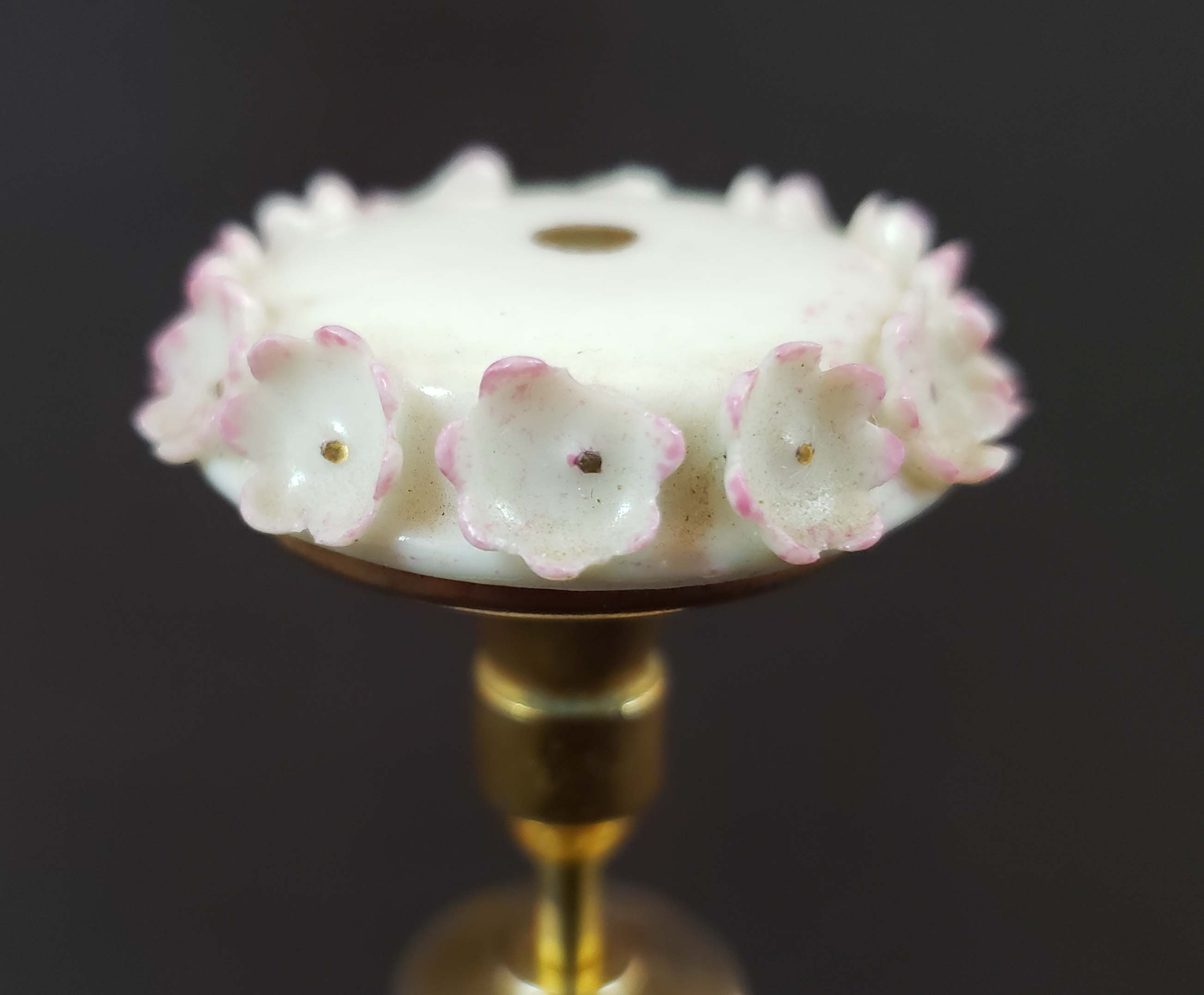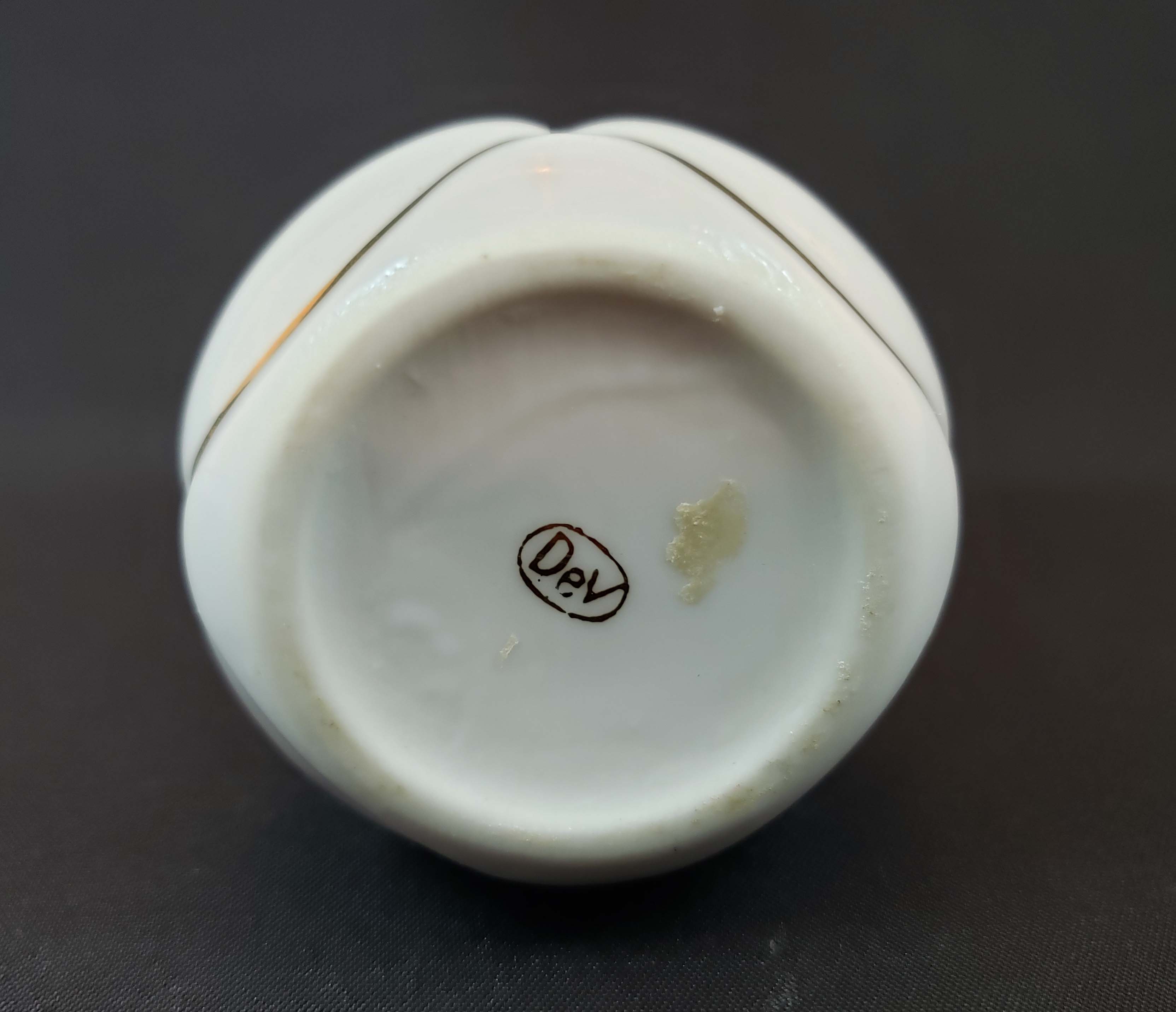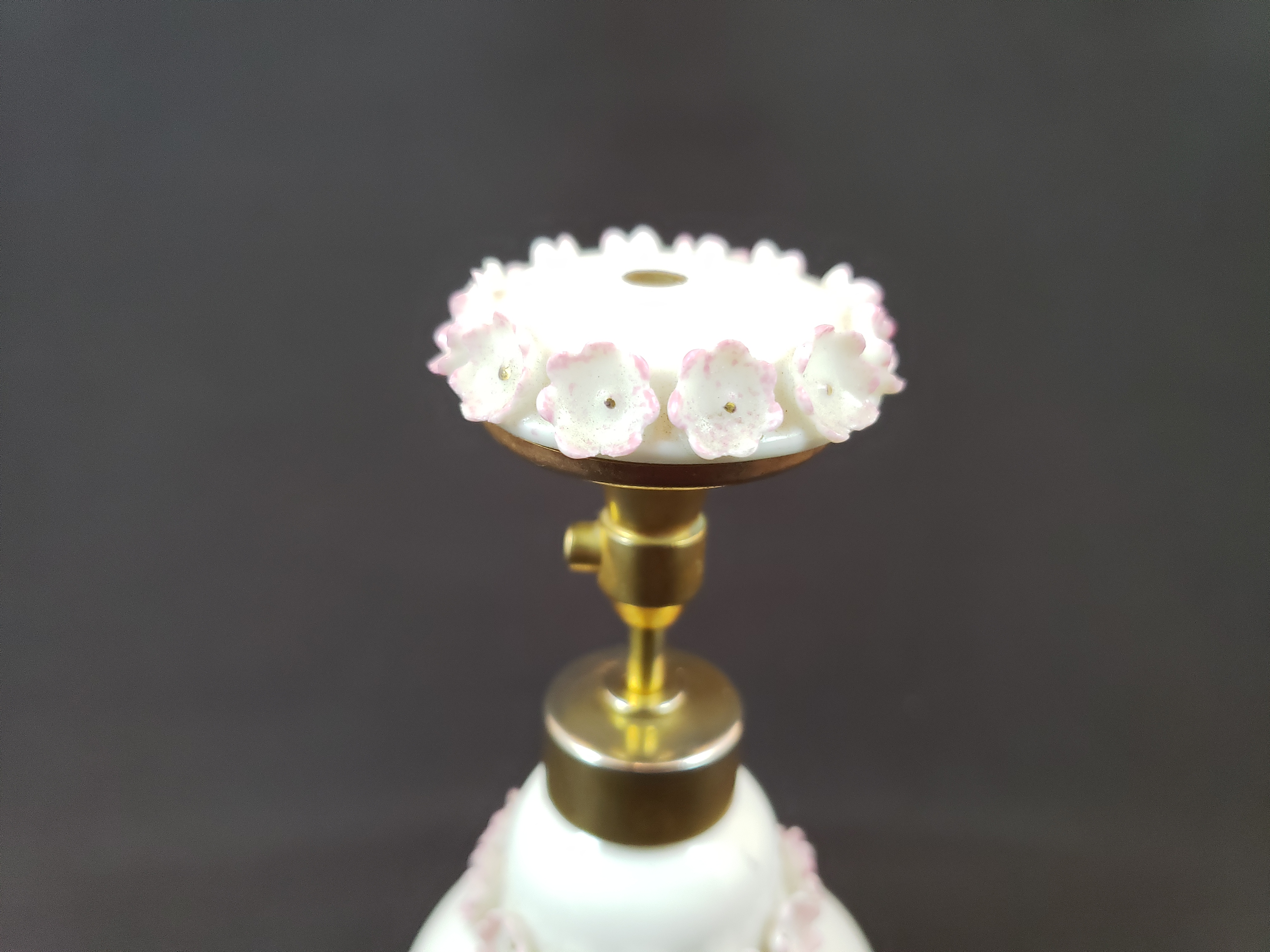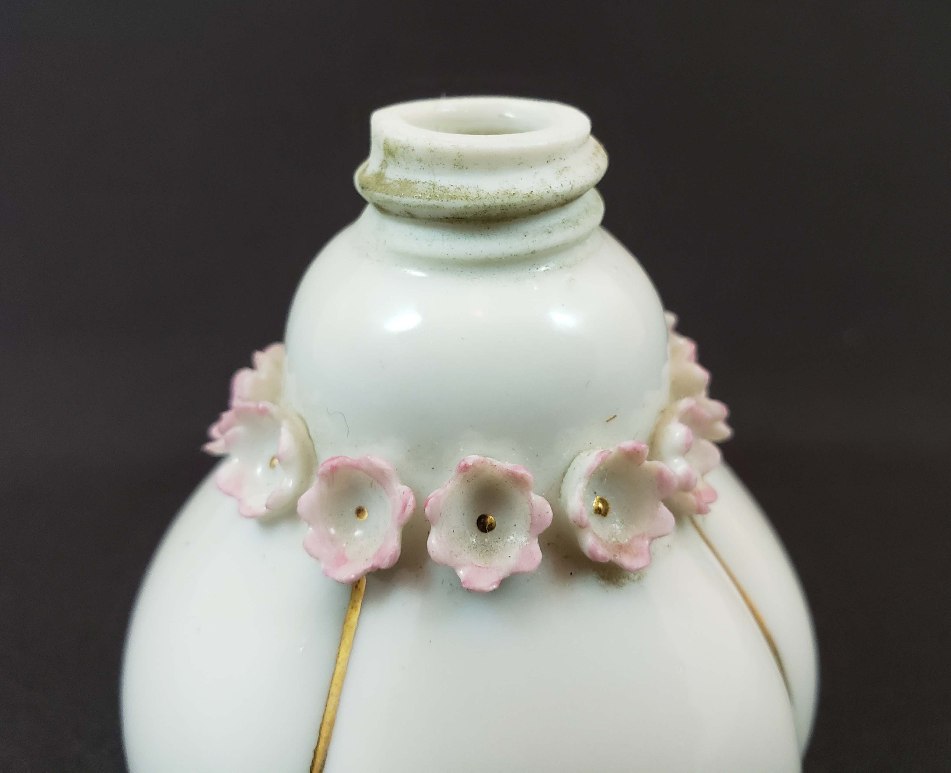 DeVilbiss Perfume Atomizer in white porcelain with applied pink flower petals on the bottle and the plunger. gold enamel decoration and gold-plated plunger-type spray fittings. Model S250-65 from 1958 line. In excellent seldom if ever used condition, with all flower petals present although two on plunger with one petal missing - hard to see. Gold plating in good condition. Pictured in DeGraaf-Mack DeVilbiss book on page 281. Stands 4 1/4 inches tall. Marked "DeV" in gold on bottom.