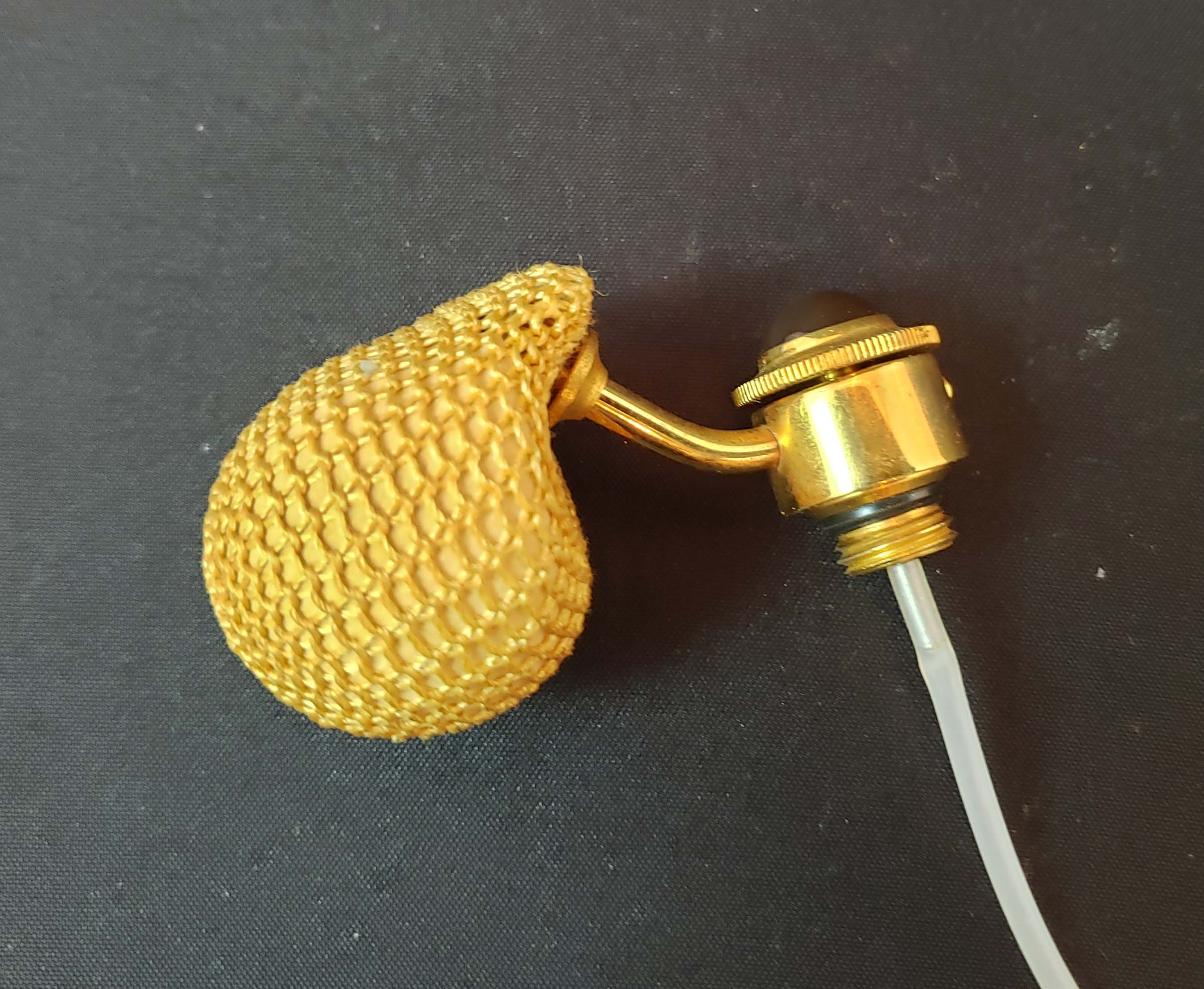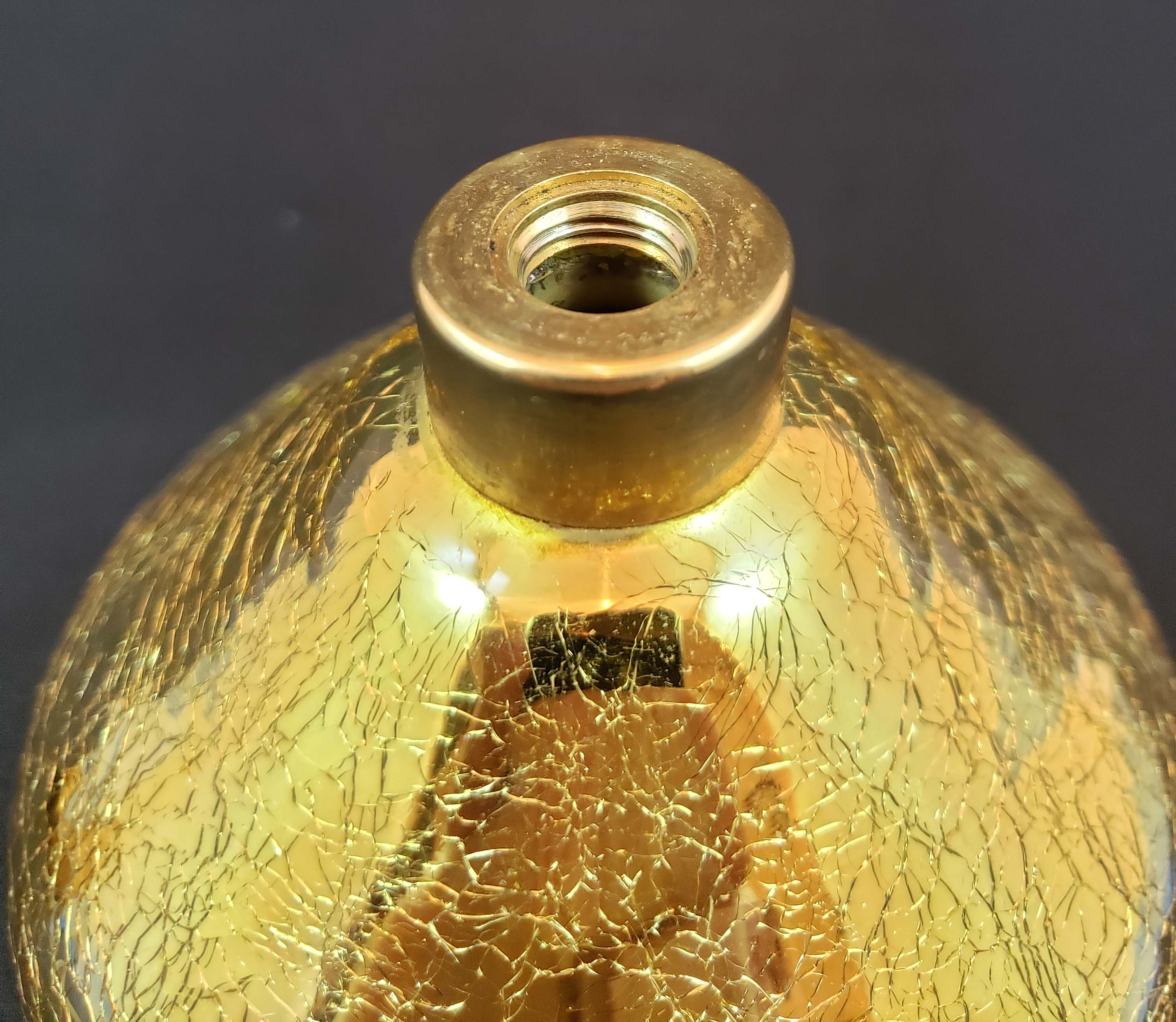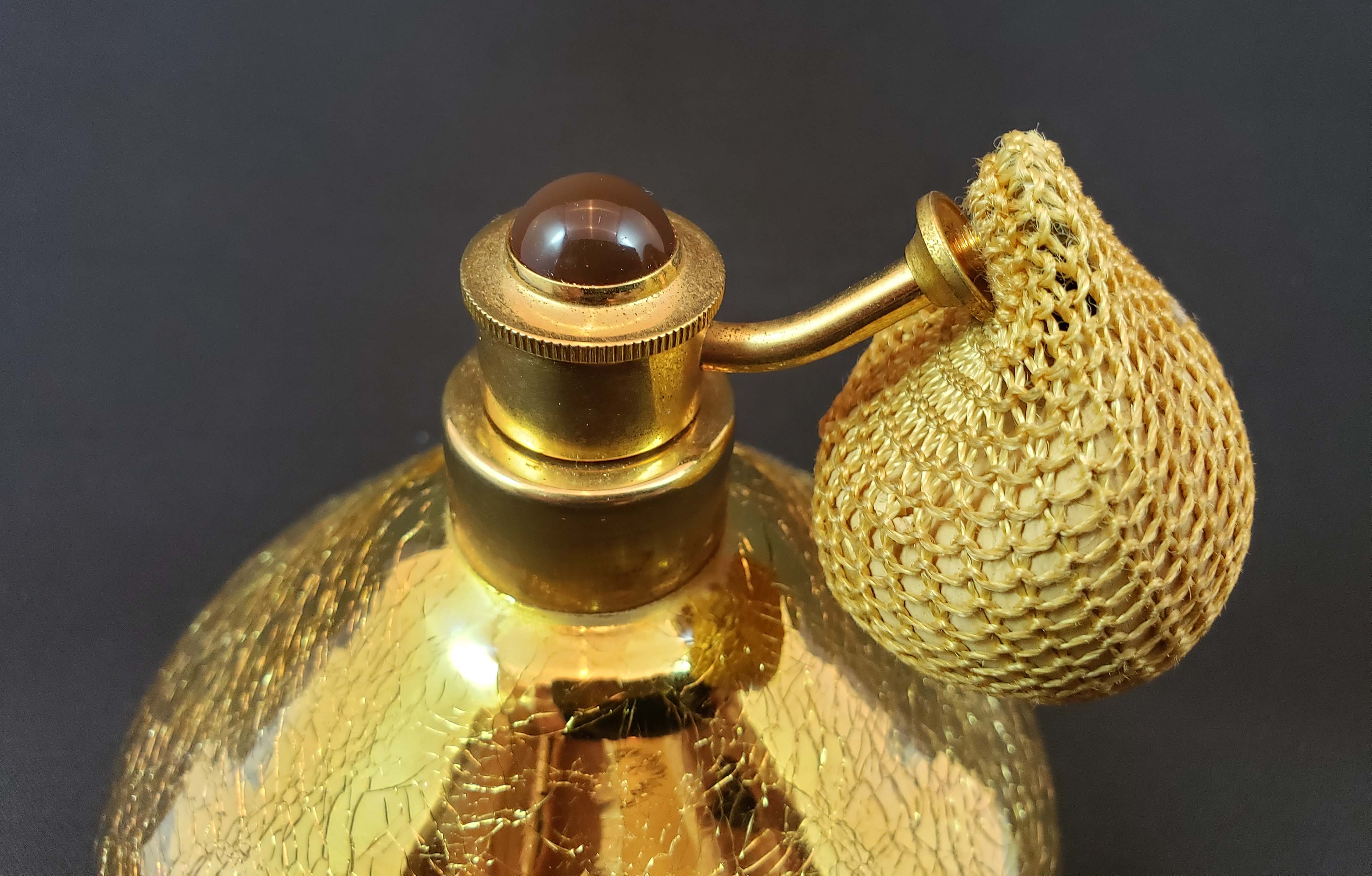 DeVilbiss Perfume Atomizer - Model S595-13 gold crackle bottle and gold plated spray fittings with from 1956. Closure spray top with tiger eye jewel on top. In excellent condition, except squeeze ball has hardened and detached from the spray tube - it's held in place by the netting. This bottle is pictured in the DeGraaf-Mack DeVilbiss book on page 276. Stands 3 1/2 inches tall.
