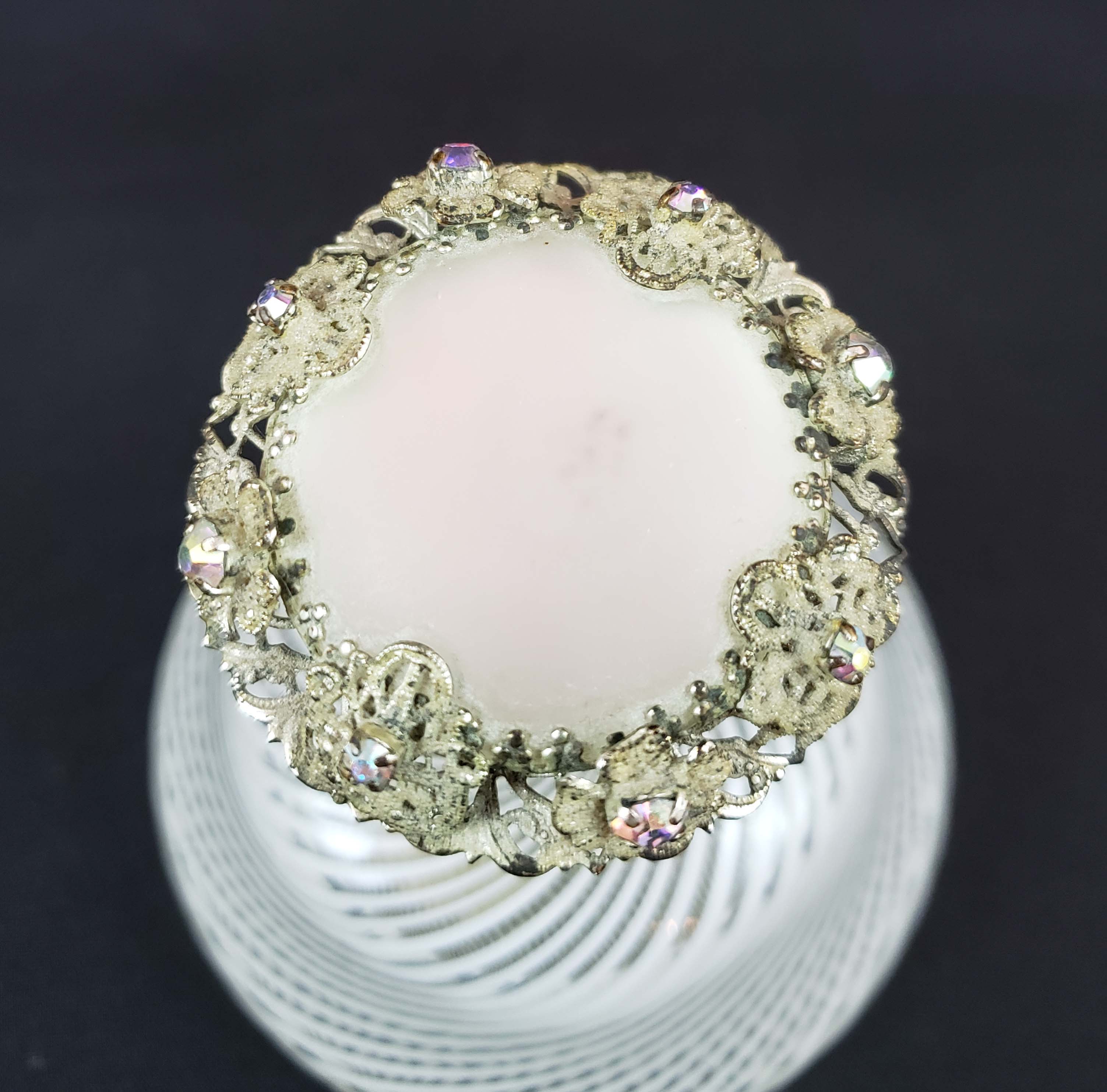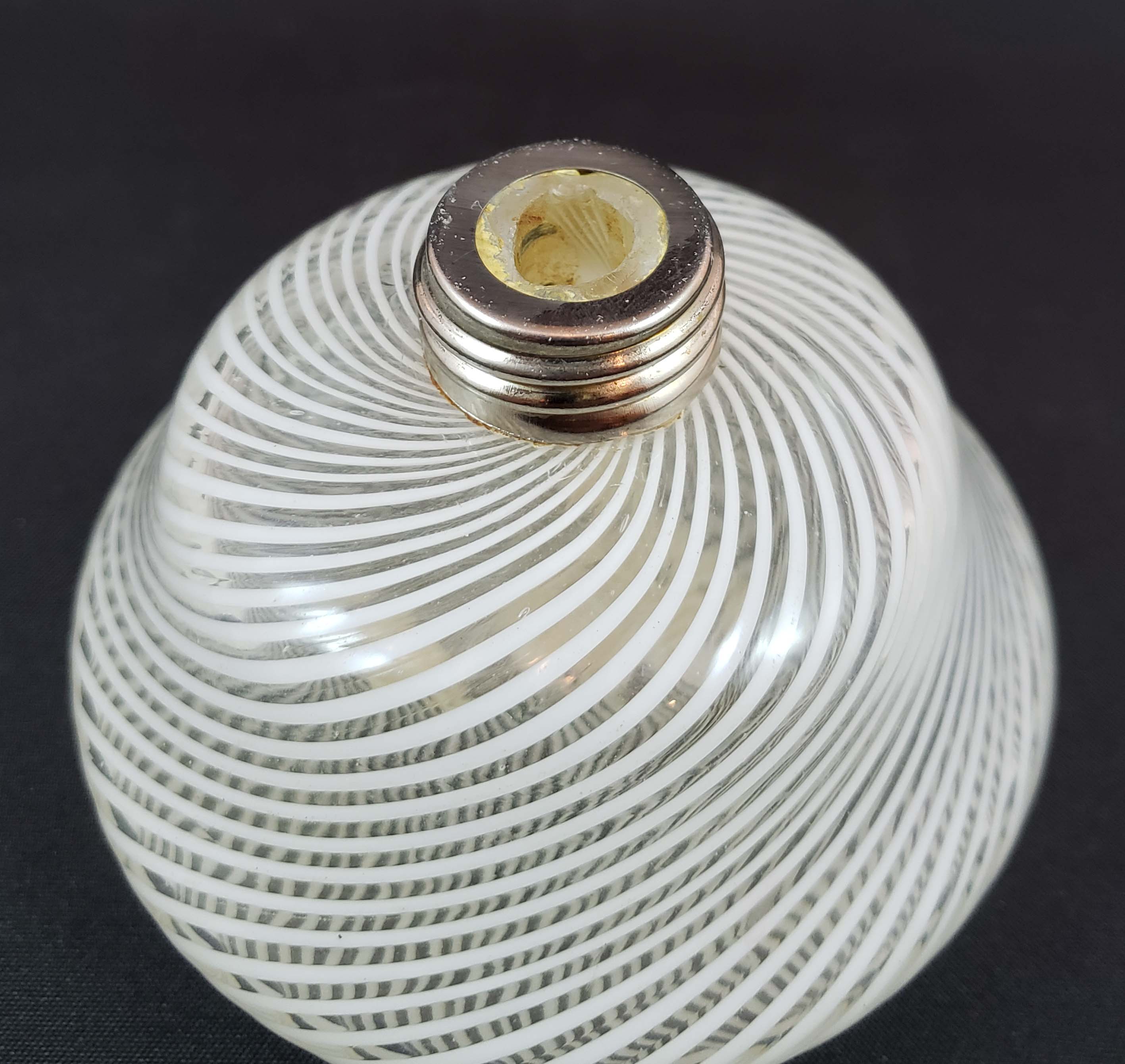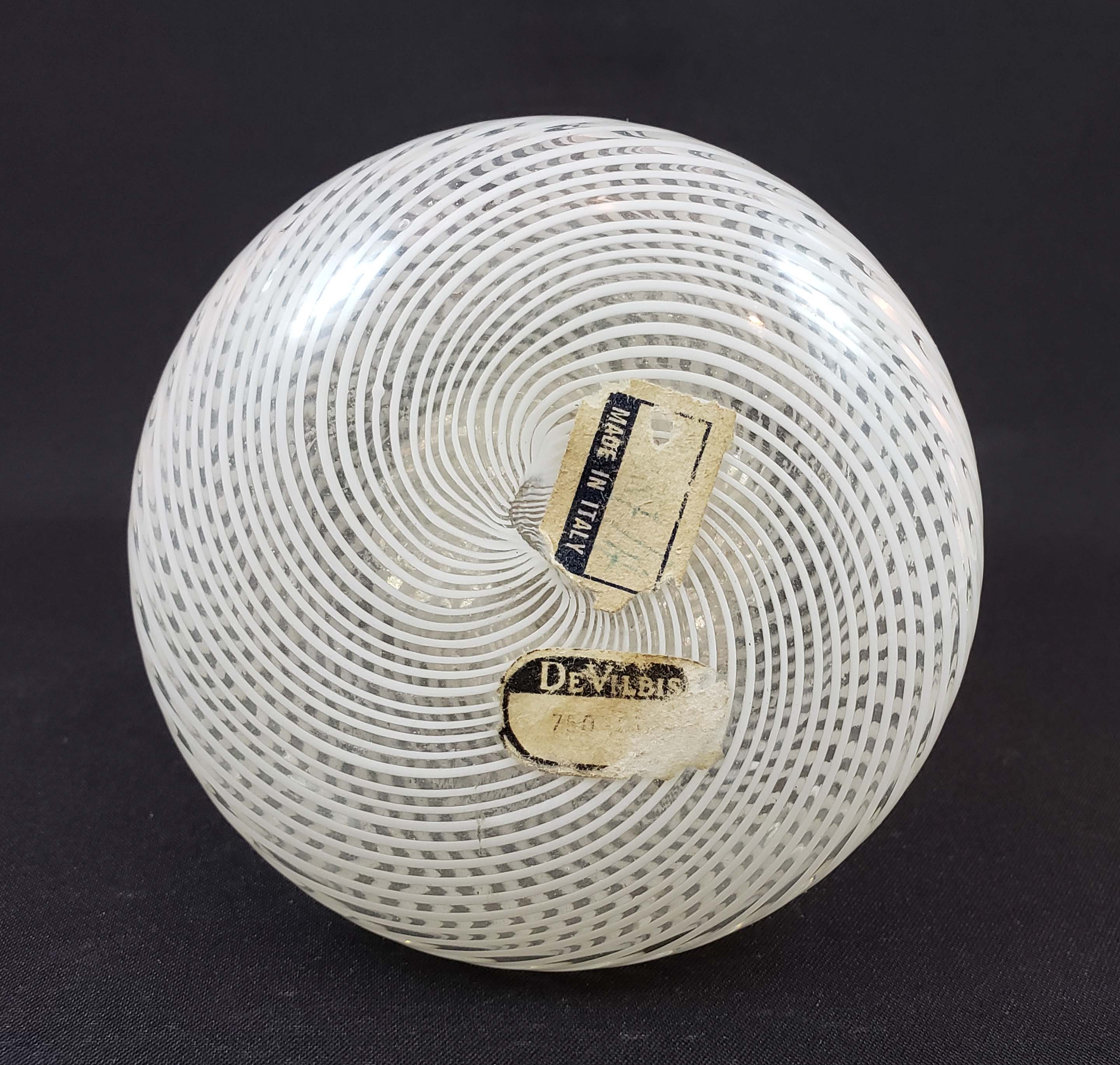DeVilbiss Perfume Atomizer with bottle by Toso, famed art glass house of Murano Italy from 1963. DeVilbiss Catalog number 750-51. The bottle is White Filigree Swirl on clear glass. Jeweled top with opaline glass center - all jewels in place, set in filagree settings. Nickel-plated metal spray fitting. Labels on bottom as shown in photos. In excellent condition with no issues in the glass or fittings. 4 inches tall.