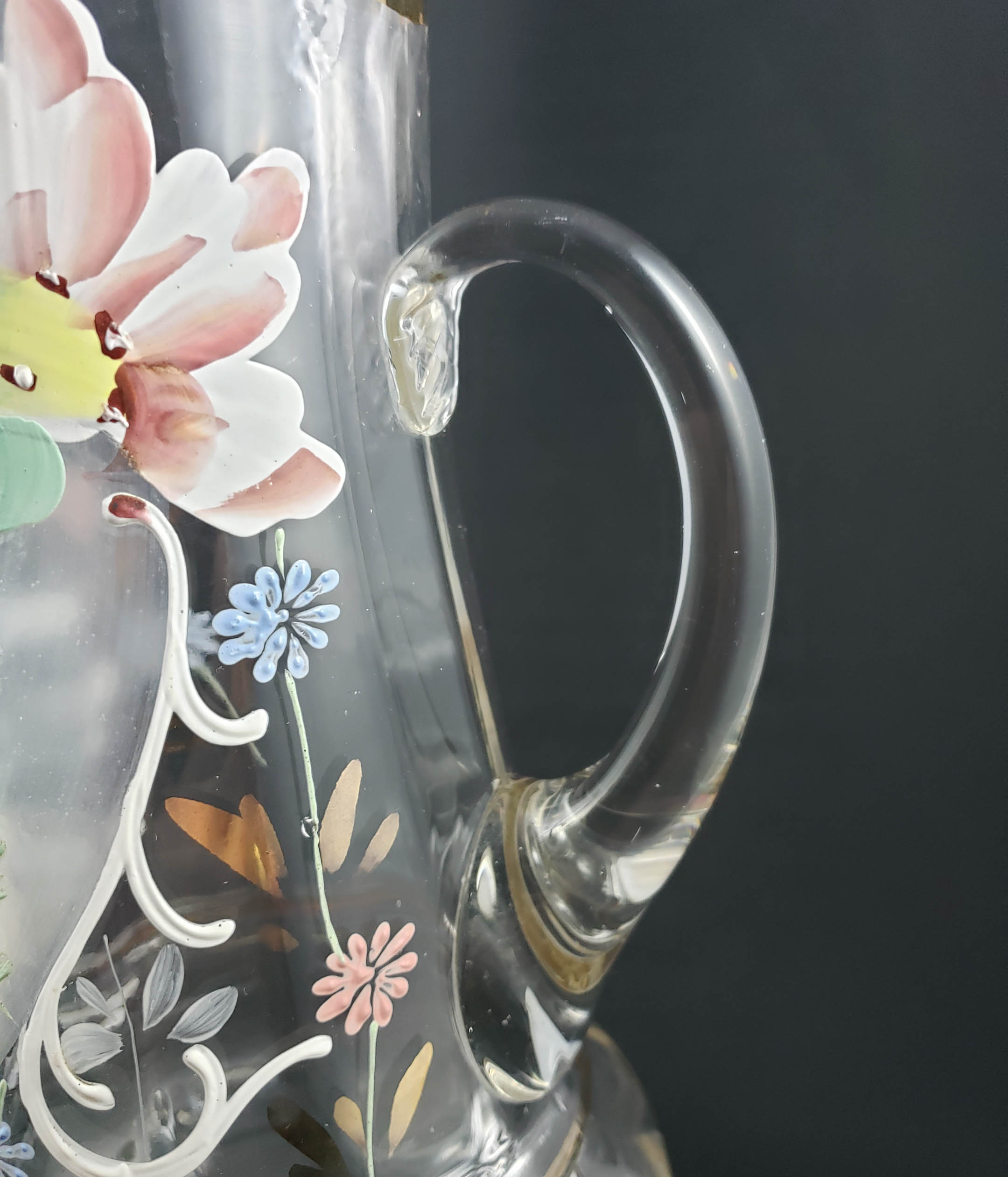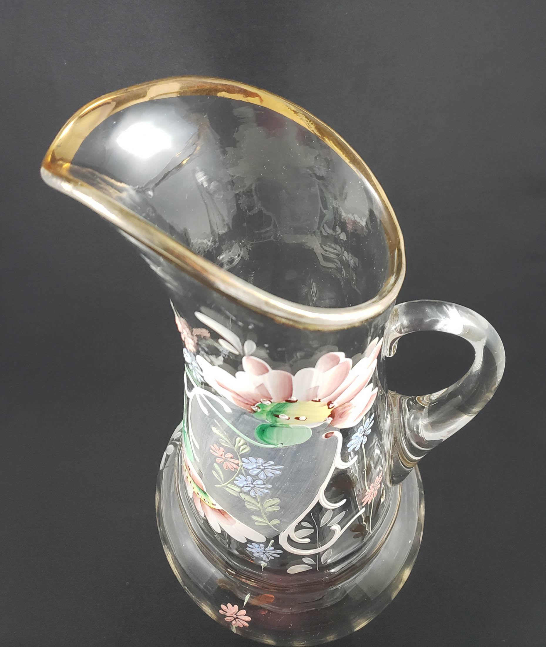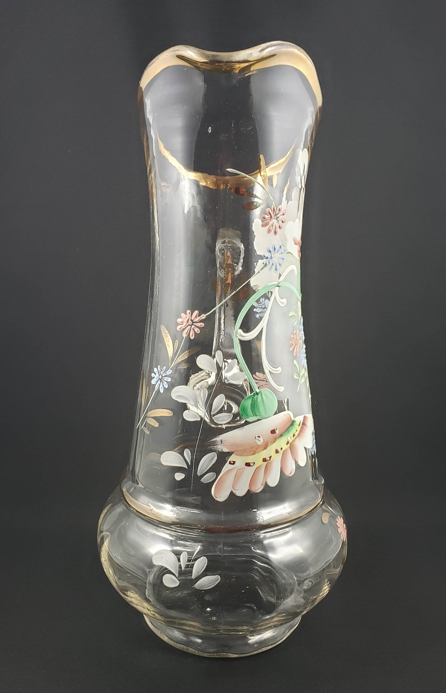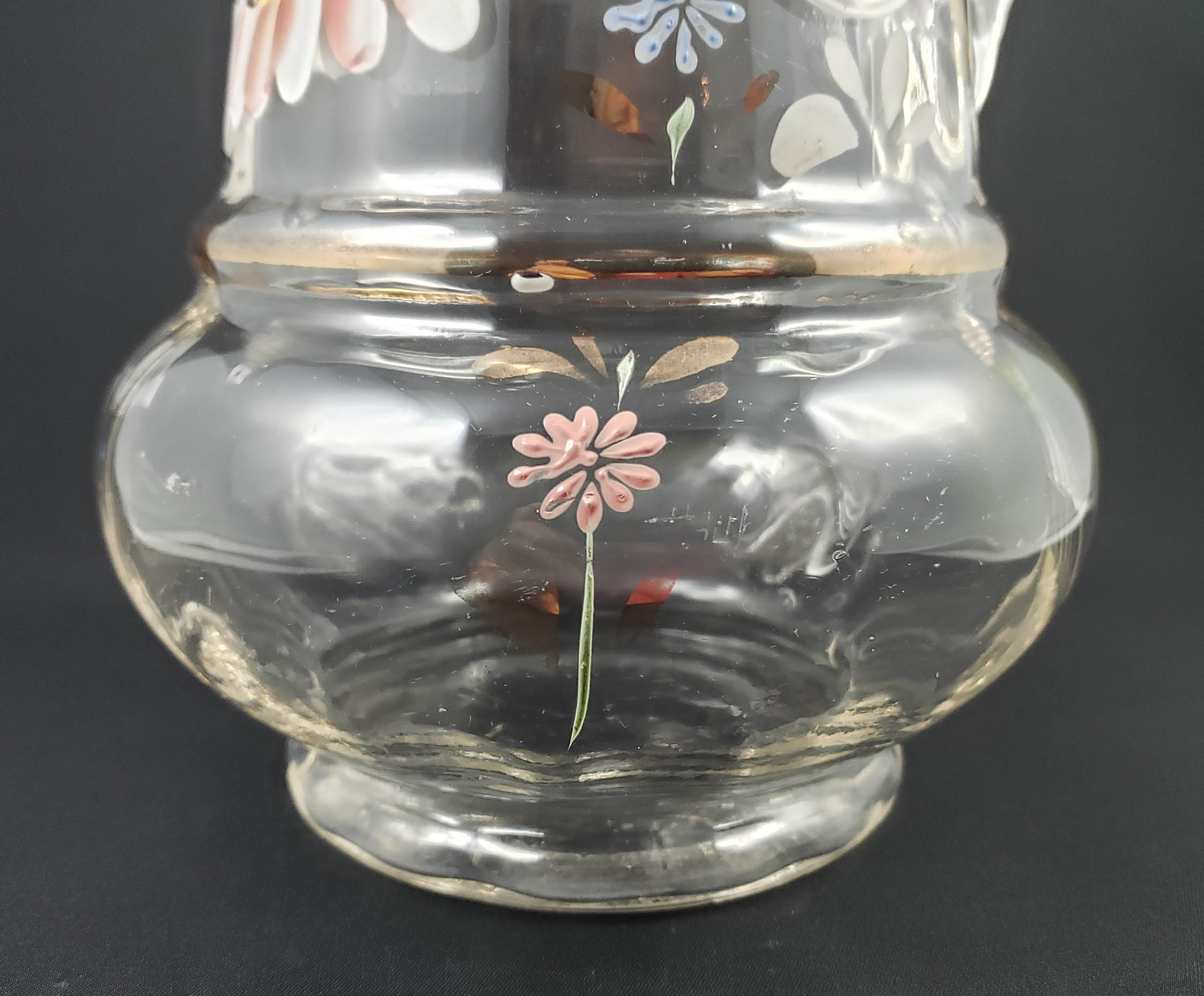 Elegant tall (13 inch) clear glass jug with elaborate hand-enameled floral decoration and gold enamel trim. Northwood Glass Company of Wheeling, WV circa 1920. It is mold-blown with a rib optic on the base. The rim is trimmed with gold enamel to which there is little or no wear. The pitcher is in excellent condition with no chips, cracks or scratches to handle or jug. The enamel decoration is also in excellent condition. Examples can be seen in the Oglebay Glass Museum in Wheeling, West Virginia.