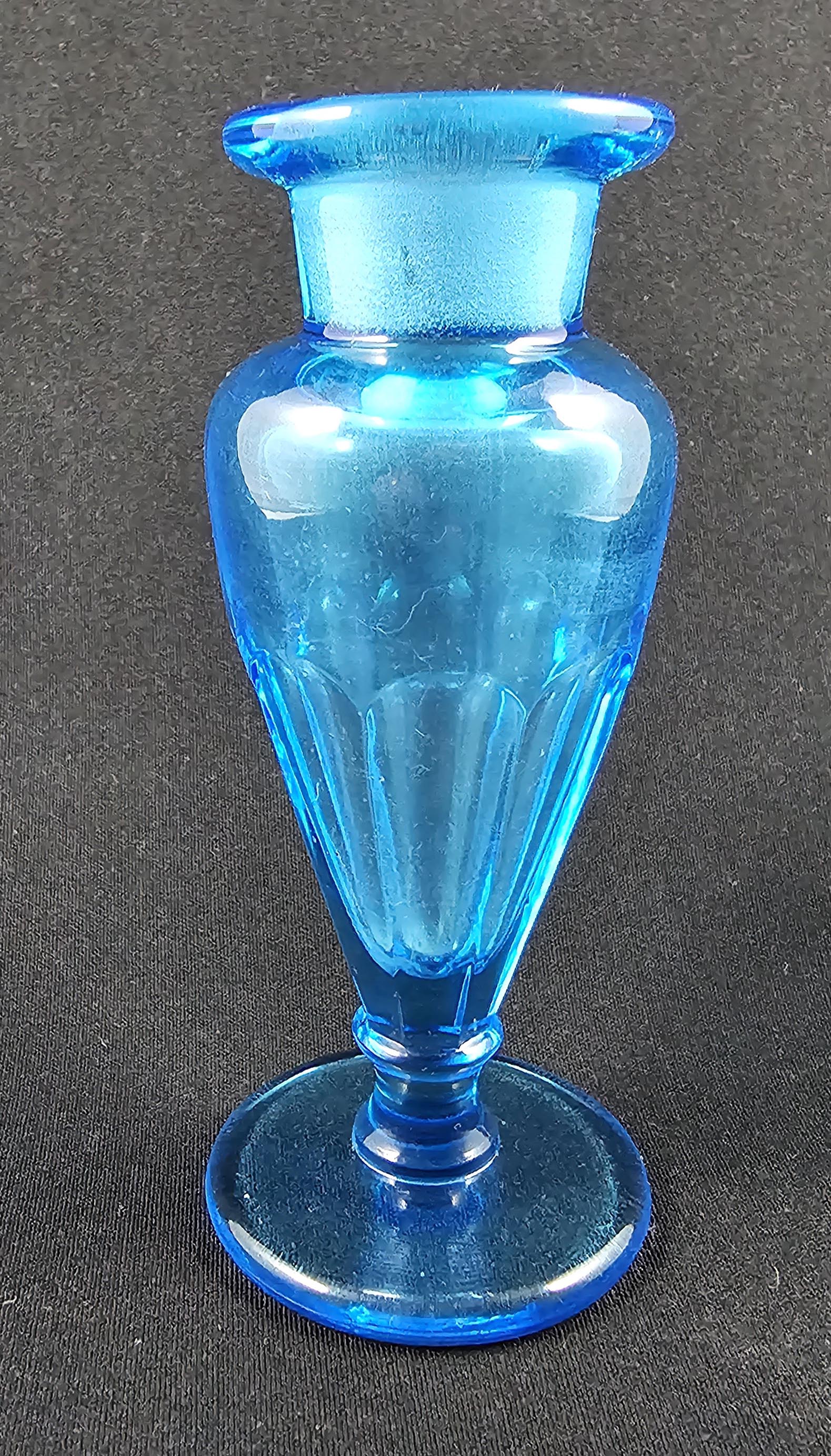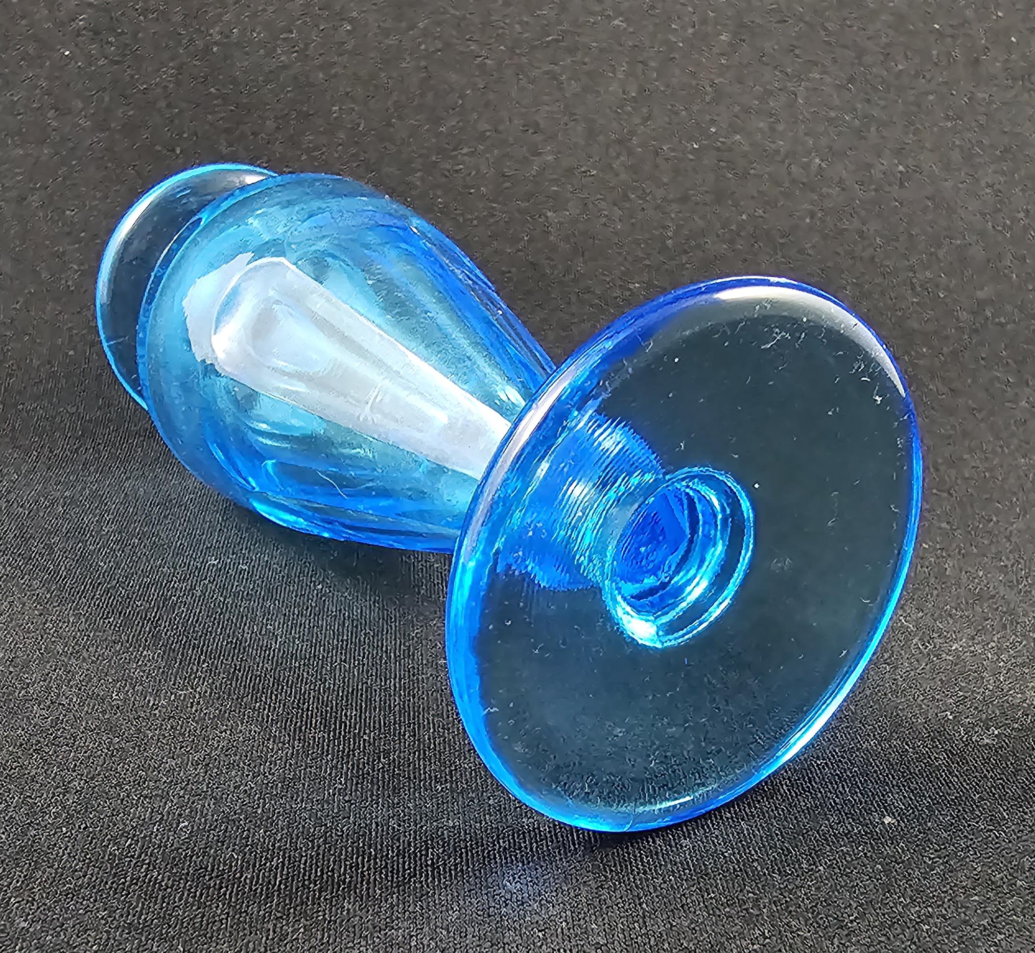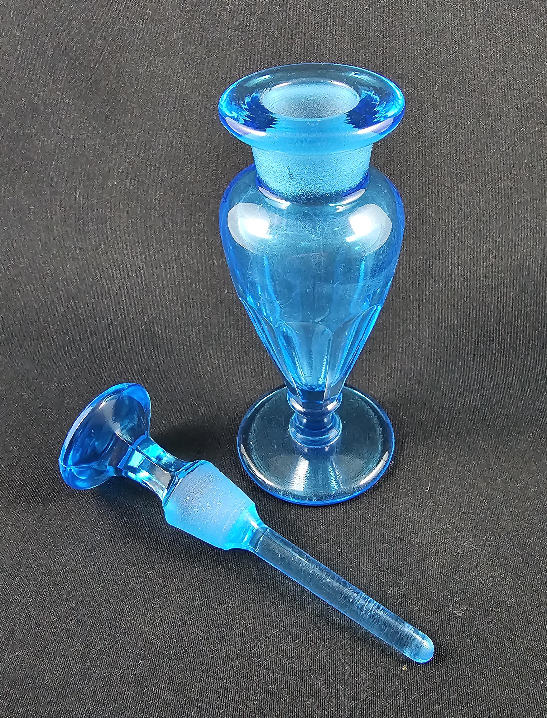 Paden City perfume dropper or dauber bottle from the mid 1920s. Catalog #501-4 from 1920s catalog reprints. Brilliant blue color with ground-in stopper. Dropper rod is perfect. Excellent overall condition with no chips, cracks, scratches or cloudiness. 5 1/2 inches tall.